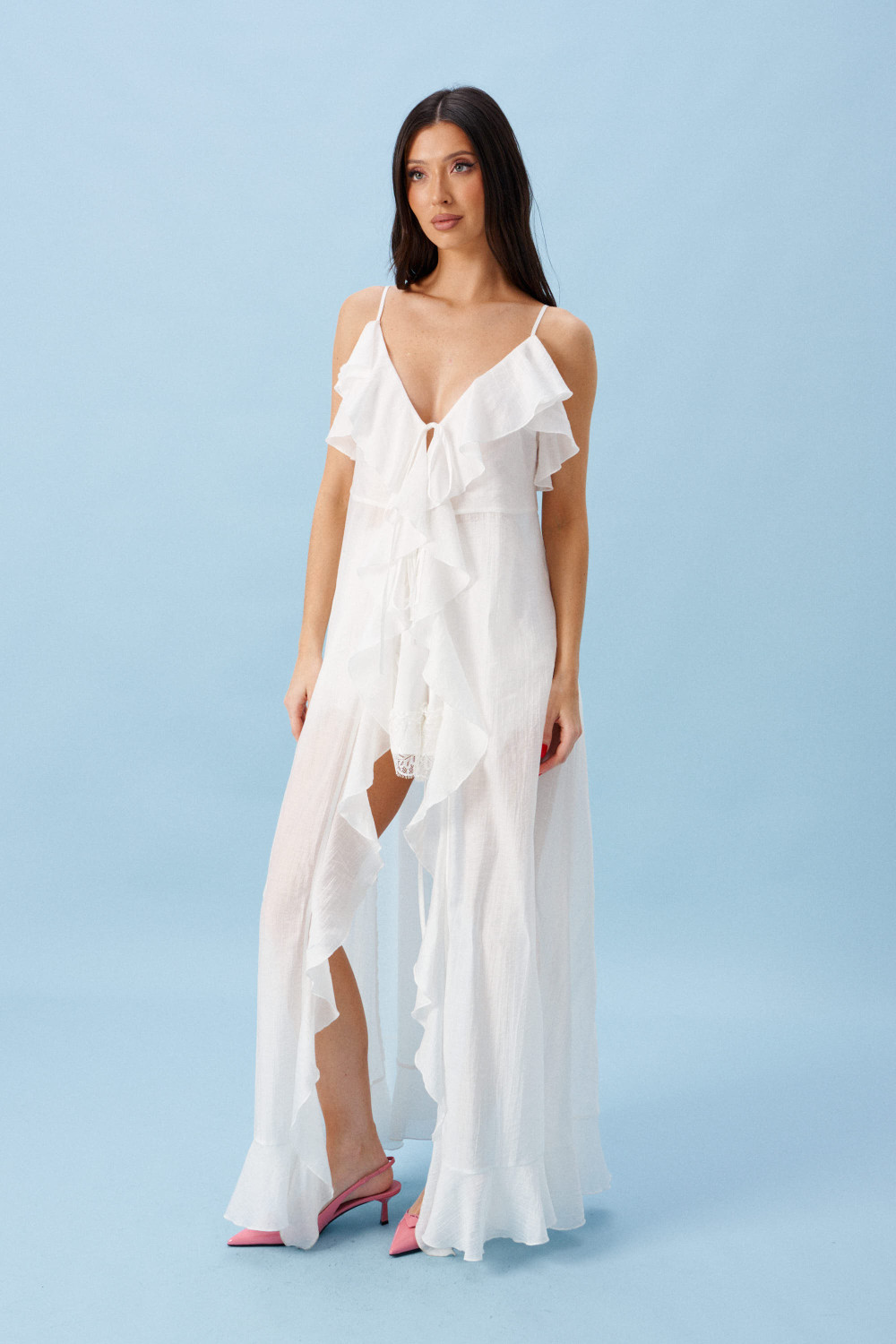 Блуза свободного кроя. Выполнена из мягкой полупрозрачной ткани белого цвета. Вырез горловины V-образный, с завязками. Бретели регулируемые. Двуслойные отрез по линии груди и спинка с отрезной кокеткой. По переду, спинке, низу воланы.