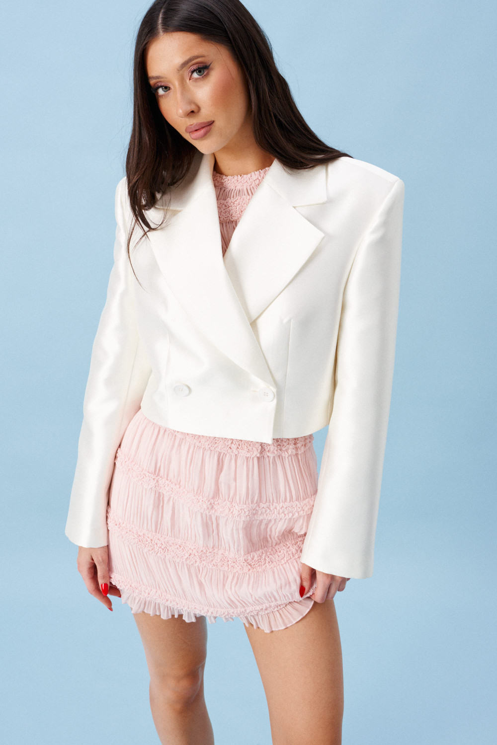 Топ полуприлегающего силуэта. Выполнен из прозрачной фактурной ткани нежно-розового цвета. По переду с подкладкой. Застежки в изделии нет.