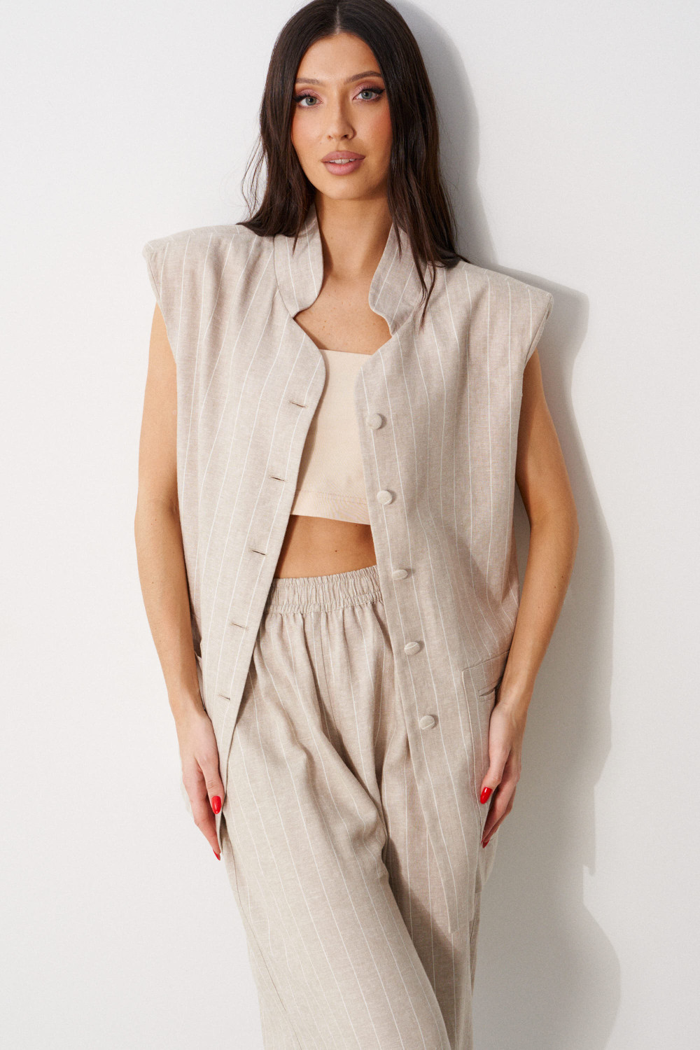 Брюки свободного кроя, выполнены из хлопкового полотна бежевого цвета в узкую полоску. Характеристика: свободный крой, пояс на резинке, в боковых швах карманы, сзади изделия накладные функциональные карманы.