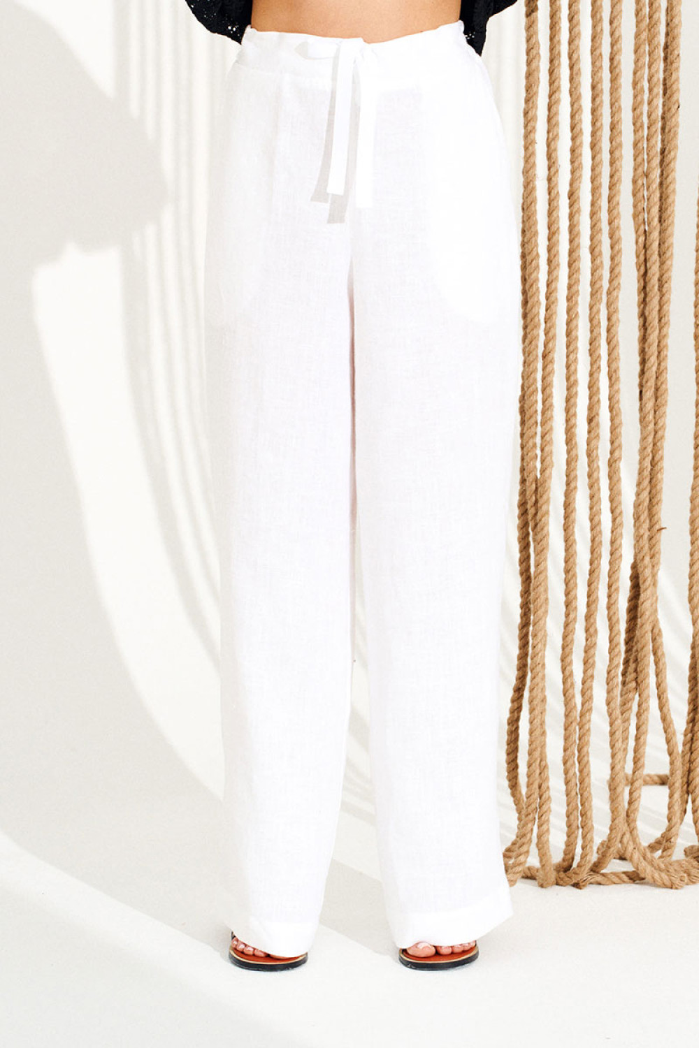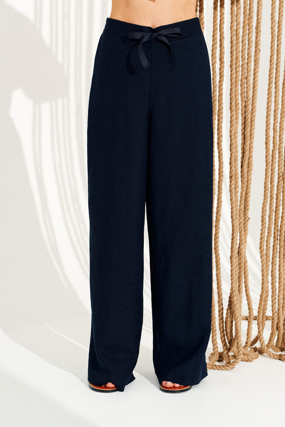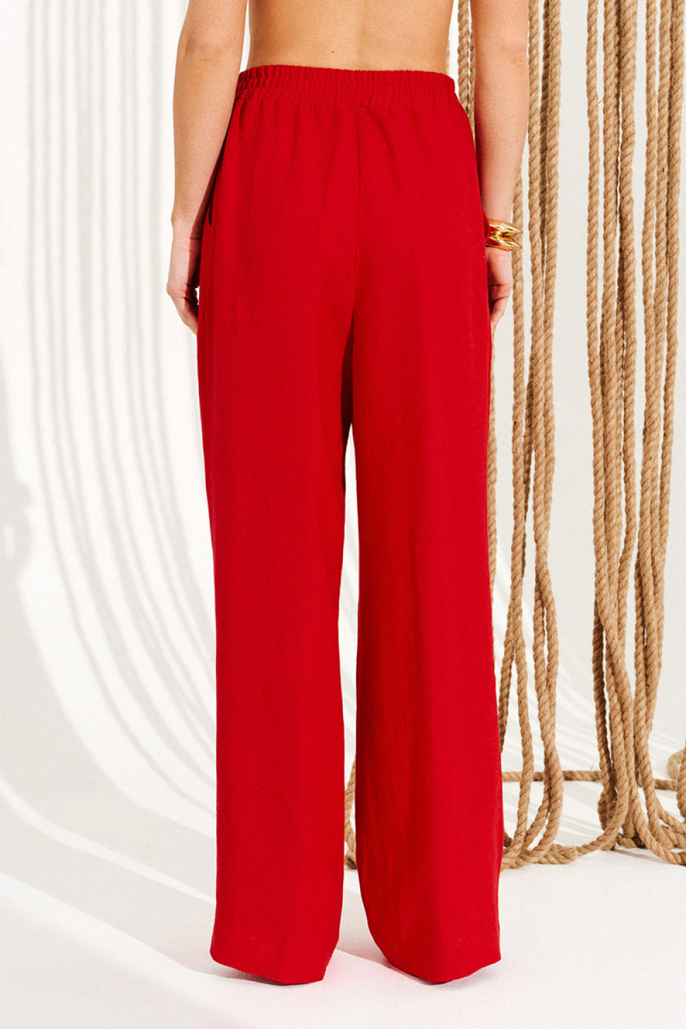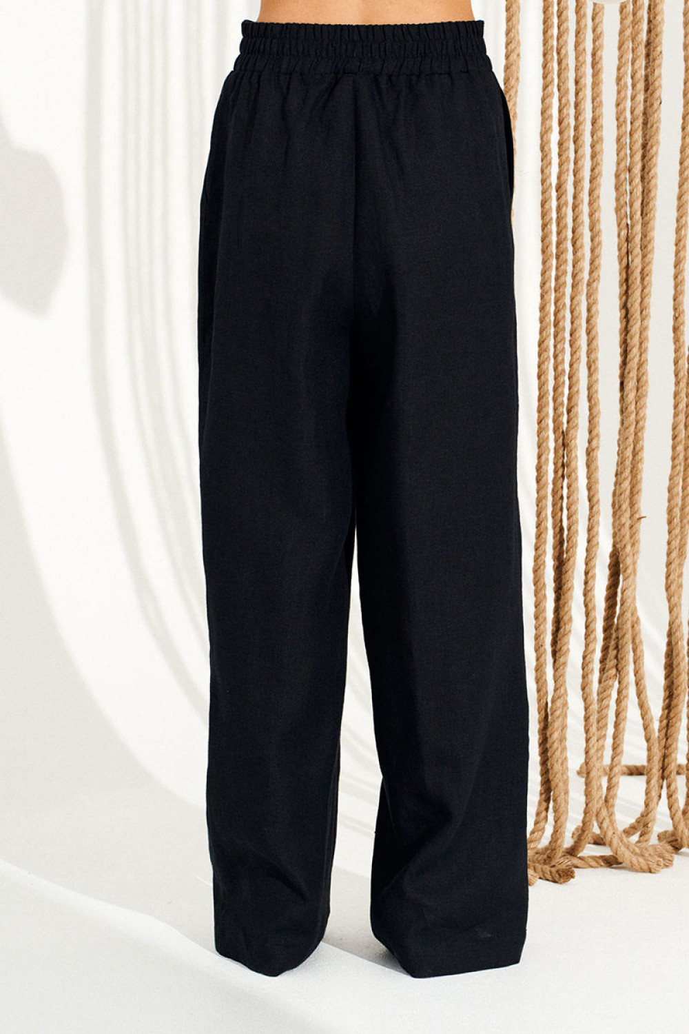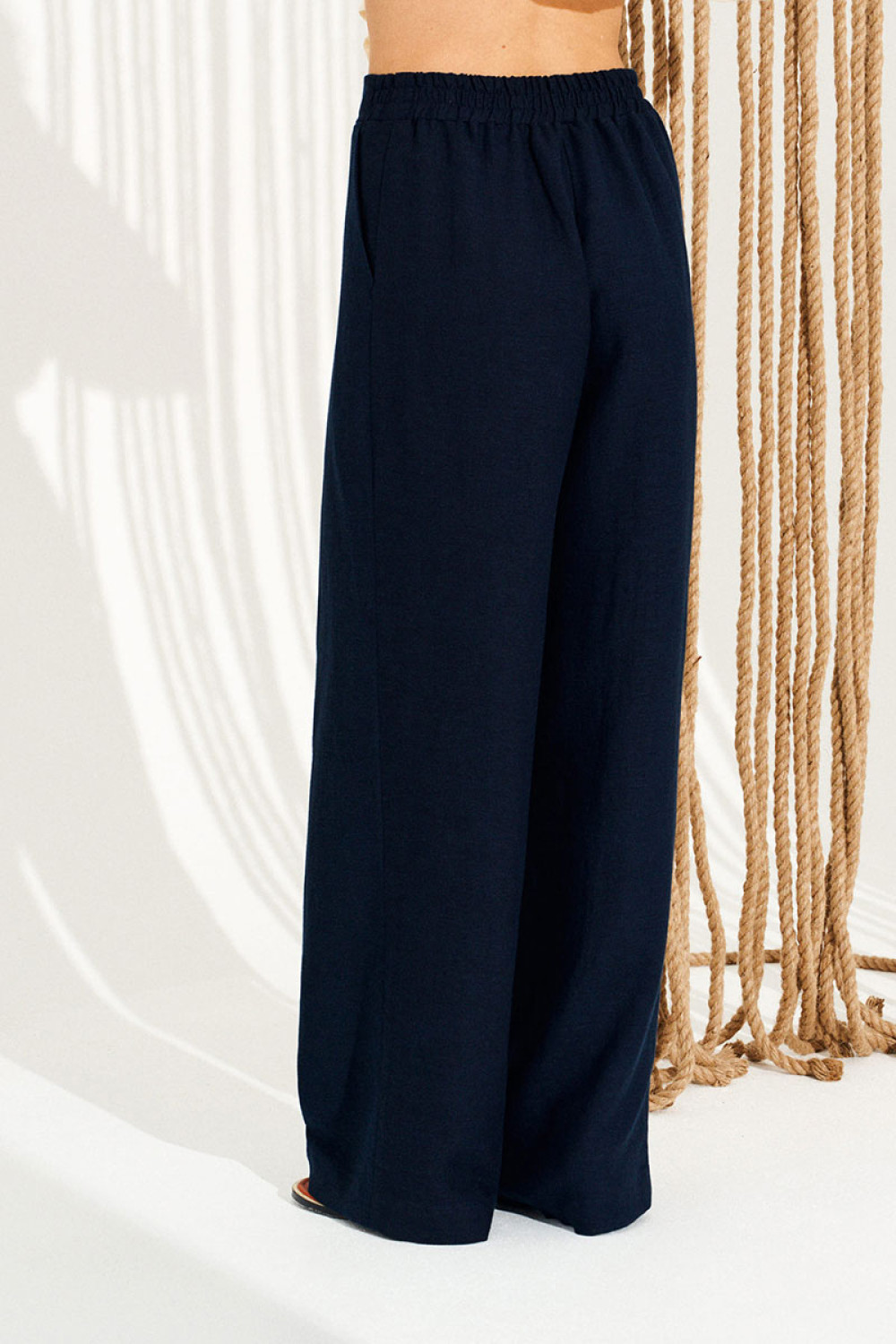 Брюки умеренного объема, прямого силуэта. На передних половинках выполнены боковые карманы с отрезным бочком. Пояс притачной, с резинкой по спинке и петлями по переду, в которые продета декоративная тесьма.