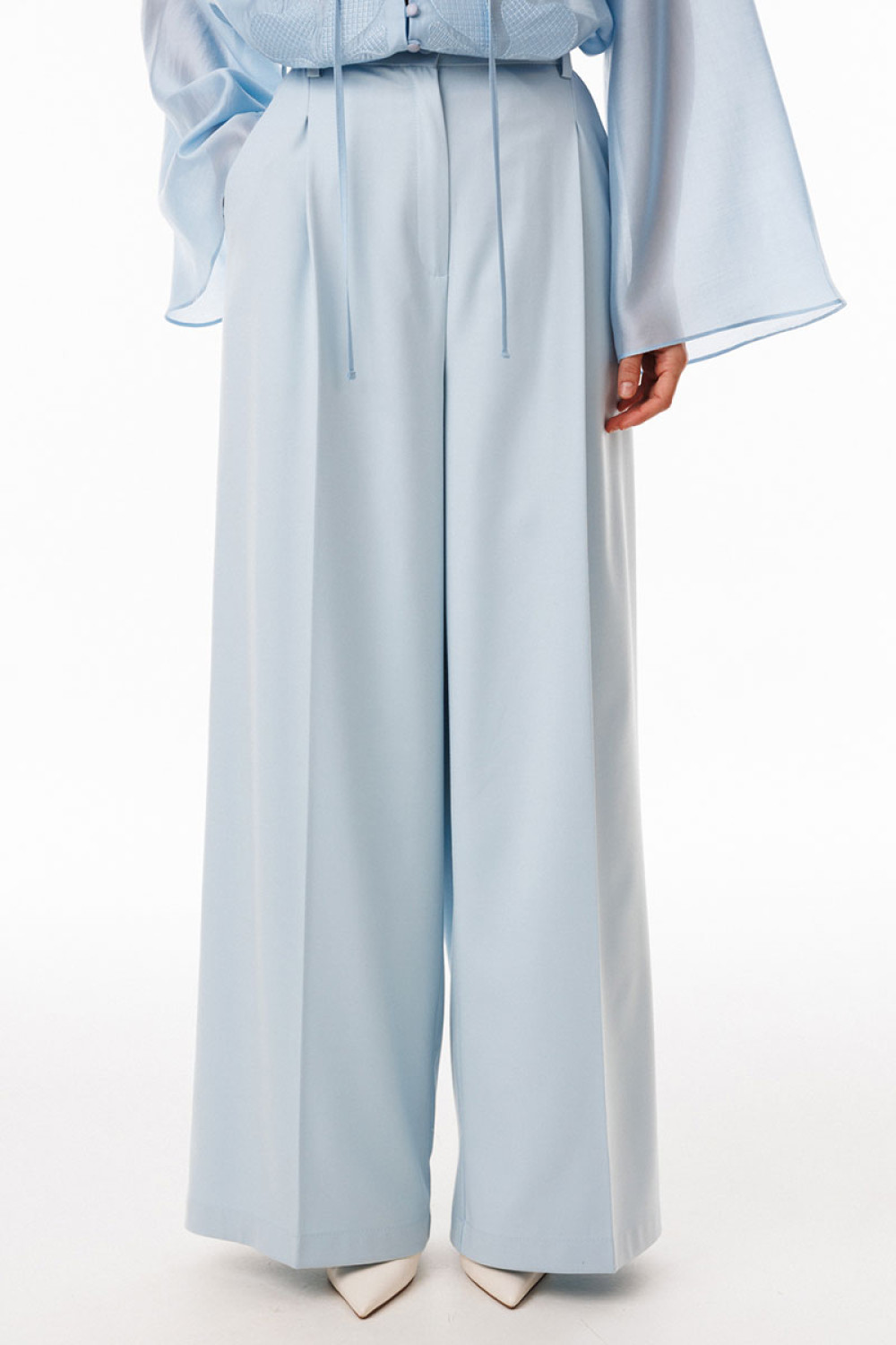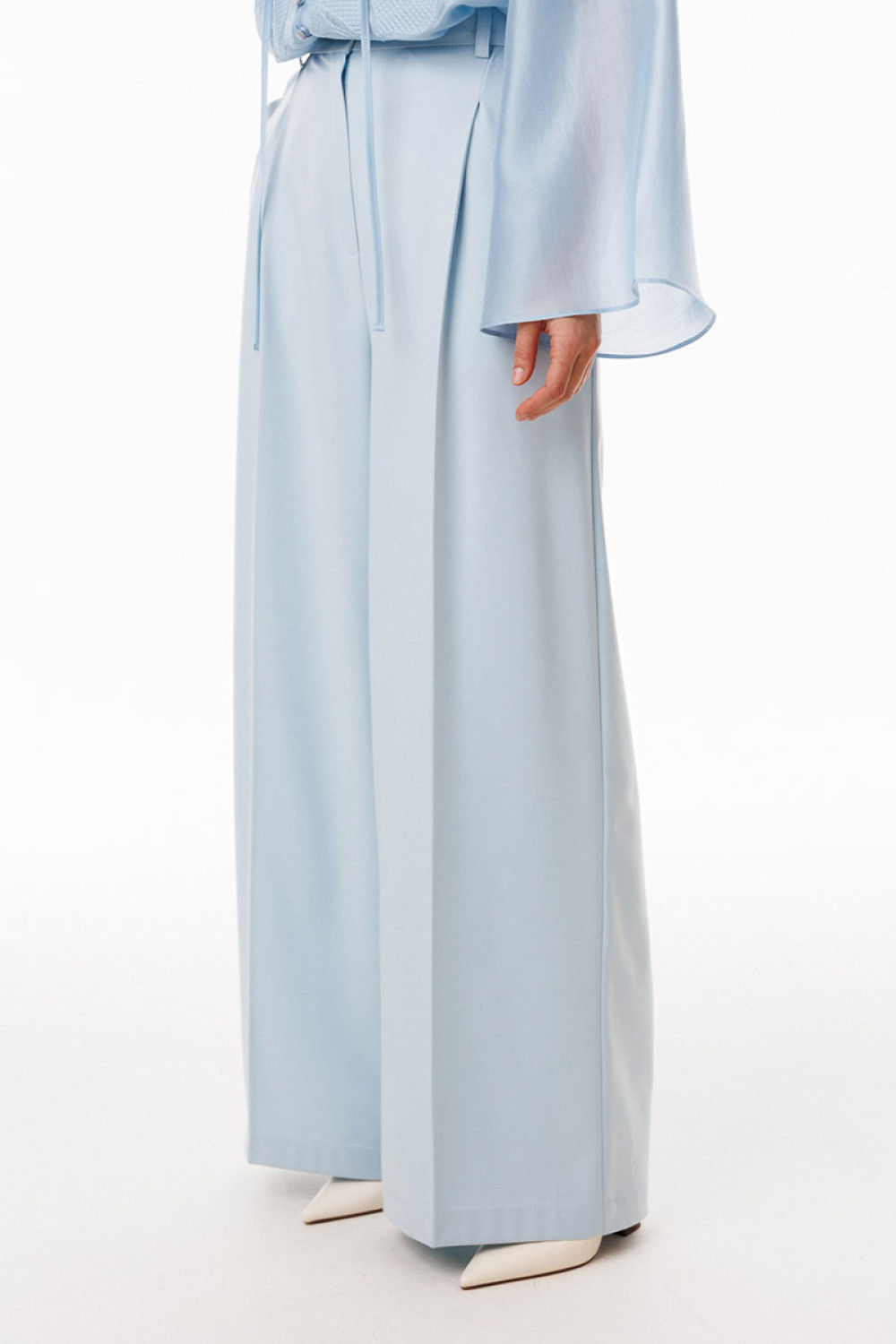 Брюки-палаццо выполнены из плательно-блузочной ткани. Брюки на притачном поясе, длиной в пол, расширенные к низу. Спереди складки и боковые карманы с наклонным входом. Застежка спереди на молнию с гульфиком и пуговицу. На задних частях обработаны талиевые вытачки.
