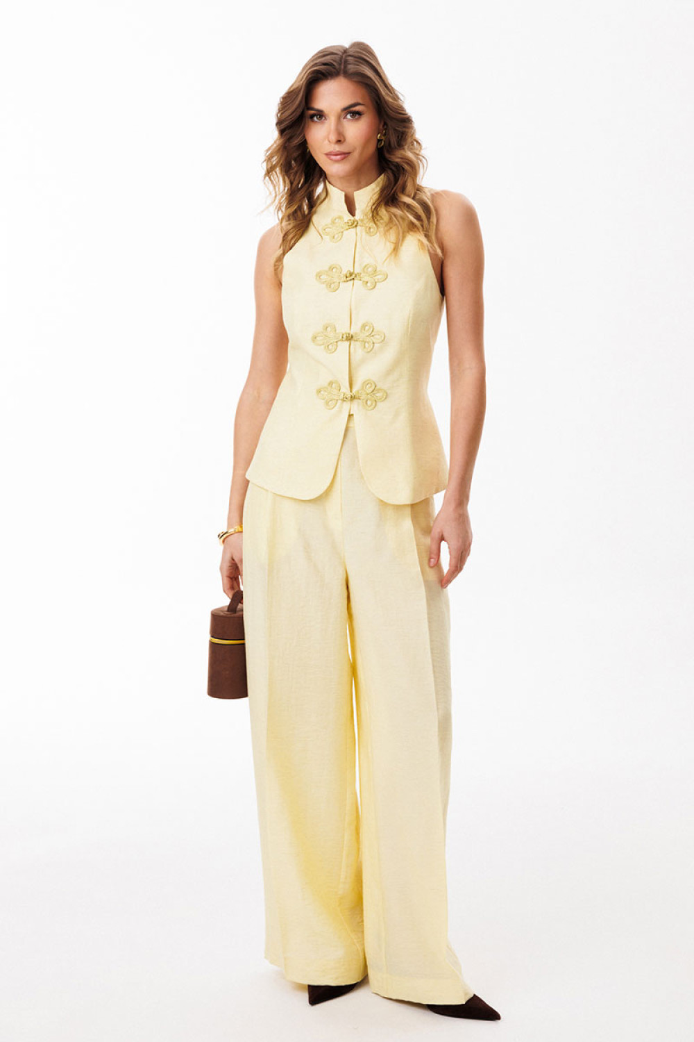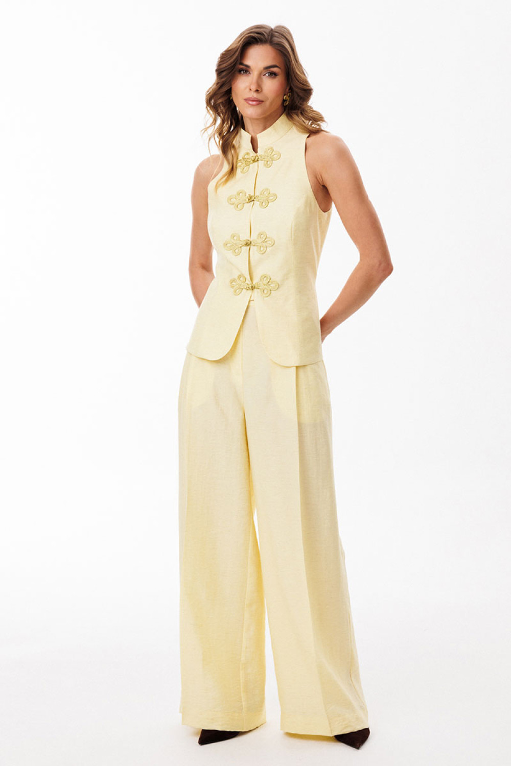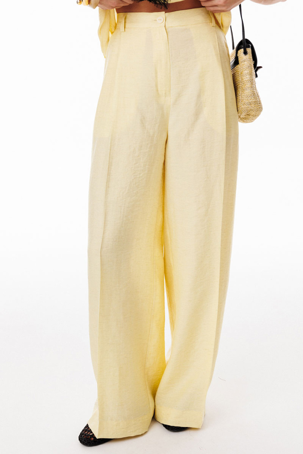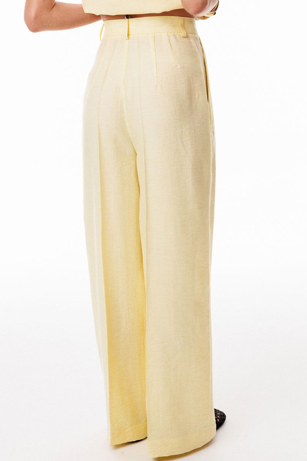 Длина брюк: р. 42-46 - 113 см, р. 48-52 - 114 см.вискоза 68%, ПА 25%, лен 6%, ПЭ 1%