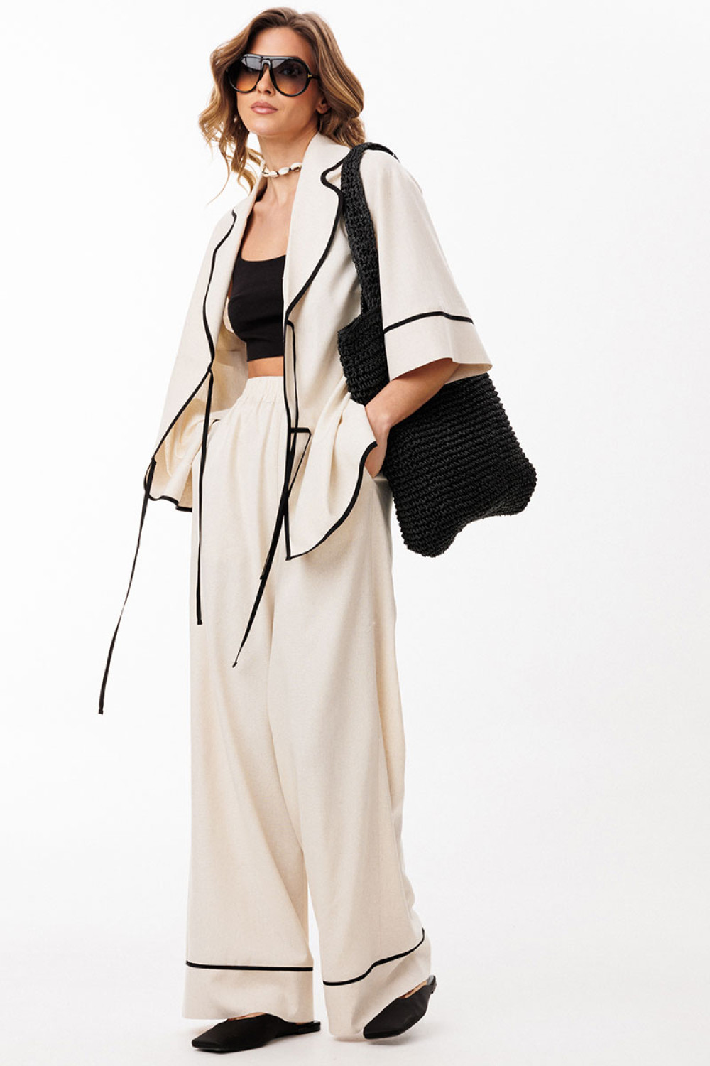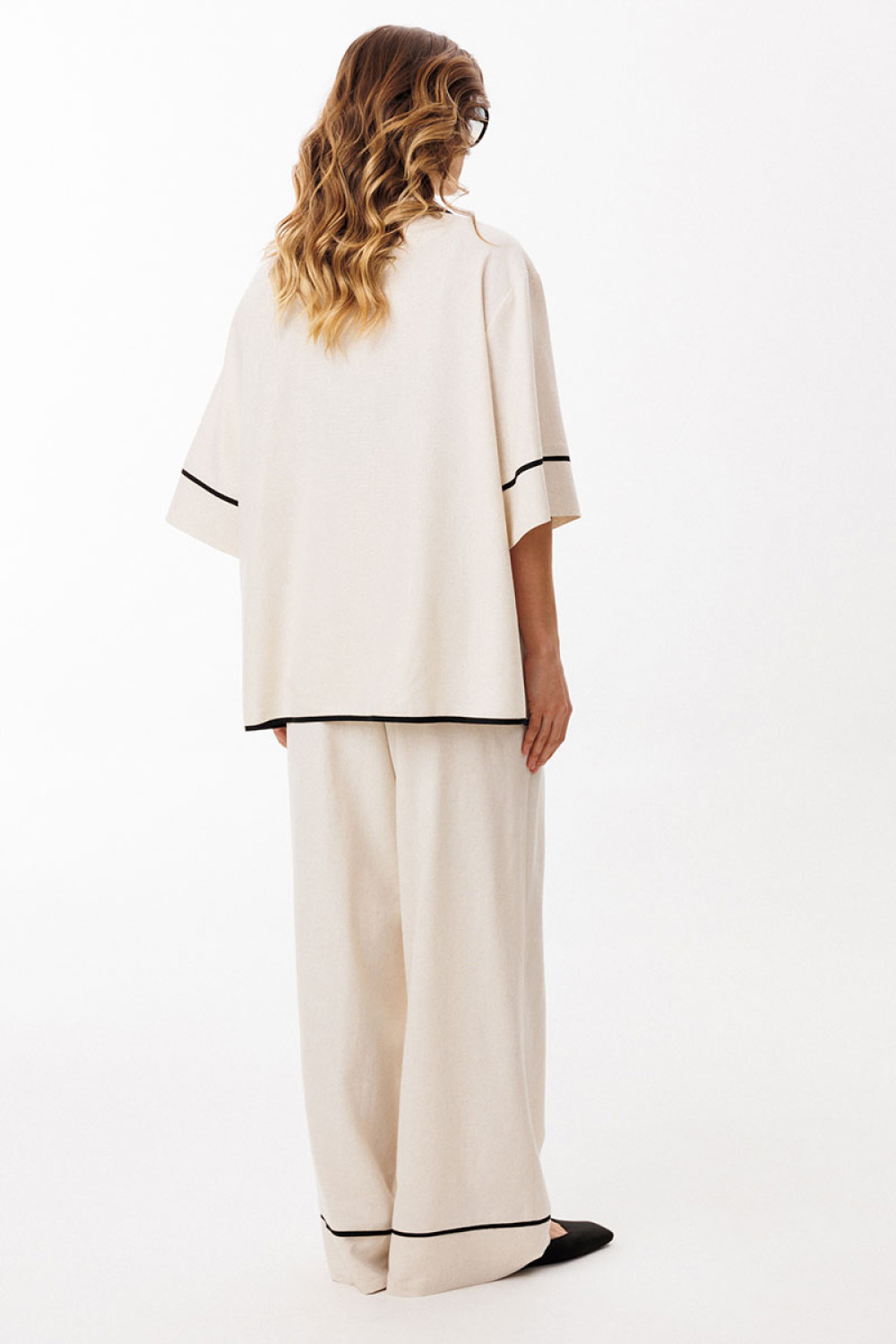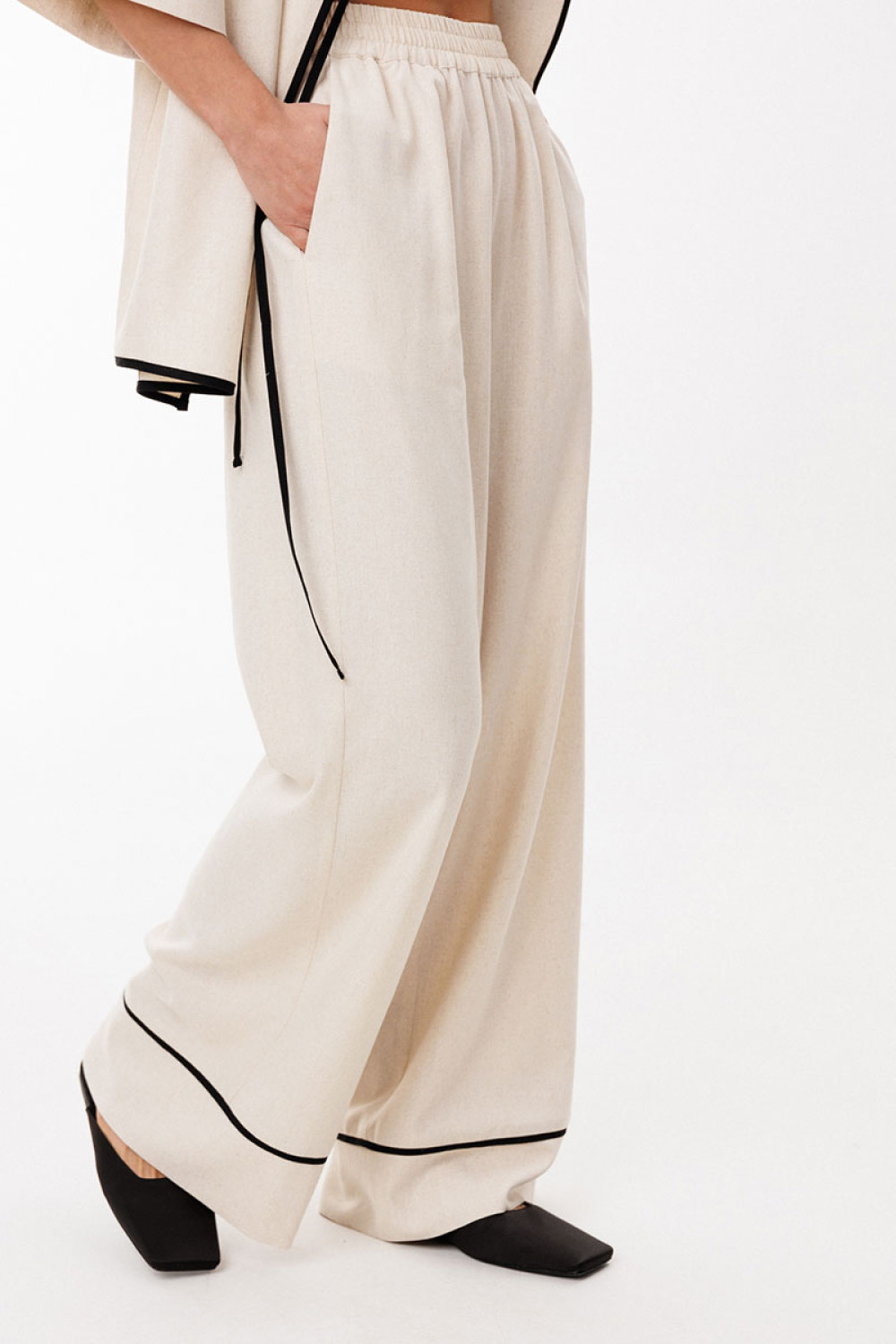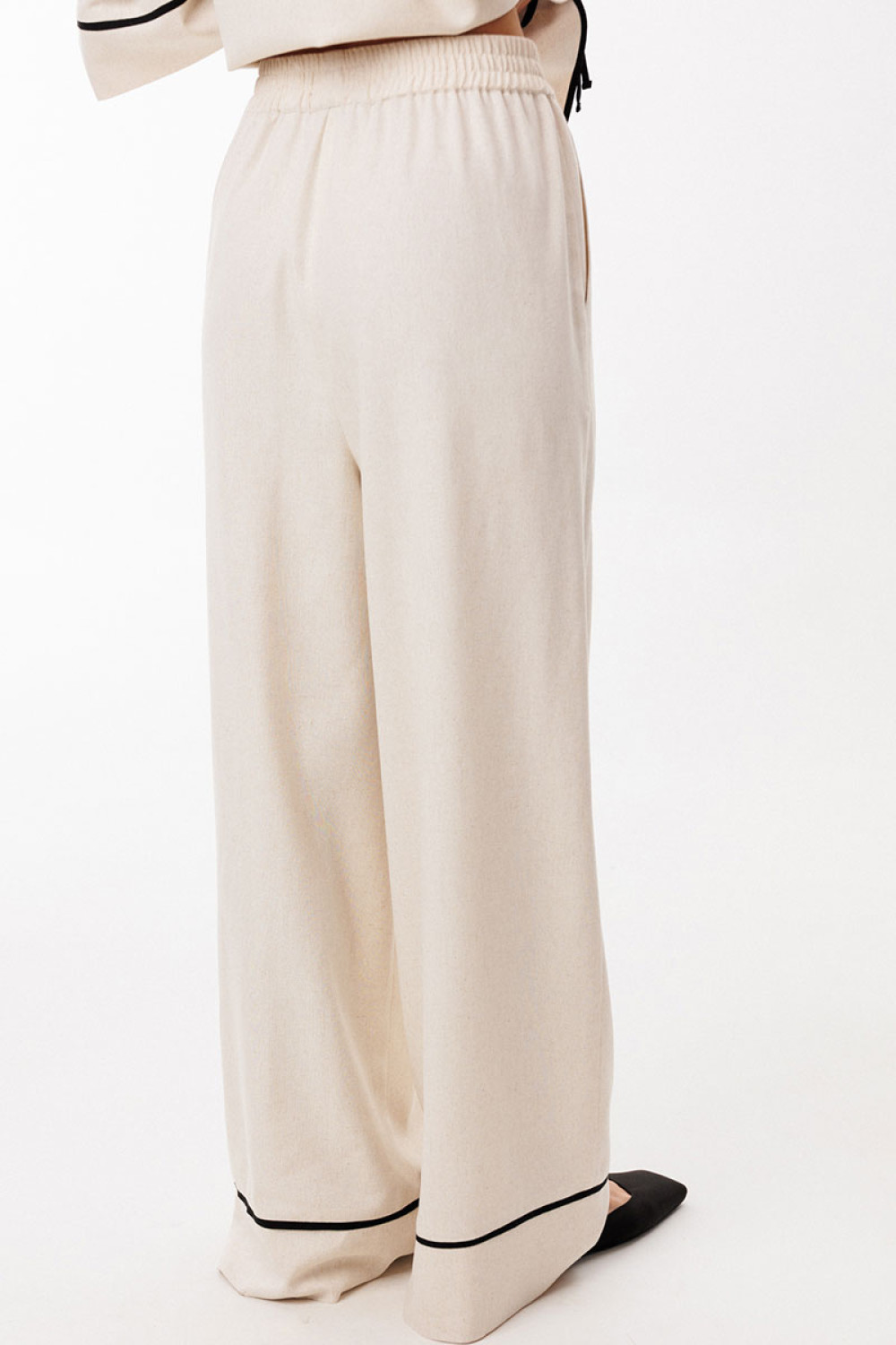 Брюки выполнены из льна. Брюки прямого силуэта, длиной в пол, на притачном поясе с эластичной тесьмой. На передних частях обработаны боковые карманы с наклонным входом. Низ брюк обработан притачной манжетой с кантом из отделочной ткани.