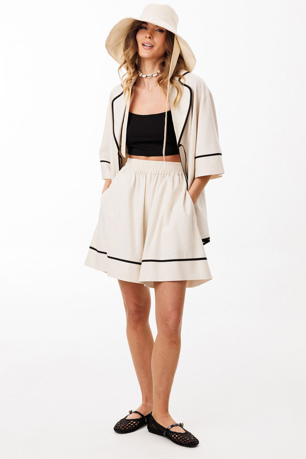 Шорты выполнены из льна. Шорты на притачном поясе с эластичной тесьмой, длиной выше линии колена. На передних и задних частях обработаны талиевые вытачки. В боковых швах обработаны карманы. Низ шорт обработан притачной манжетой с кантом из отделочной ткани.
