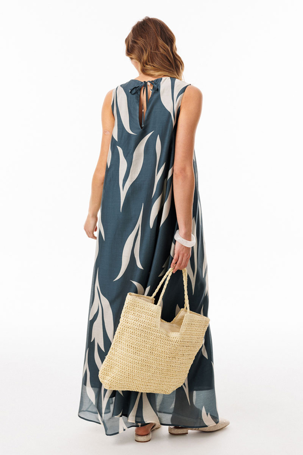 Платье выполнено из плательно-блузочной ткани. Платье А-образного силуэта, длиной миди. Горловина переда округлой формы, горловина спинки с V-образным вырезом, завязывающимся на тесьму из основной ткани. Платье на отлетной по низу подкладке.