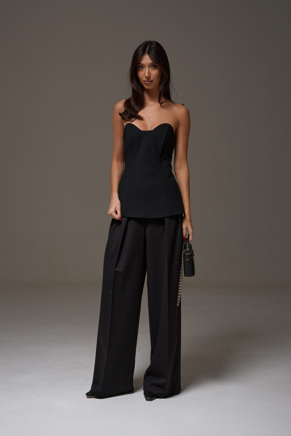 Корсет с фигурным вырезом выполнен из костюмного полотна черного цвета. Характеристики: прилегающий силуэт, подкладка, фигурный вырез горловины, по передней части изделия и в боковых швах упругие узкие пластины, по заднему полотну в среднем шве потайная молния.