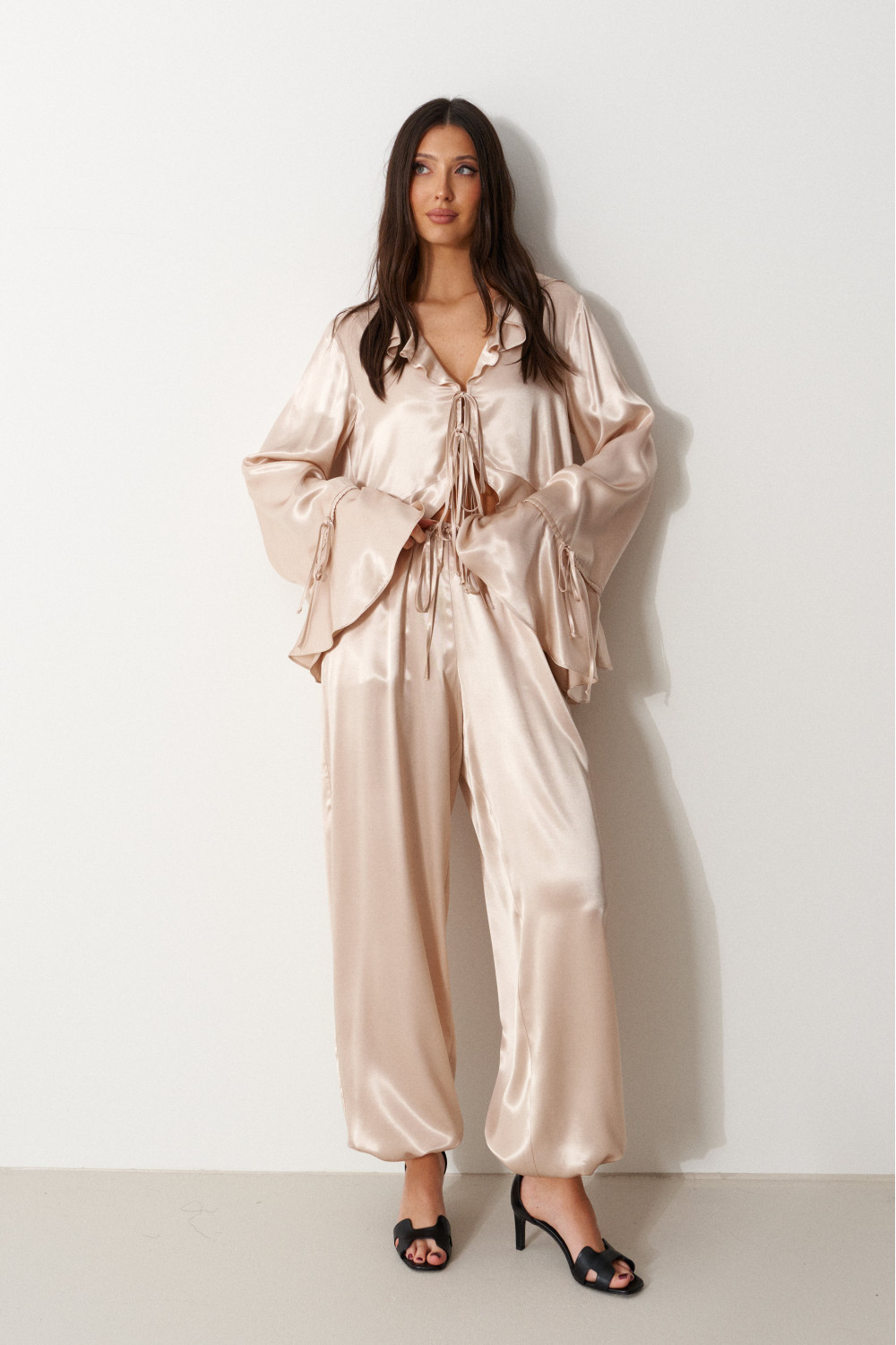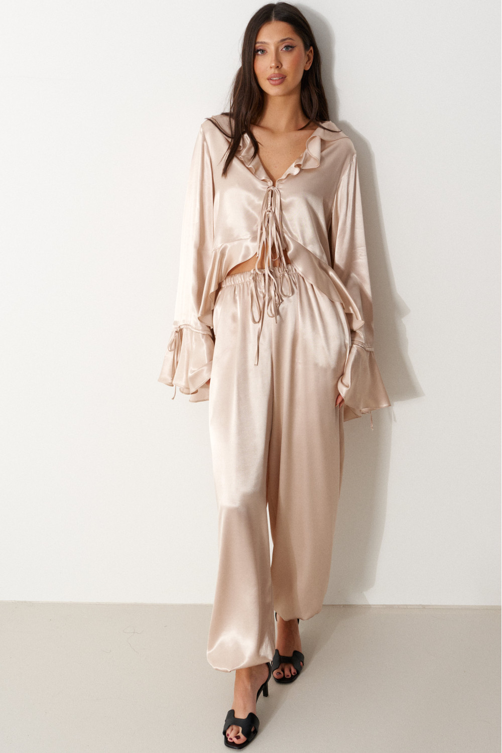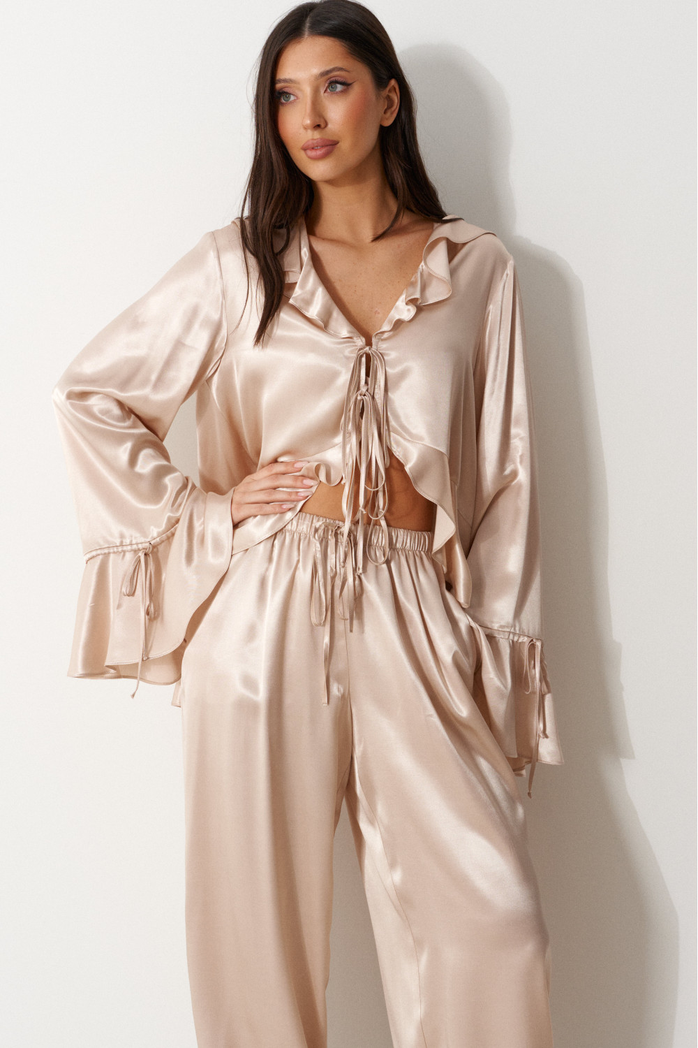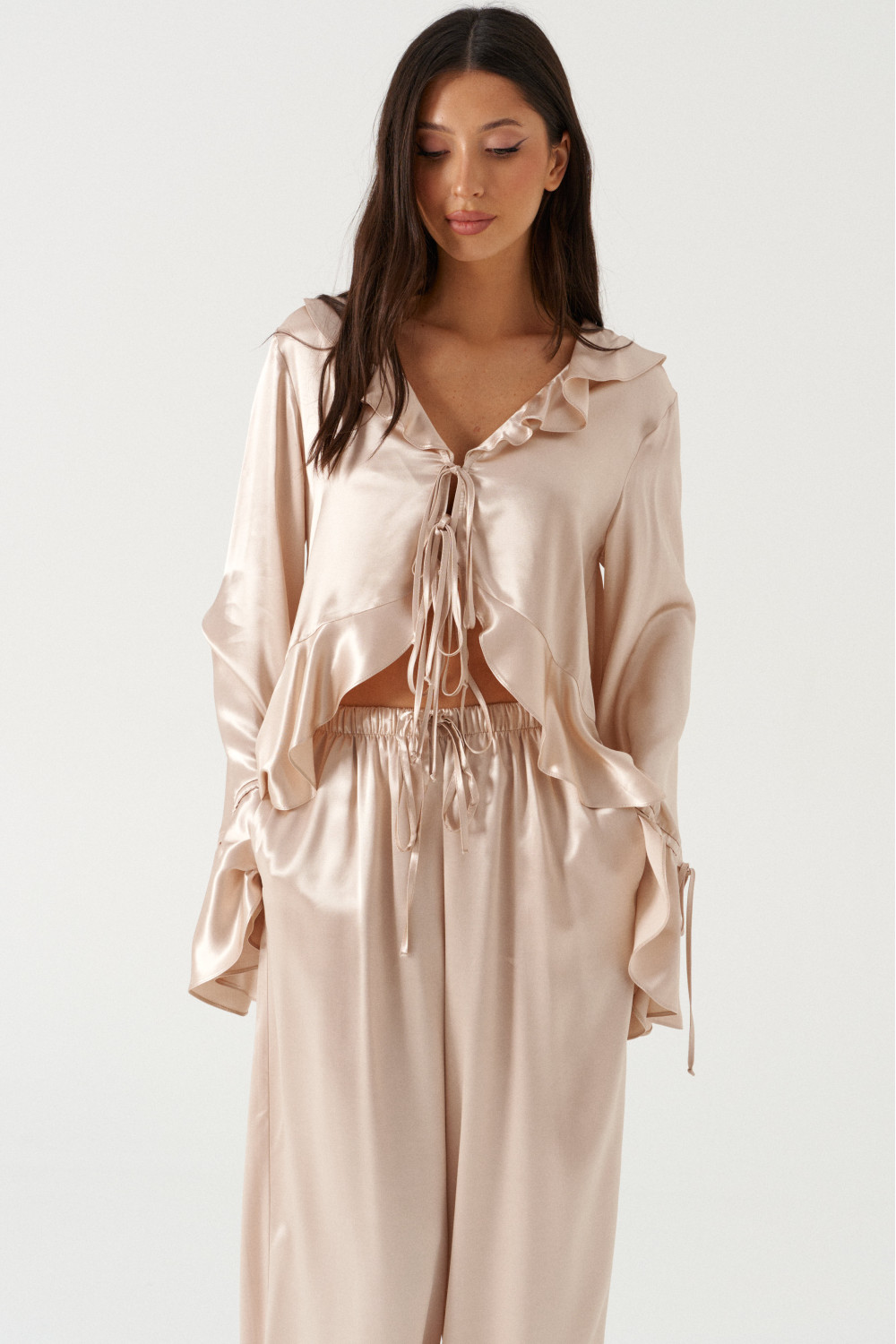 Блуза свободного кроя, выполнена из мягкого струящейся ткани телесного цвета. Характеристика: вырез горловины V-образный, с воланом по всей длине (переходит на спинку), центарльная застежка на завязки, рукав втачной, спущенный, по низу волан с кулиской, низ блузы по переду фигурный, с воланом переходящим на спинку.