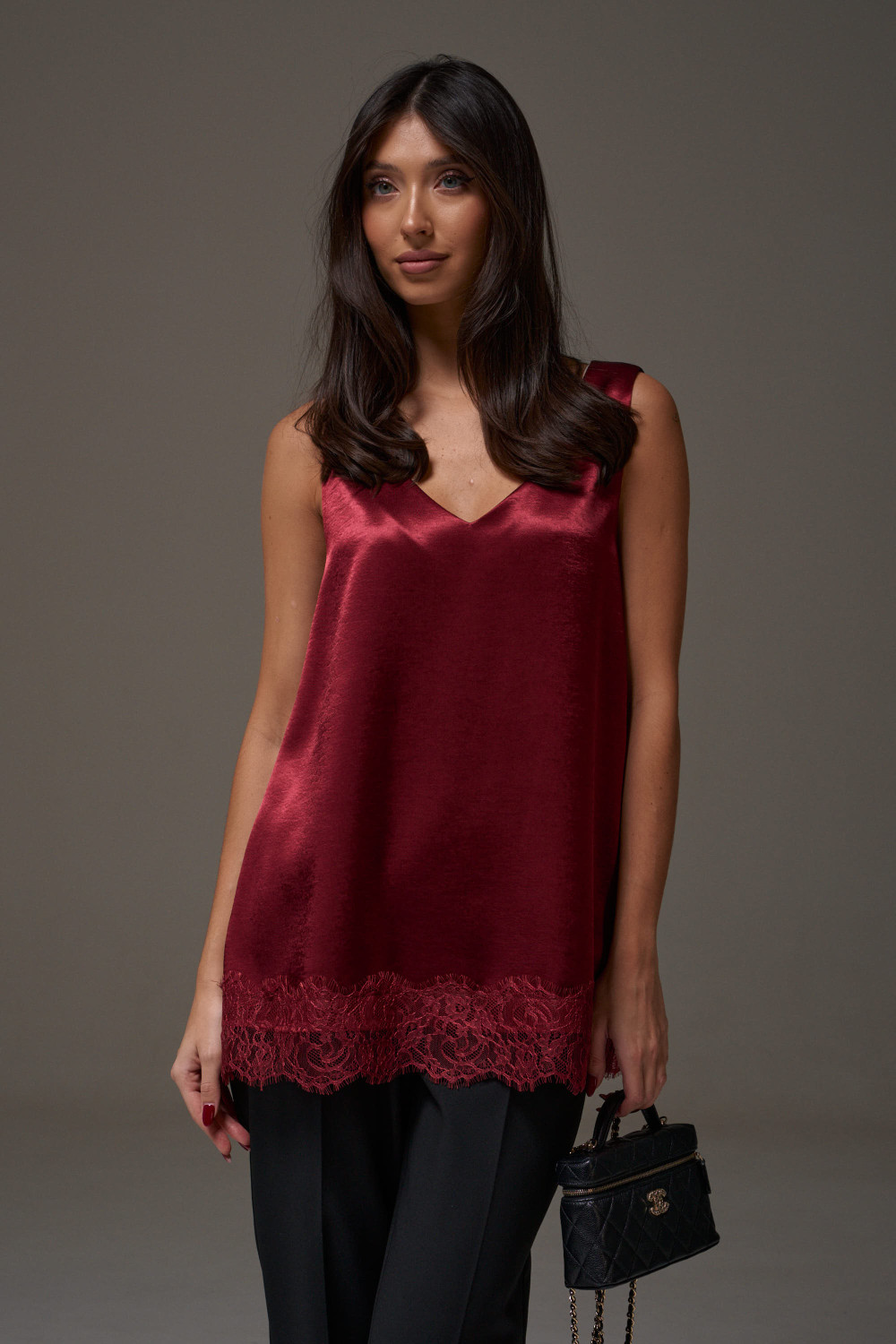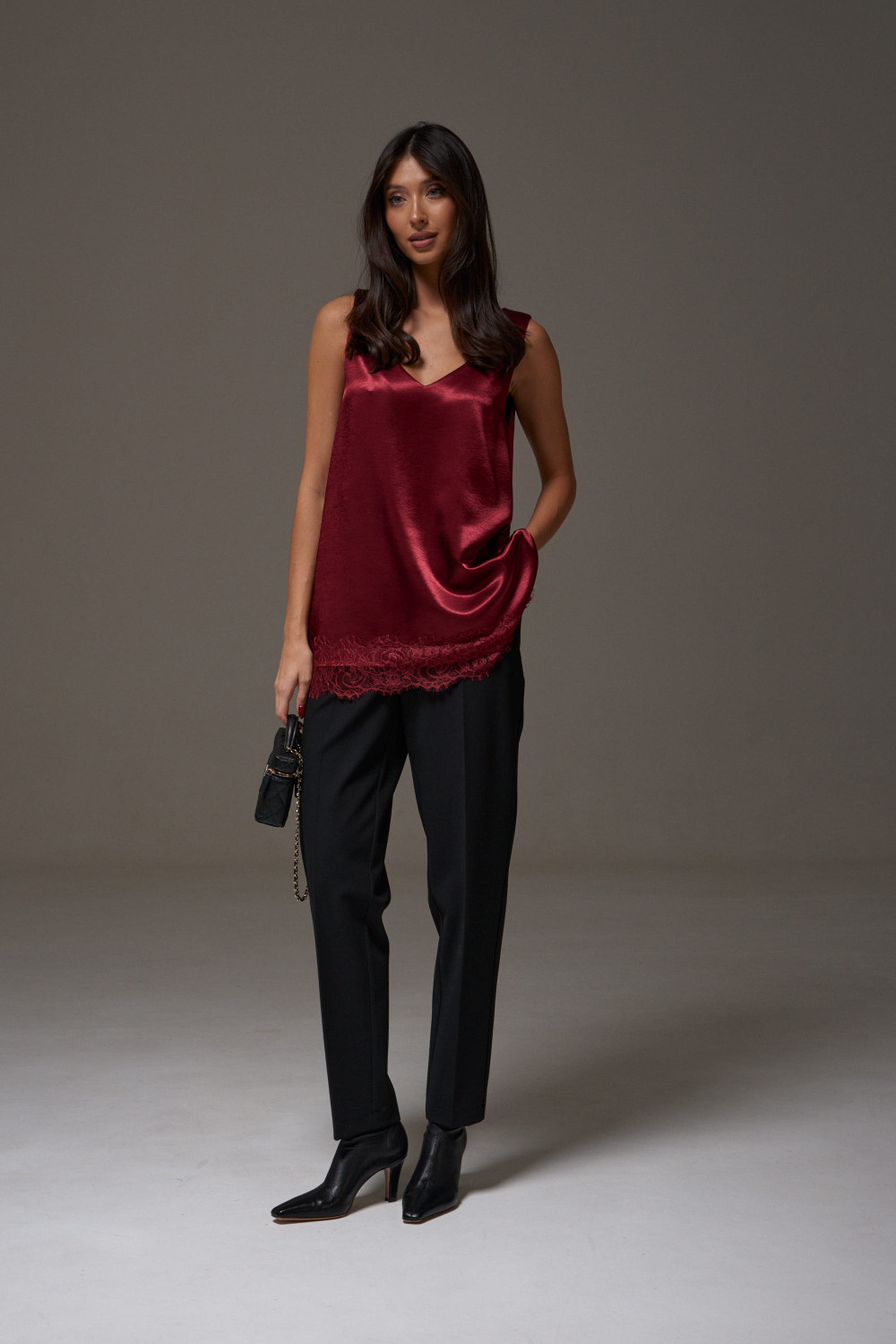 Блузон в крое трапеция, выполнен из струящейся ткани бордового цвета. Характеристика: крой трапеция - расширяется к низу, широкие бретели, спереди v-образный вырез, по спинке овальная горловина, спинка изделия чуть удлинена, по низу изделия пришито кружево.