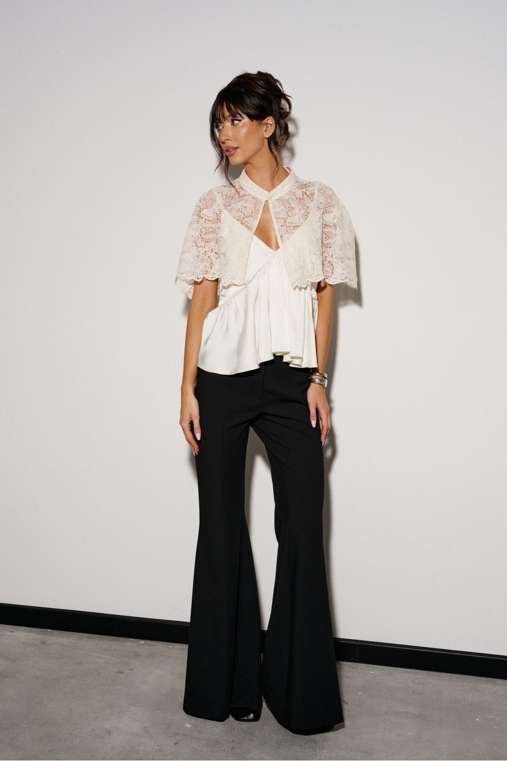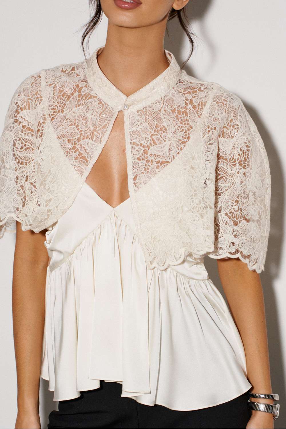 Кейп выполнен из кружевного сатинового полотна молочного цвета. Характеристики: горловина стойка, застежка центральная на пуговицу. Длина по спинке 36см.