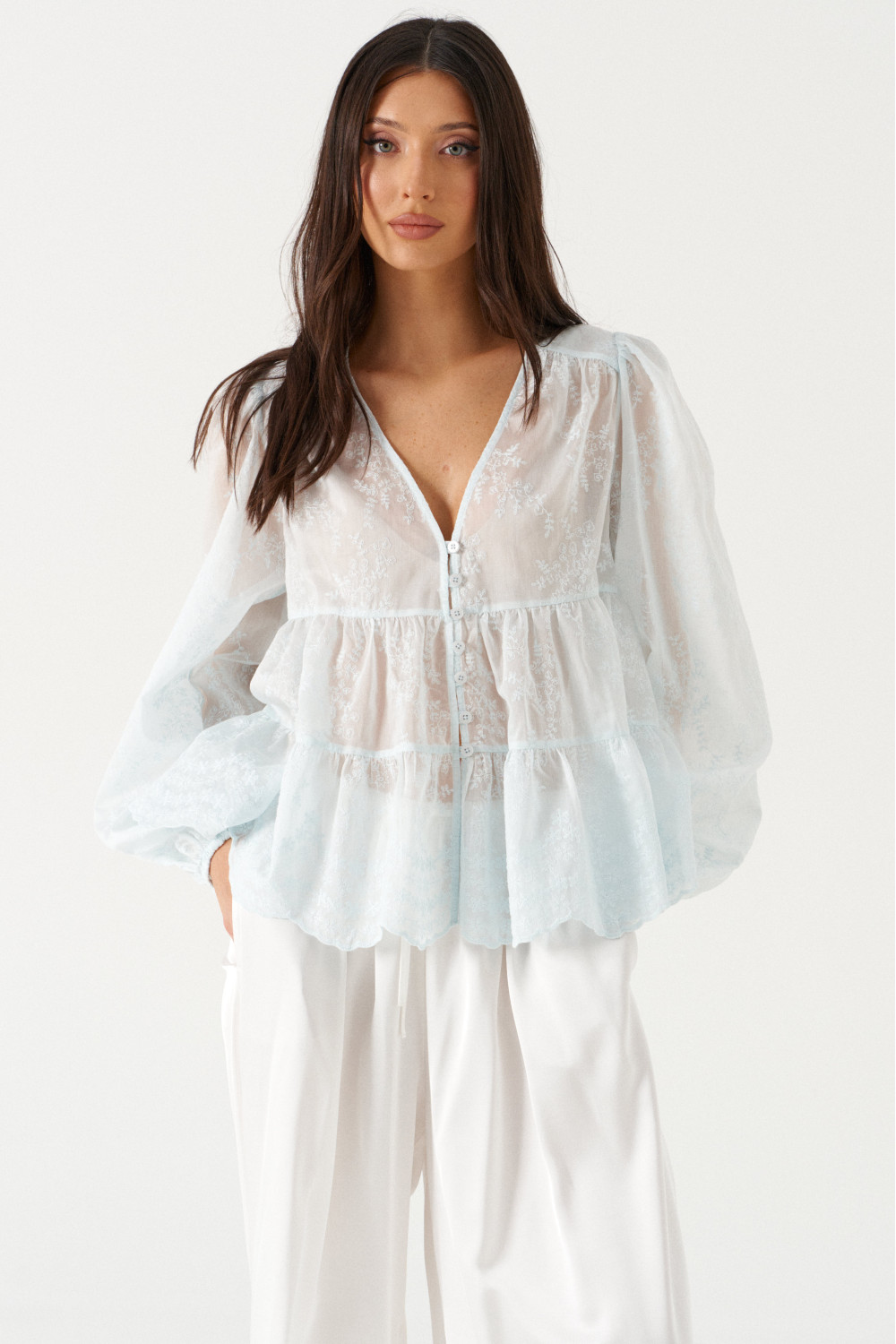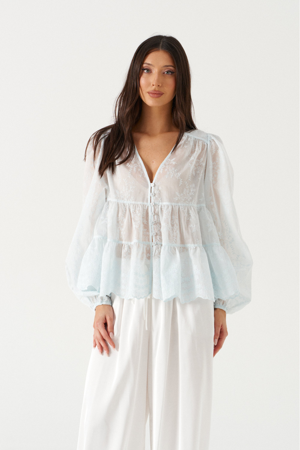 Блузка свободного кроя выполнена из полупрозрачной ткани с вышивкой голубого цвета. Характеристики: вырез V-образный, отрез по линии груди с двумя воланами, кокетка со сборкой, рукав вточной широкий, манжет на на резинке, застёжка на воздушные петли.