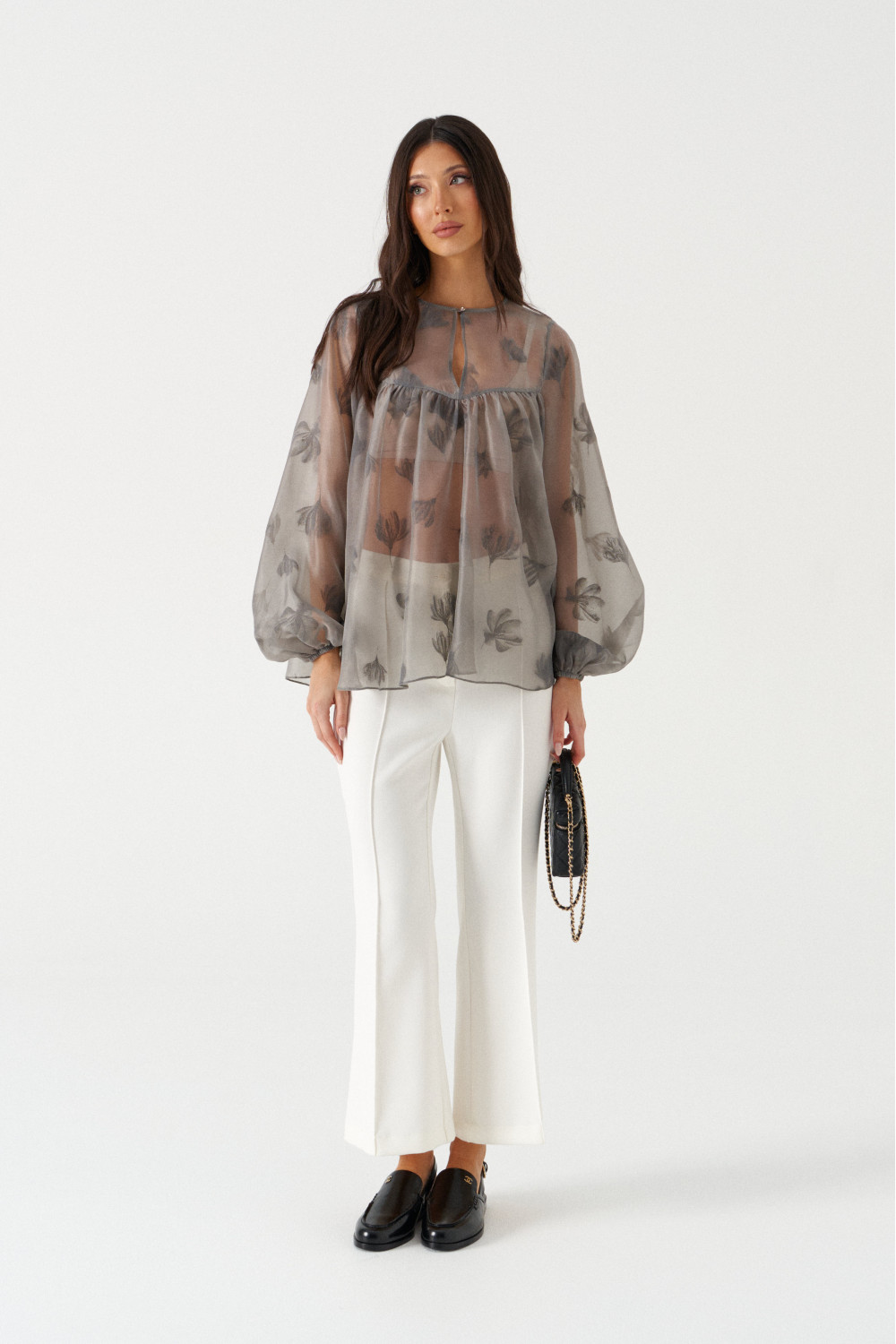 Блуза свободного кроя. Выполнена из прозрачной ткани серого цвета. Горловина круглая. Рукав втачной, внизу на резинке. Застёжка центральная - пуговка. Спинка и передняя части отрезные со сборкой.