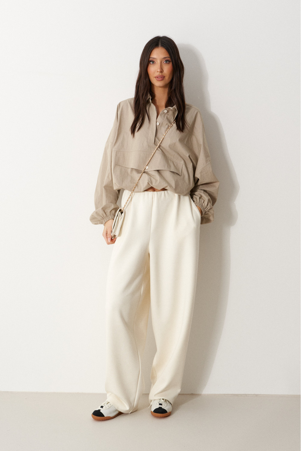 Блузон прямого свободного кроя выполнен из хлопковой ткани, в оттенке светлой оливы. Характеристики: отложной воротник, застежка центральная на петли пуговицы, по переду имитация кармана. Низ изделия на резинке с фиксатором. Плечо спущено, рукав свободный, низ рукава на резинке.
