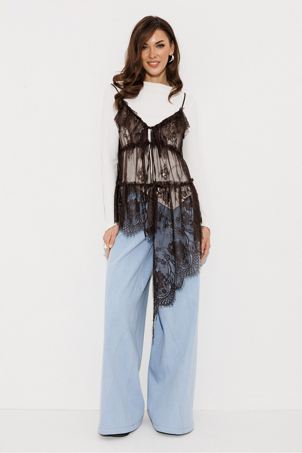 Блузка из кружева без подкладки на регулируемых бретелях и асимметричным низом. Полочка с V-образным вырезом и центральной застежкой на завязки. По горловине, пройме и спинке вверху вставлен волан со сборкой. По полочке и спинке настрочены рюши горизонтально.
