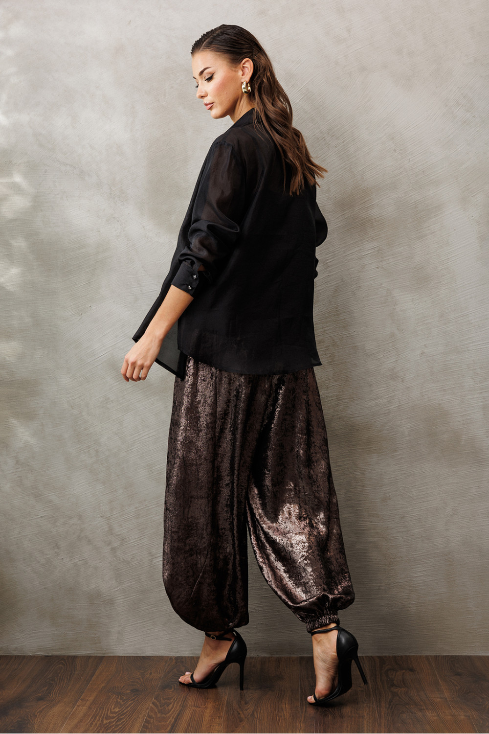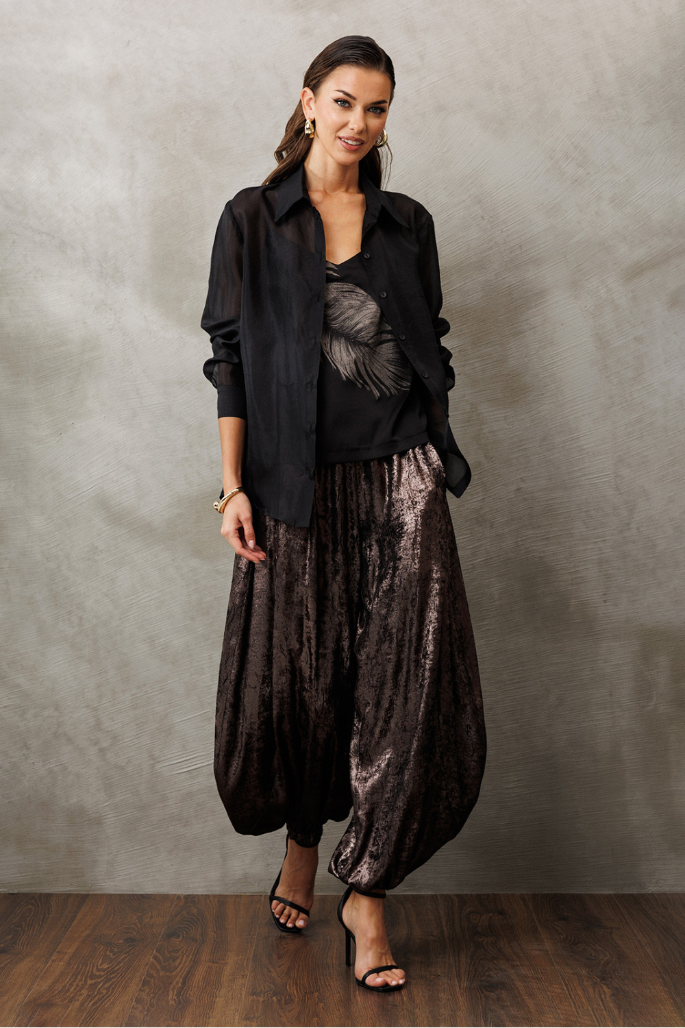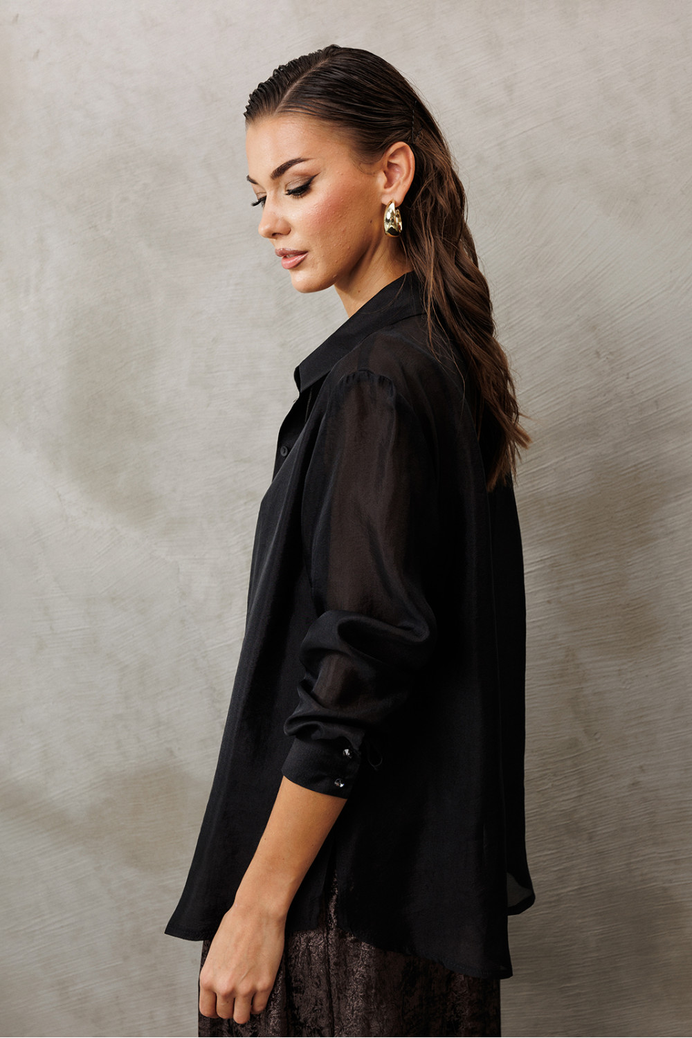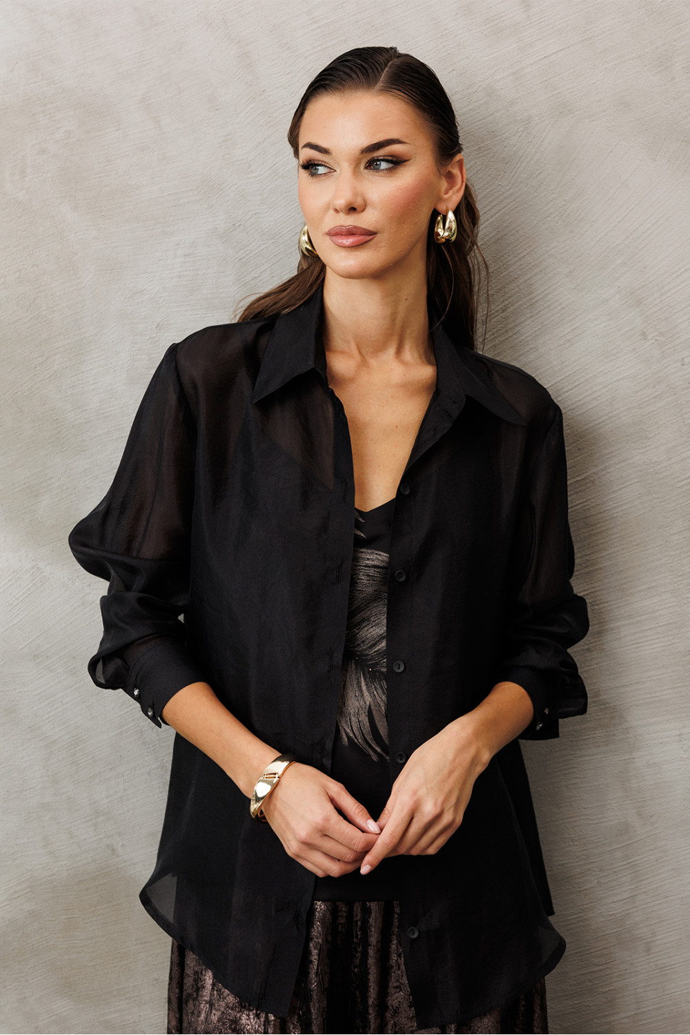 Блузка из креп-шифона с напылением. Прямого силуэта, с втачным рукавом внизу на манжете с застежкой на петли пуговицы. Полочка с центральной застежкой на петли-пуговицы на цельнокроеной планке. Воротник рубашечный отложной на стойке. Спинка и полочка с фигурным низом. Внизу по боковым швам обработаны разрезы.