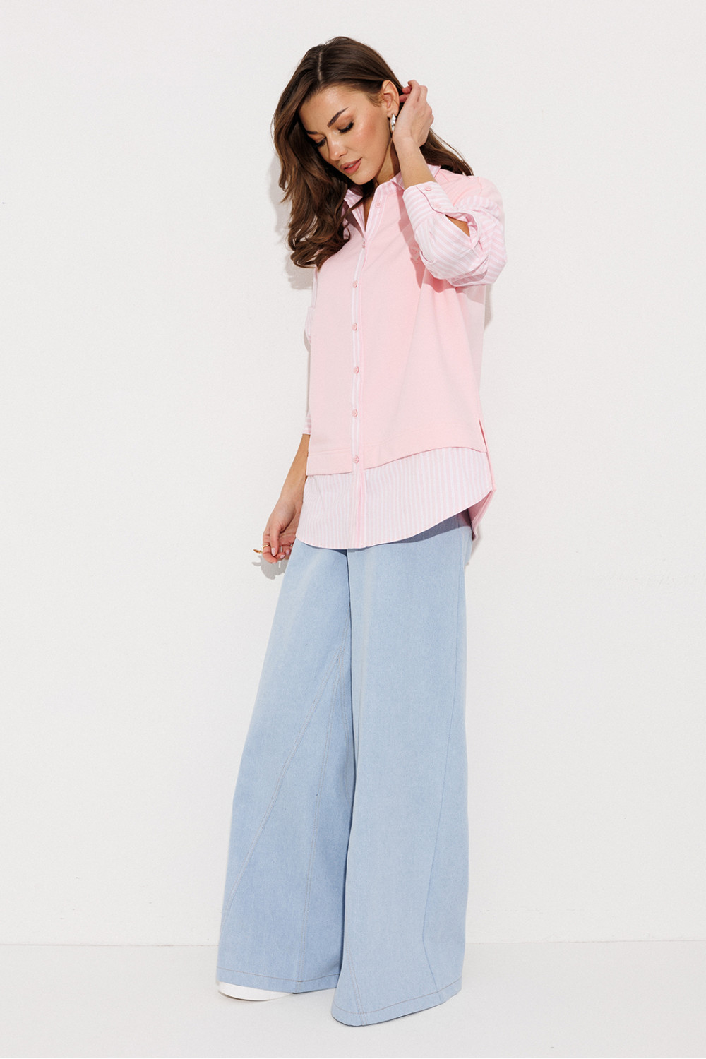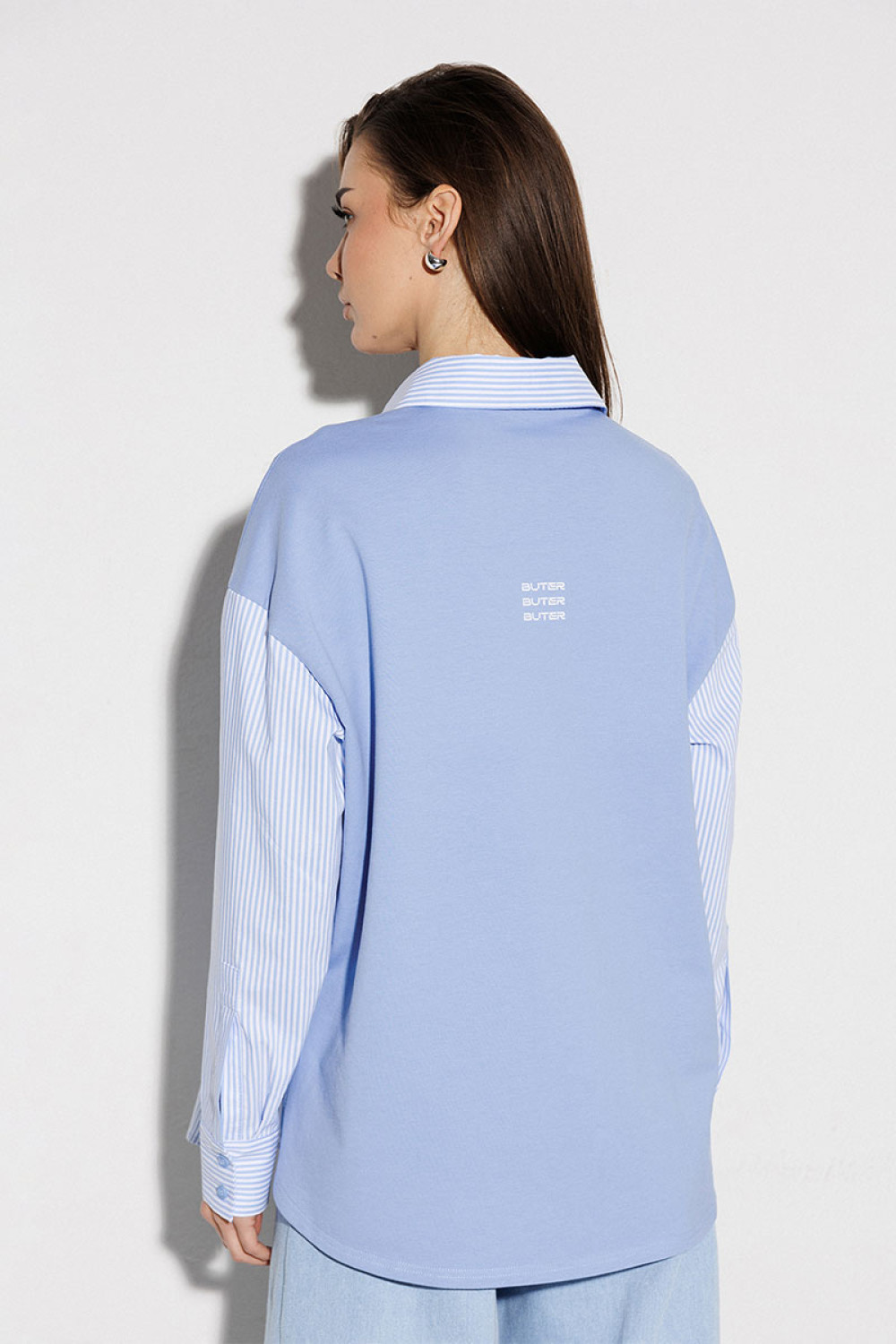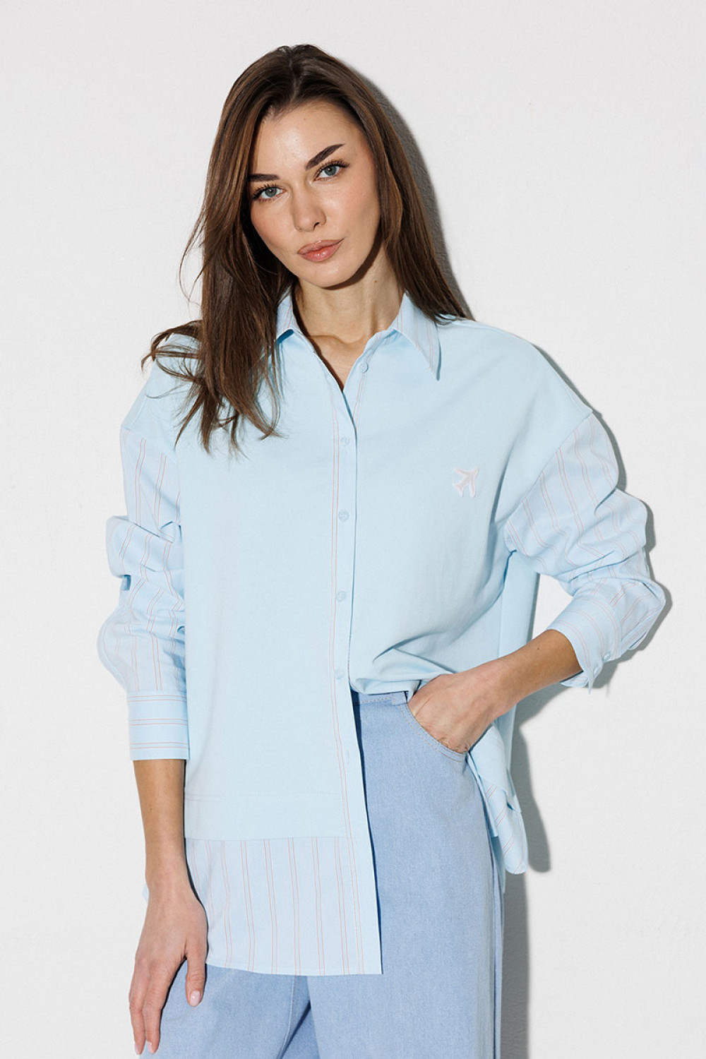 Блузка, комбинированная прямого силуэта, с втачным одношовным рукавом, со складкой и манжетой, с застежкой на петли-пуговицы и спущенной линией плеча. Полочка из трикотажа и рубашечной ткани с центральной застежкой на петли-пуговицы и вышивкой "Самолет". Спинка из трикотажа с печатью "BUTER". Воротник рубашечный отложной на стойке. Спинка и полочка с фигурным низом. Внизу по боковым швам обработаны разрезы.