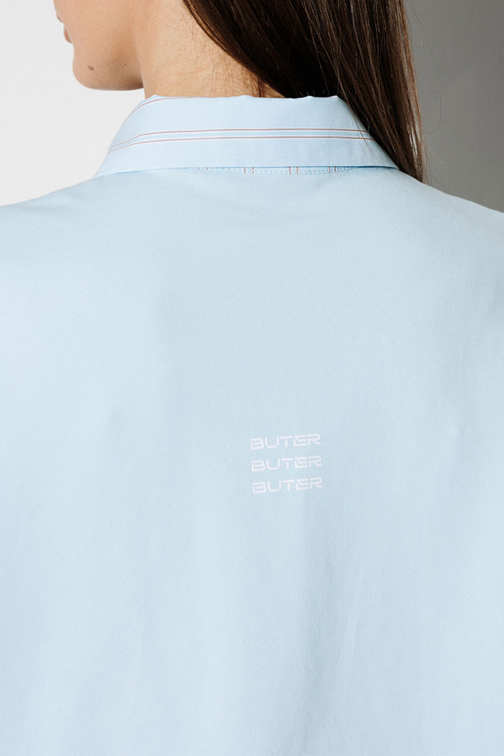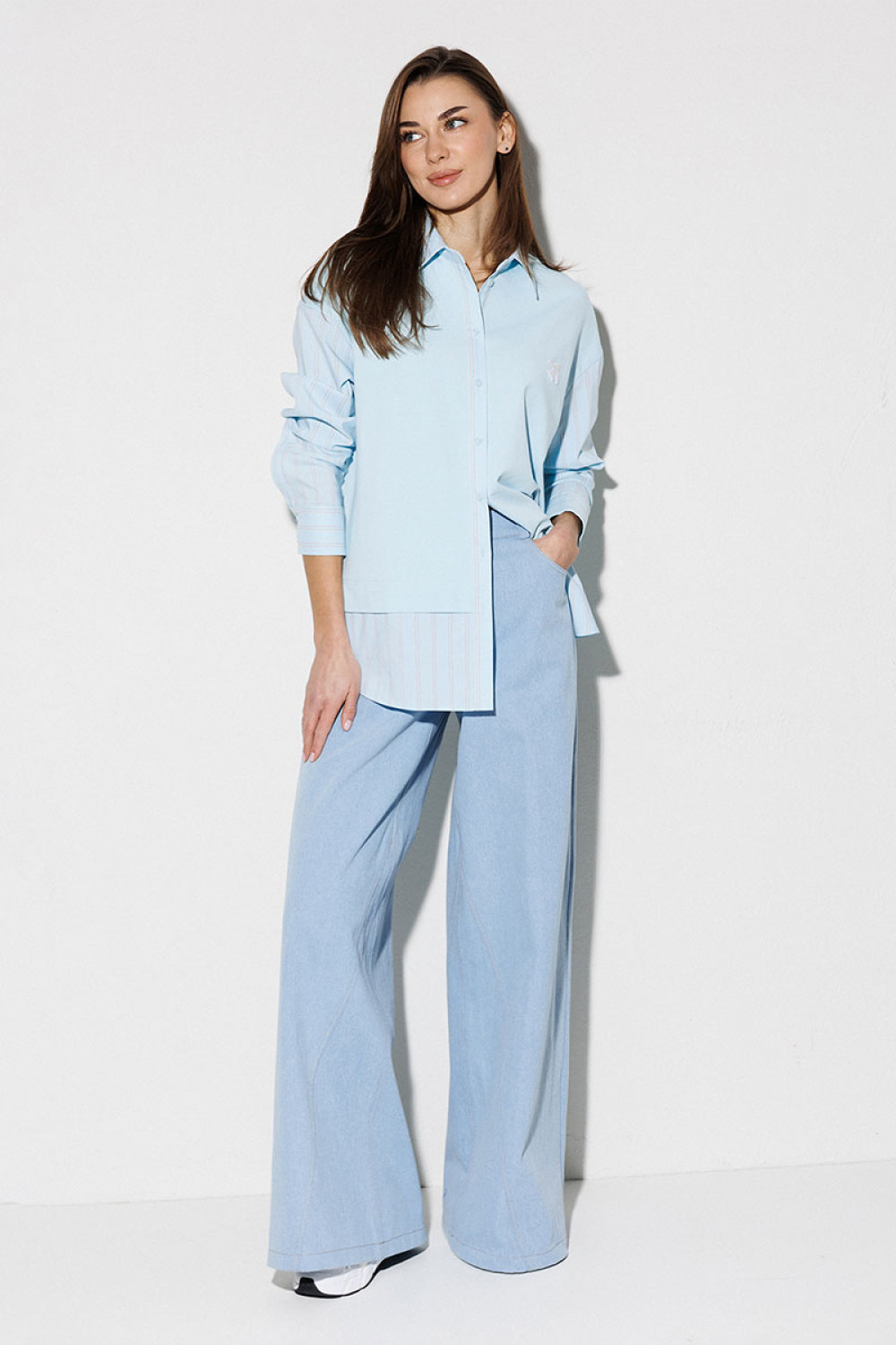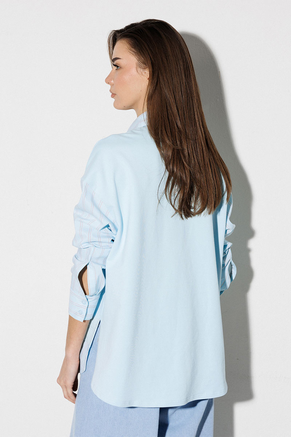 Блузка, комбинированная прямого силуэта, с втачным одношовным рукавом, со складкой и манжетой, с застежкой на петли-пуговицы и спущенной линией плеча. Полочка из трикотажа и рубашечной ткани с центральной застежкой на петли-пуговицы и вышивкой "Самолет". Спинка из трикотажа с печатью "BUTER". Воротник рубашечный отложной на стойке. Спинка и полочка с фигурным низом. Внизу по боковым швам обработаны разрезы.