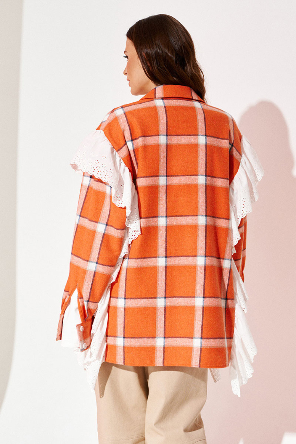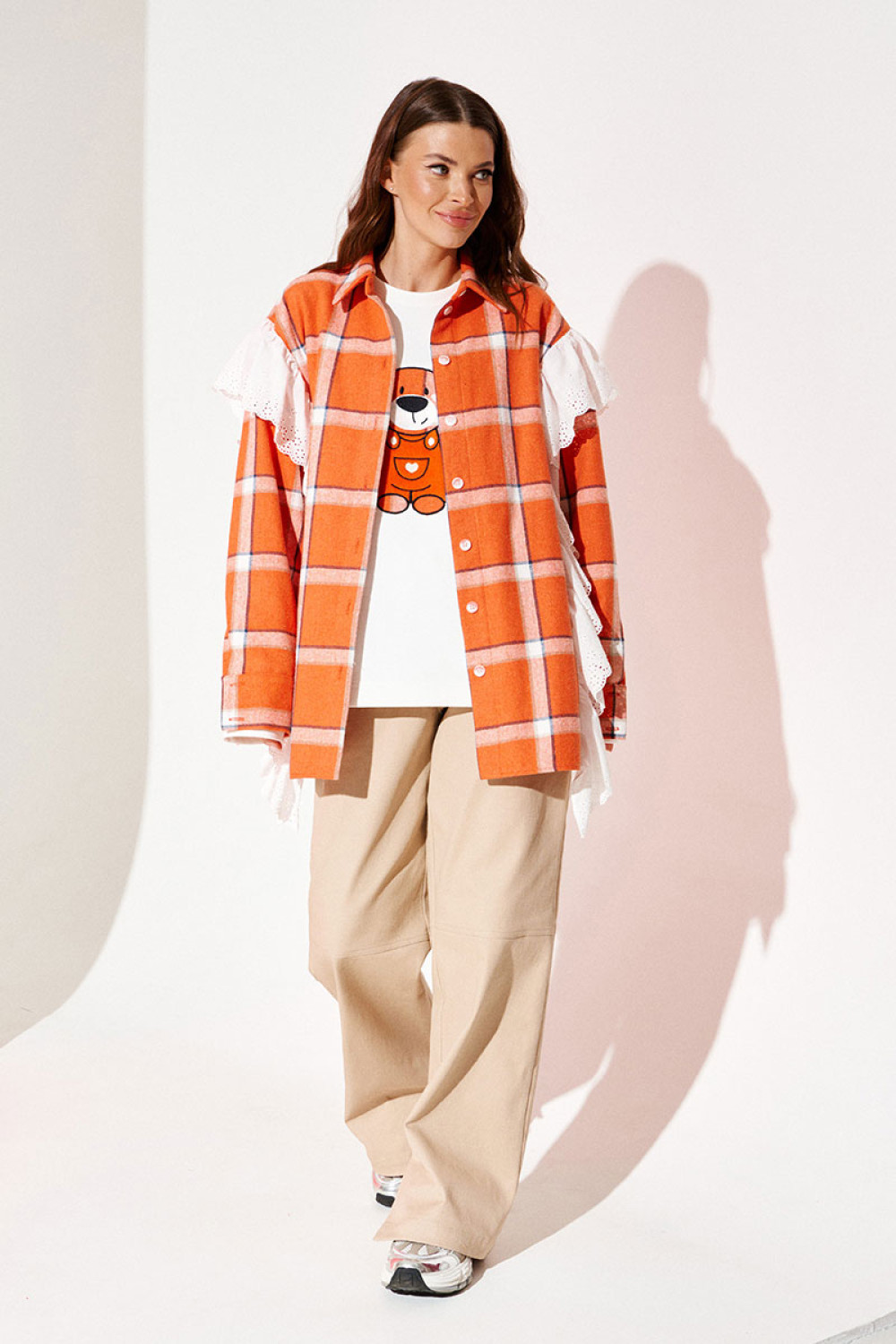 Рубашка свободного объема, прямого силуэта, с центральной застежкой на обметанные петли и пуговицы. Воротник «рубашечный», стояче-отложной на отрезной стойке. Перед и спинка с рельефами. Рельефы оформлены сборкой из кружева ришелье. Рукав втачной, одношовный, длинный, с отрезной манжетой. Манжета с застежкой на 1 обметанную петлю и 1 пуговицу.