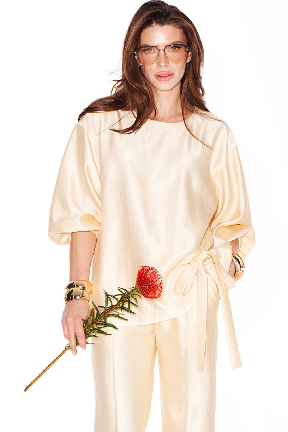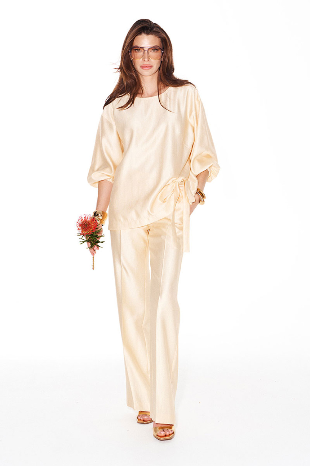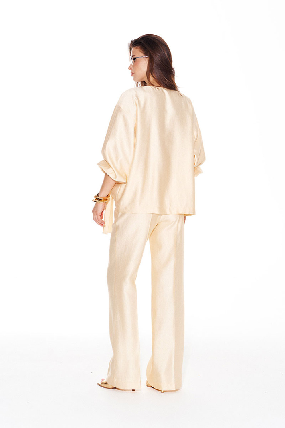 Блузка из костюмно-плательной ткани, свободного объема, прямого силуэта, с круглым вырезом горловины. Перед с нагрудными вытачками, с декоративной сборкой на резинку и бантом. Спинка цельная. Рукав 3/4, втачной, одношовный, с притачной манжетой со сборкой на резинку.
