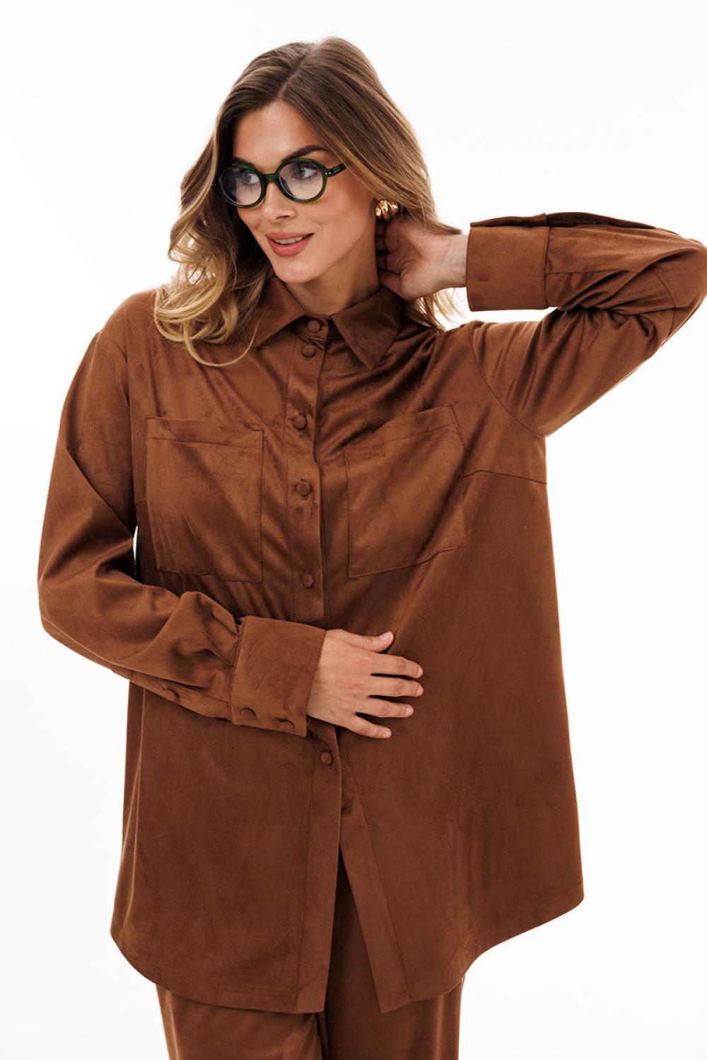 Блузка выполнена из тонкой искусственной замши. Блузка прямого силуэта, длиной до линии бедер. Спереди нагрудные карманы и центральная застежка с планкой на пуговицы. Спинка цельная. Воротник стояче-отложной с отрезной стойкой. Рукав втачной, одношовный. Низ рукава на притачной манжете с застежкой на пуговицы. Низ блузки фигурной формы.