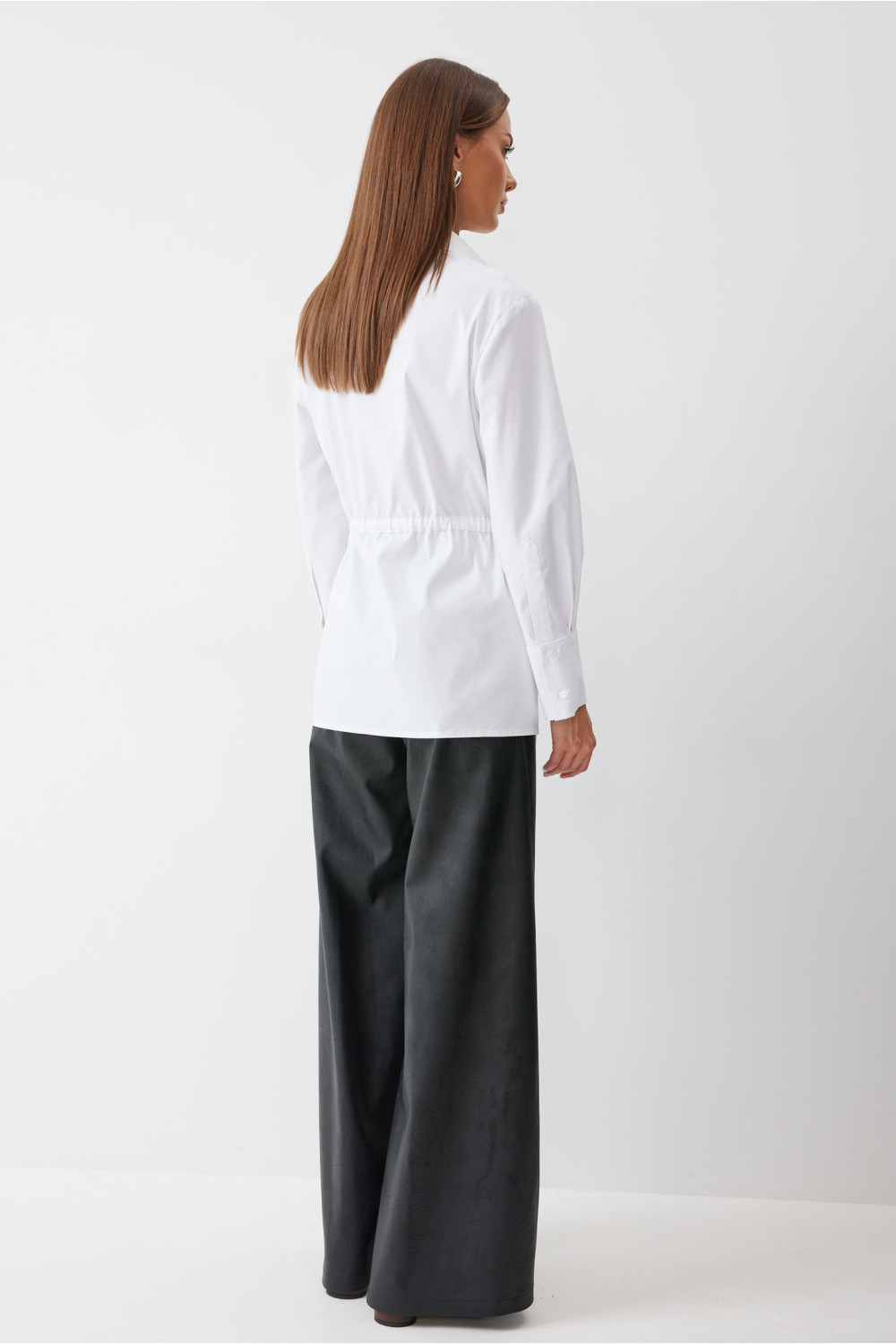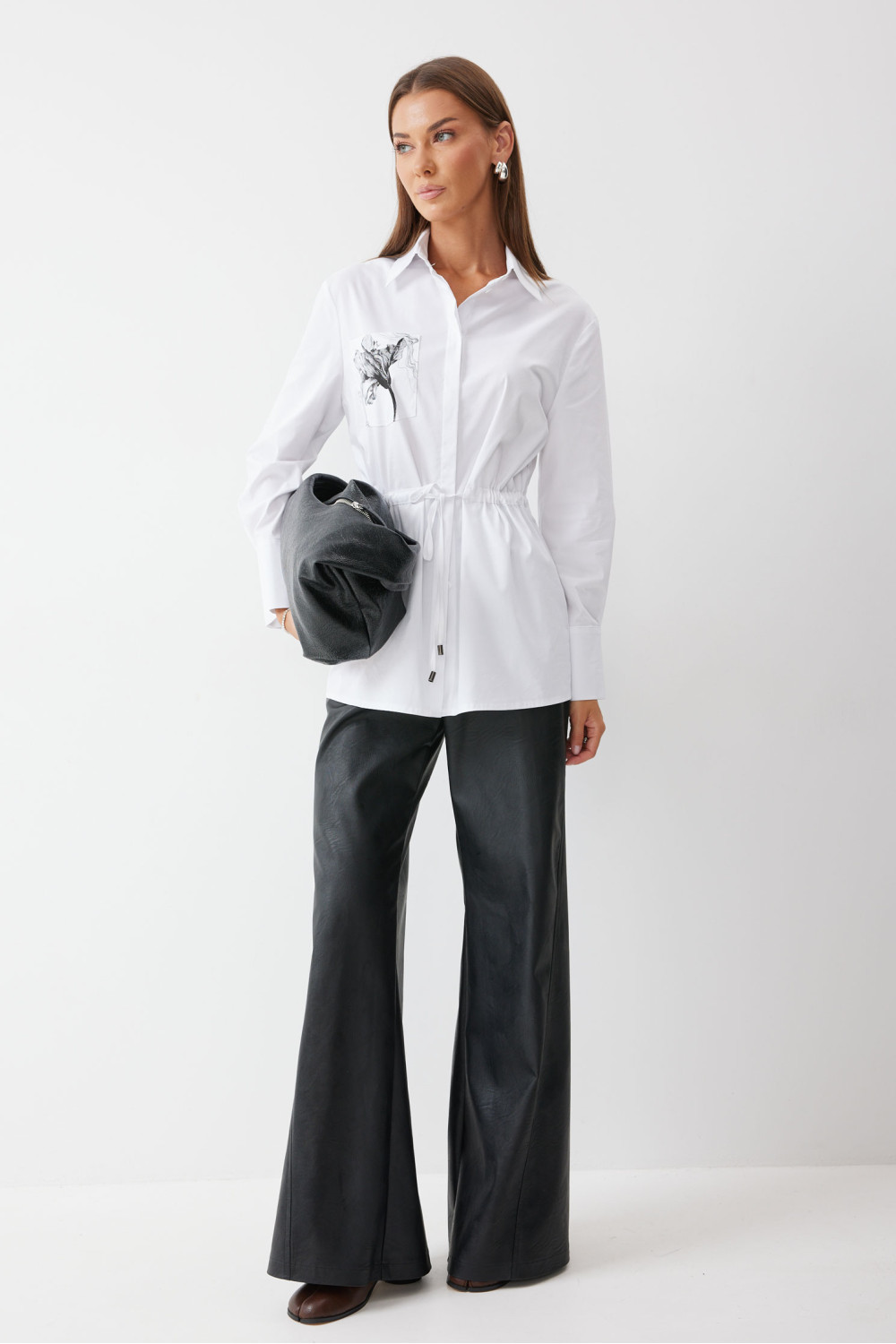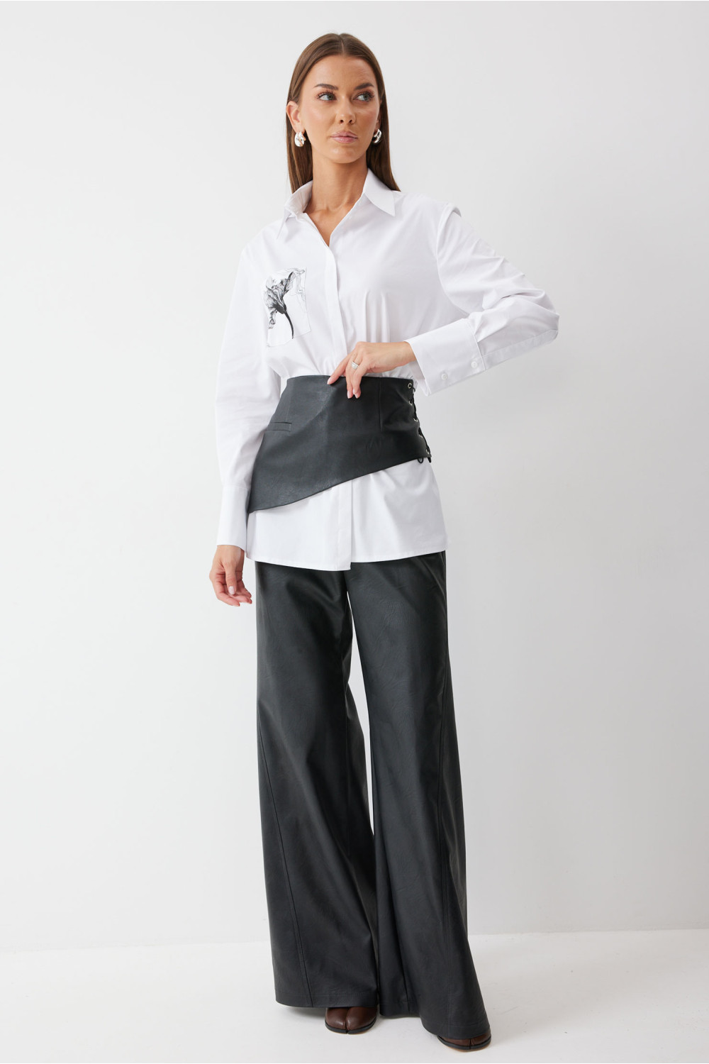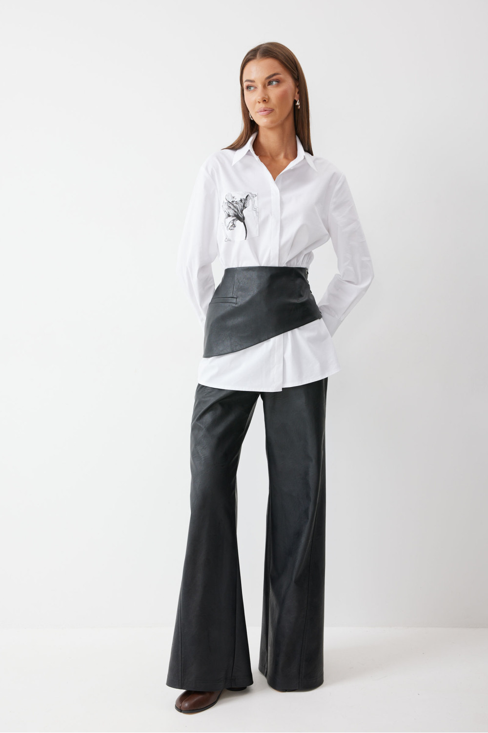 Блузка полуприлегающего силуэта. На уровне талии расположена кулиска с и завязками для регулирования степени прилегания. По центру супатная застежка, воротник рубашечный стояче-отложной. В верхней части полочки расположен накладной карман с дизайнерской печатью. Рукав втачной. Блузку дополняет съёмная деталь в виде баски из эко кожи, с шнуровкой в боковом шве.