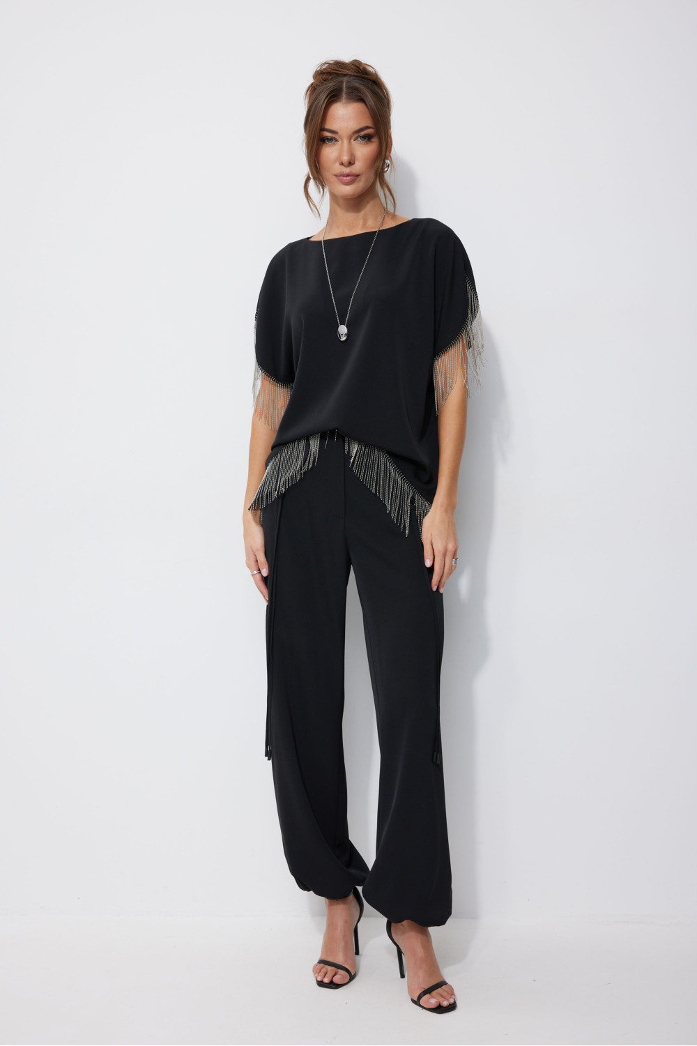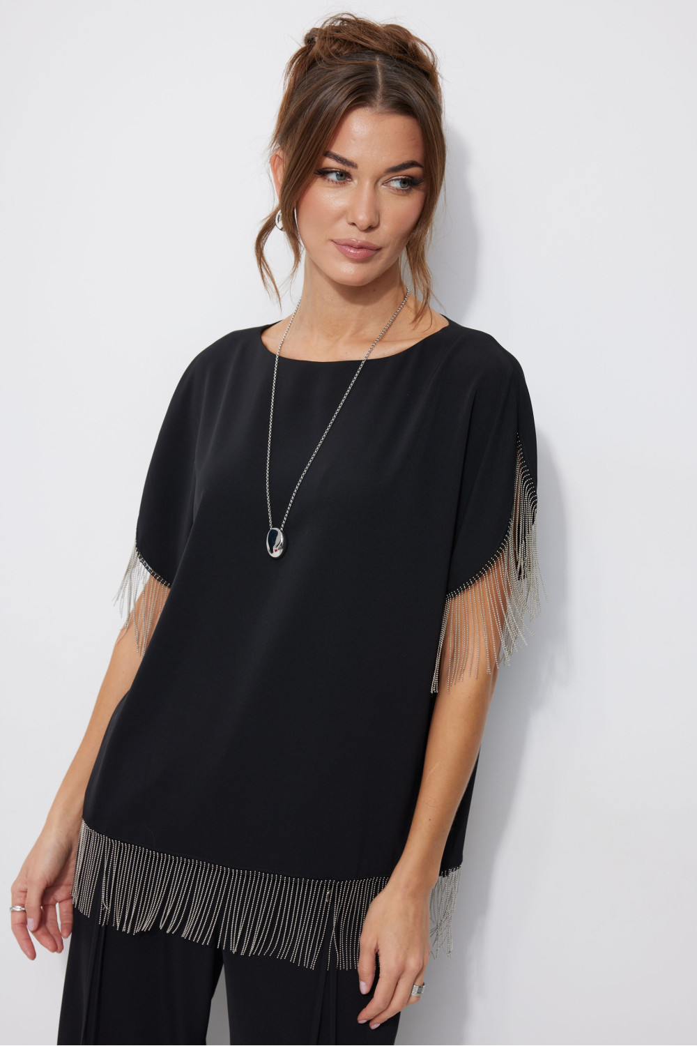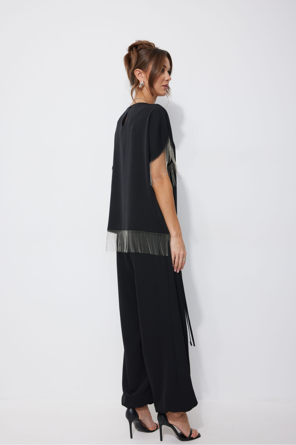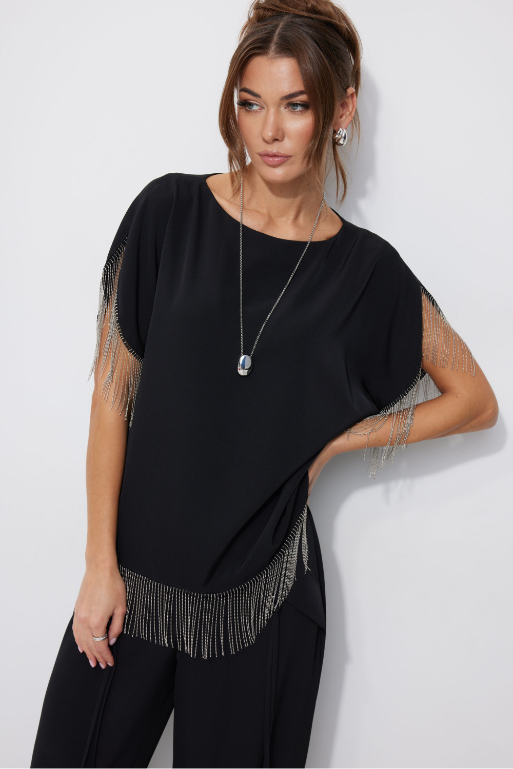 Блузка прямого силуэта из струящейся ткани. Горловина-лодочка, на спинке застежка на петлю и пуговицу. Рукав цельнокроеный с фигурным вырезом. По низу рукава и низу изделия декоративная тесьма. Обращаем ваше внимание, что фурнитура может отличаться от фото.