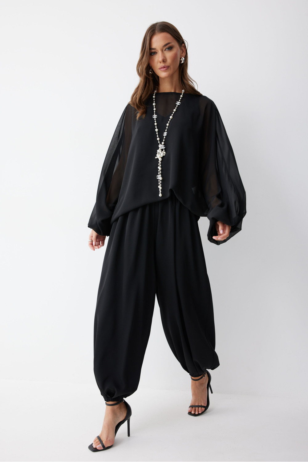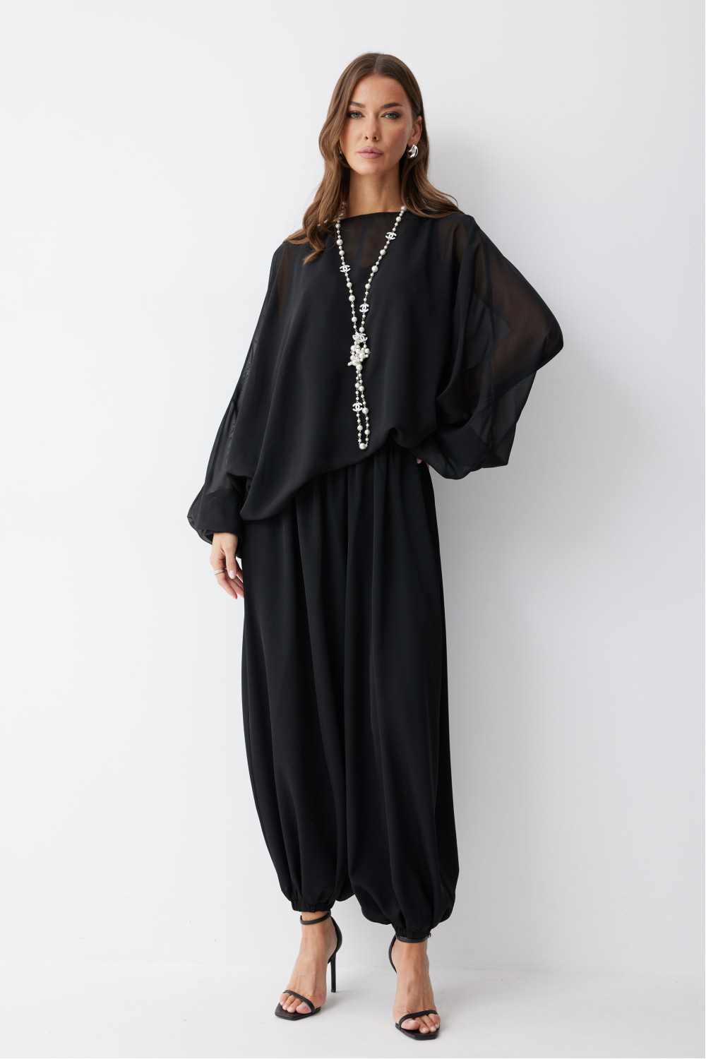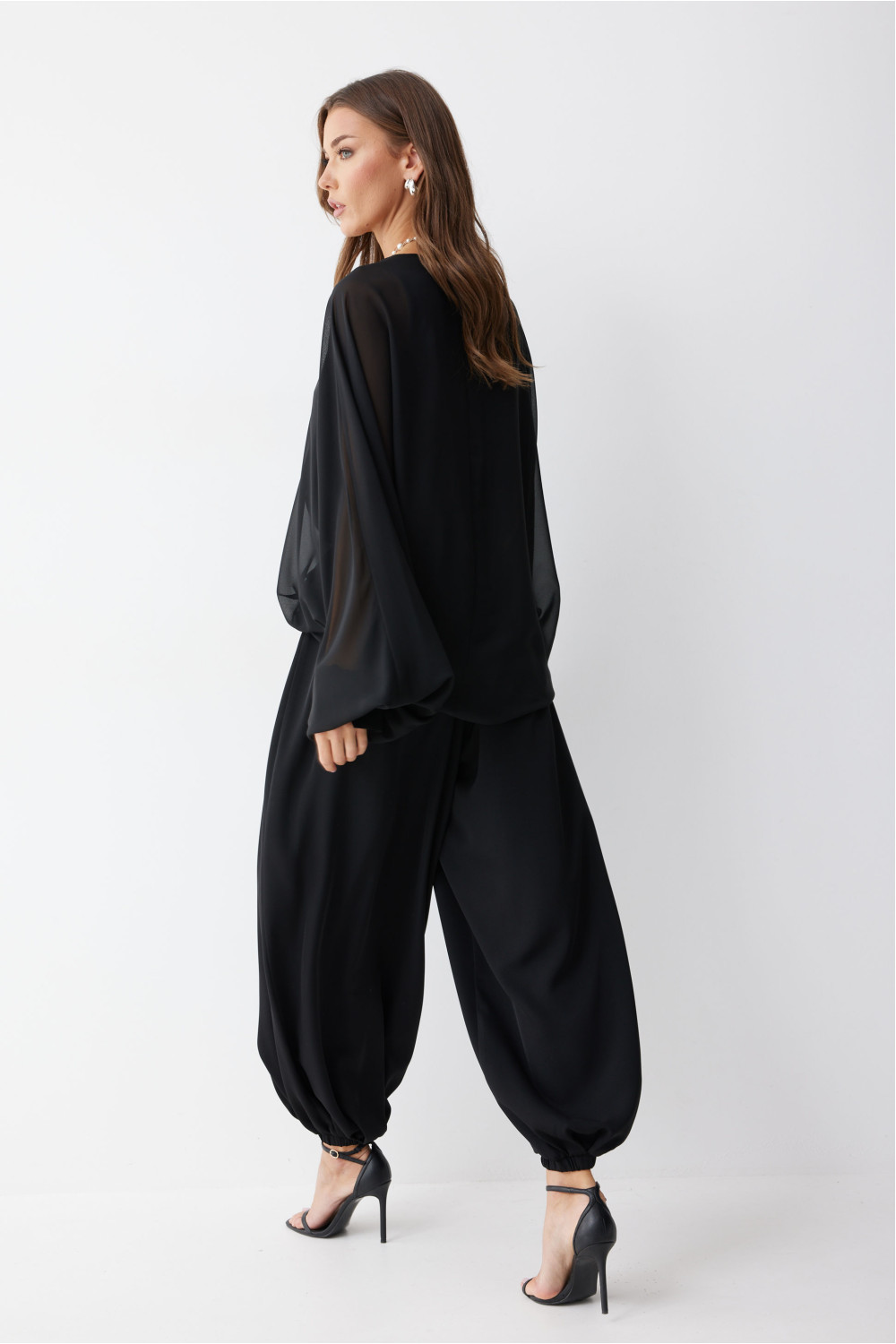 Блуза из шифона. Свободного, расширенного силуэта, с широким цельнокроеным рукавом со сборкой по нижнему срезу. Рукав с манжетой, манжета с застежкой на петлю с пуговицей. Горловина овальной формы. Застежка по среднему шву спинки на петлю с пуговицей. Нижняя блуза из струящейся ткани. Силуэт прямой, свободный. С глубоким V- образным вырезом горловины по переду. С нагрудными вытачками. Украшение в комплект не входит!!