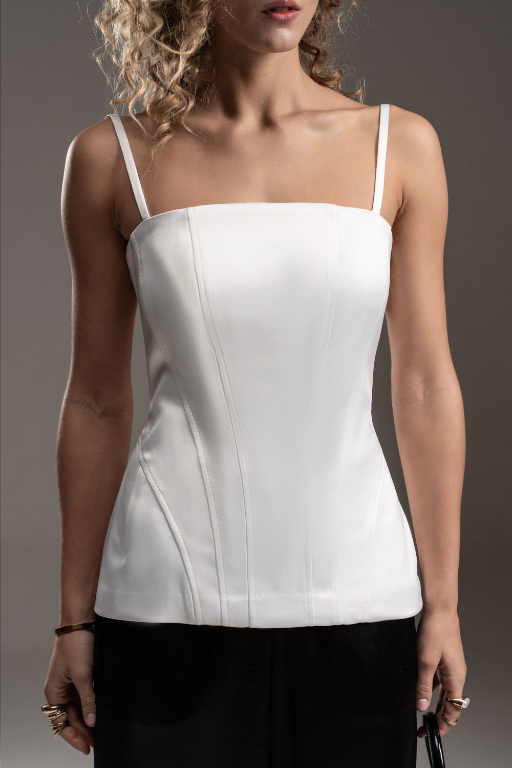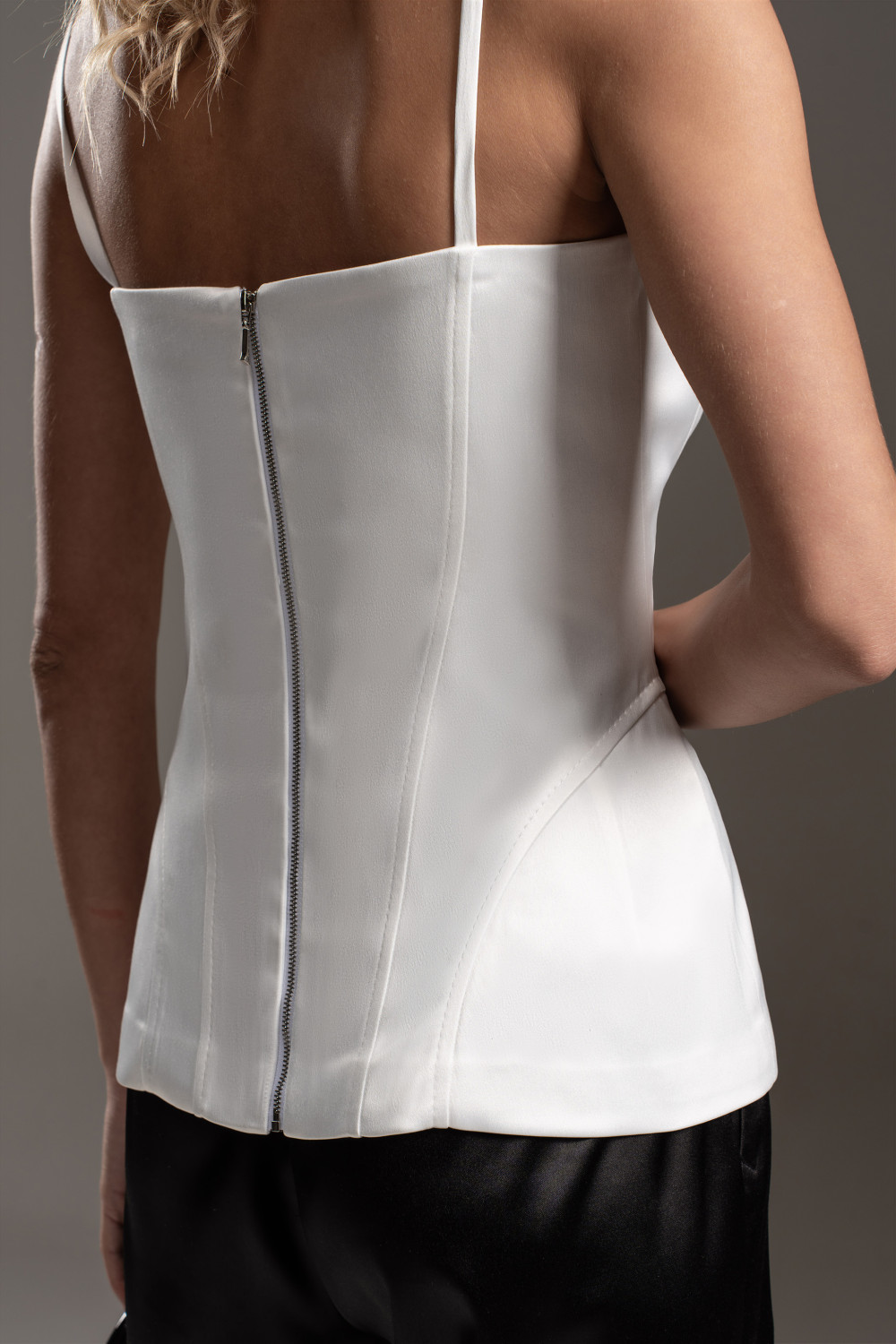 Удлиненный корсет из шелковистой ткани с деликатным сатиновым блеском. Корсет на брителях. Застежка - разъемная металлическая молния в центральном шве спинки. Объемный крой на бедрах подчеркивается выверенными конструктивными линиями. Силуэт "песочные часы" подчеркивает женственность. Корсет как модный тренд можно использовать в самых разных стилях: повседневном, деловом и вечернем.