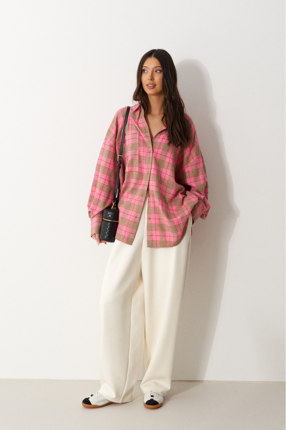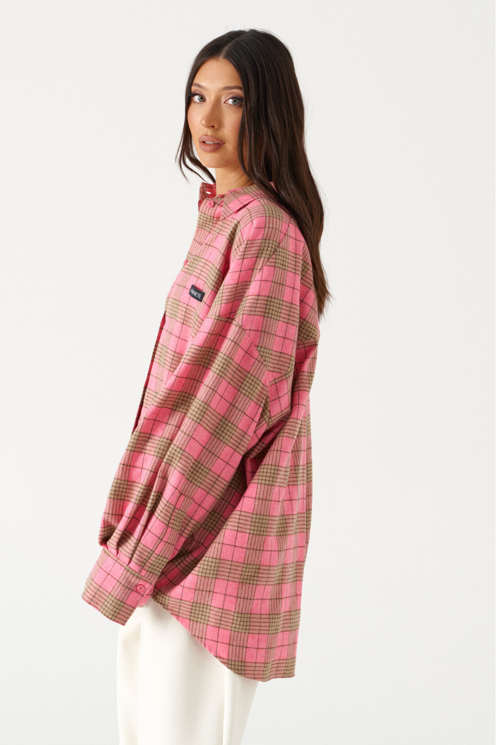 Рубашка прямого свободного кроя, выполнена из ворсистого полотна розового цвета в коричневую клетку. Характеристика: воротник отложной, застёжка центральная на пуговицы, по переду справа на уровне линии груди карман, слева - брендированная нашивка Annete, рукав спущенный свободный, с широкой манжетой на пуговице, спинка отрезная с скоалками.