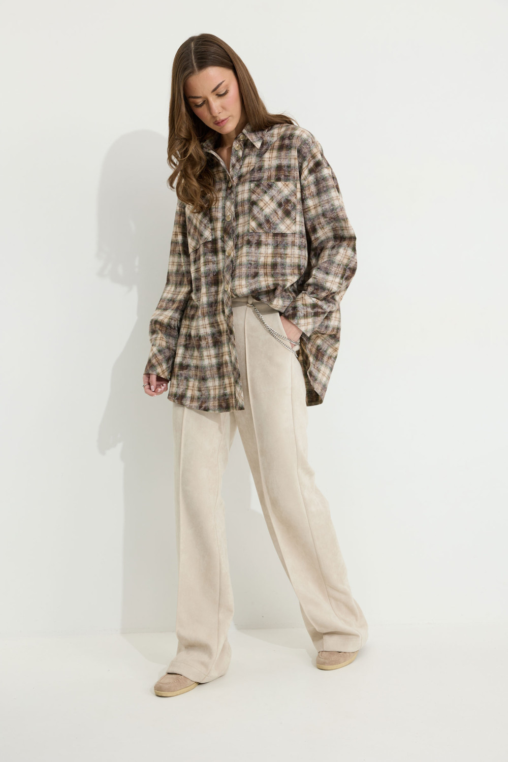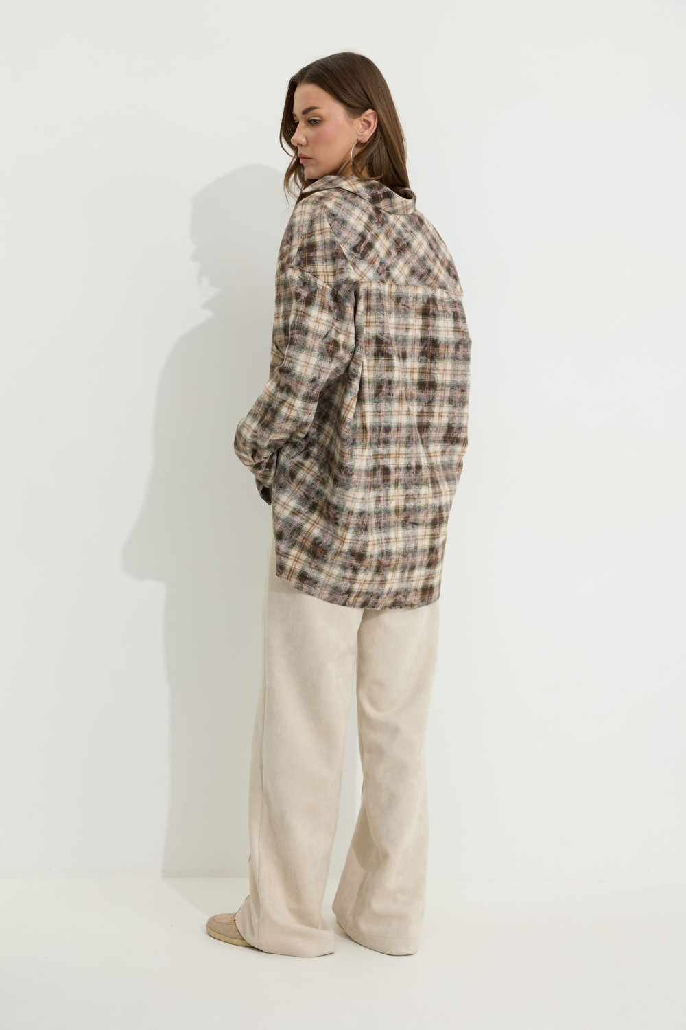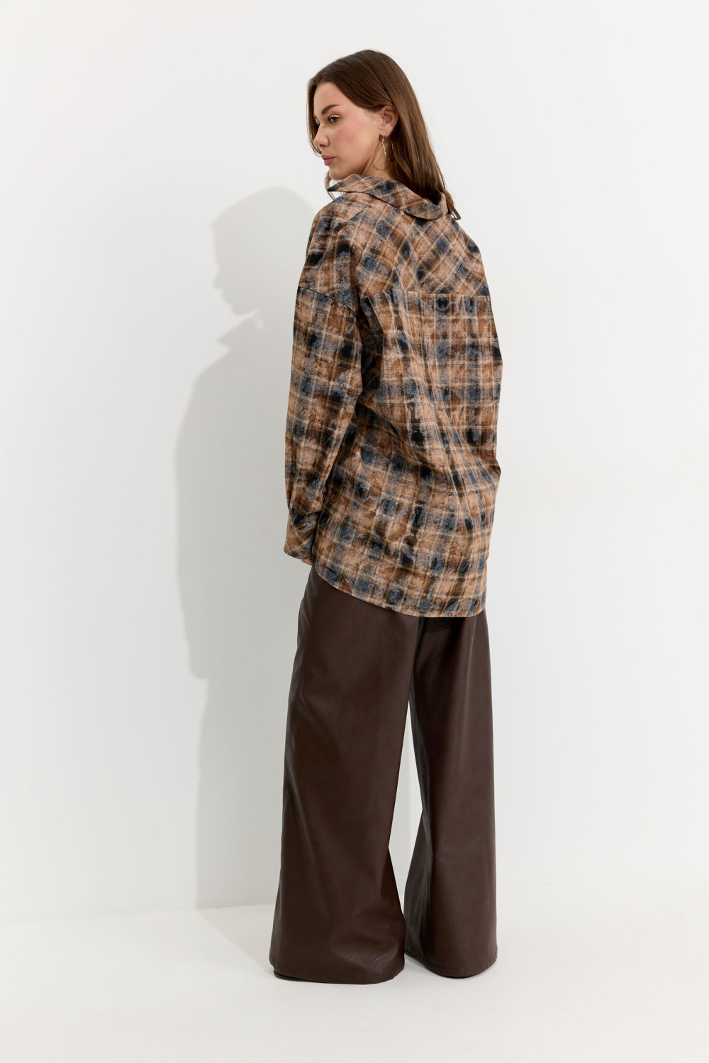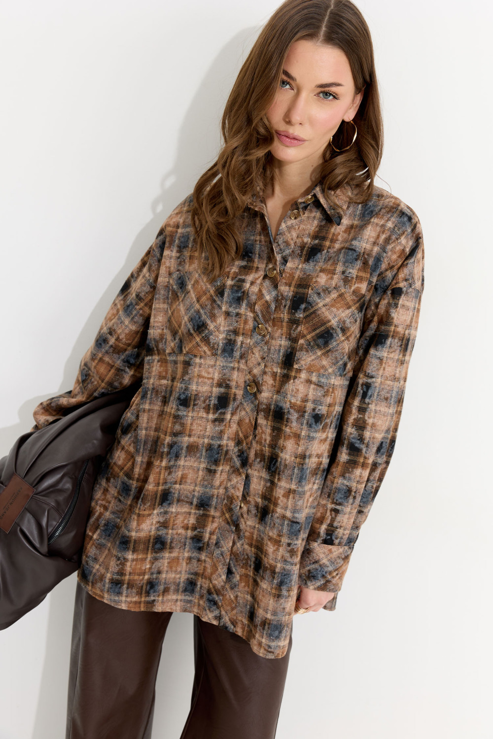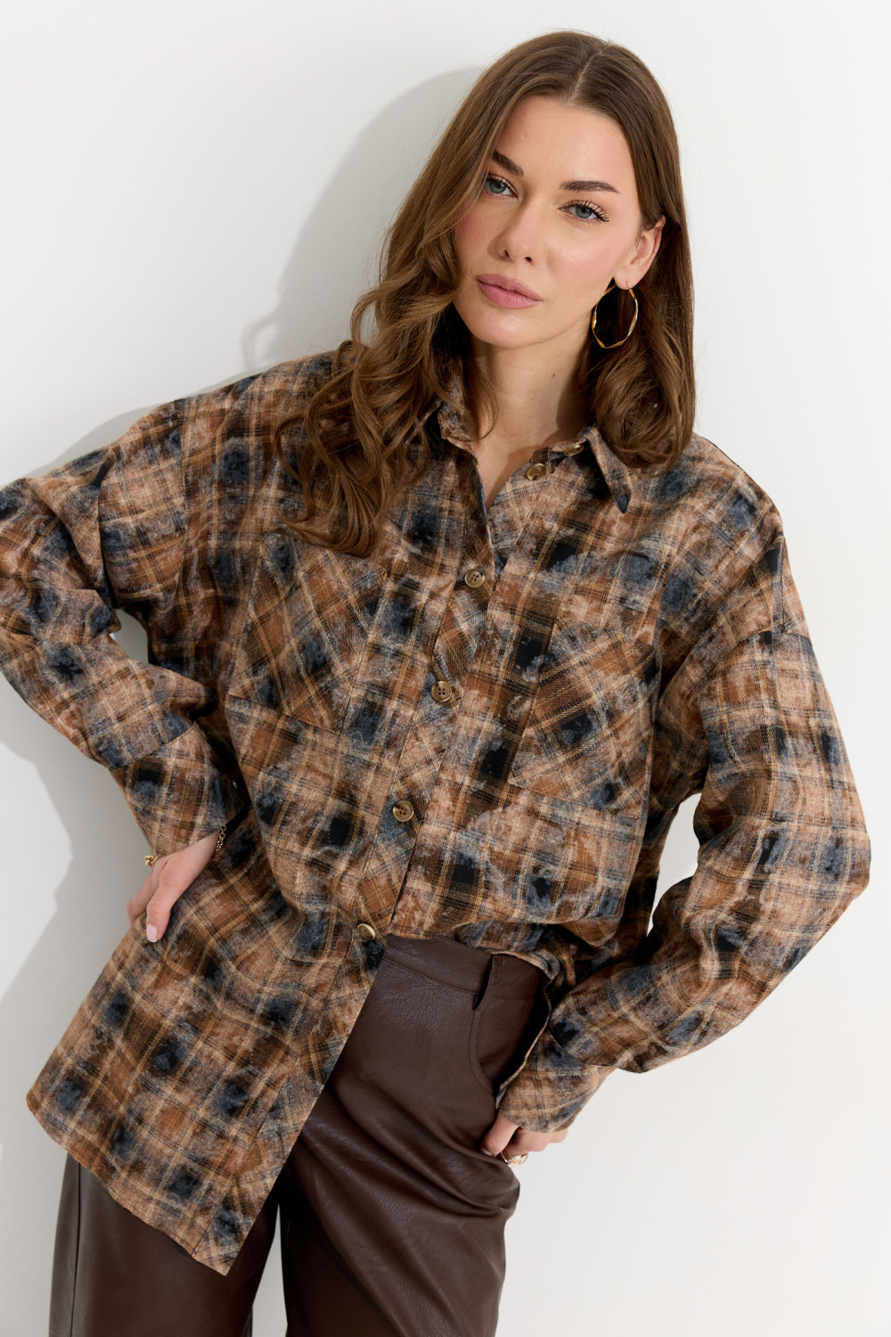 Блузка прямого силуэта из плательно-костюмной ткани с фигурным низом. Воротник стояче-отложной с отрезной стойкой, по центру застежка на петли и пуговицы. Рукав со спущенной линией плеча, по низу манжета с застежкой на петли и пуговицы. По переду накладные карманы. На спинке кокетка со складками.