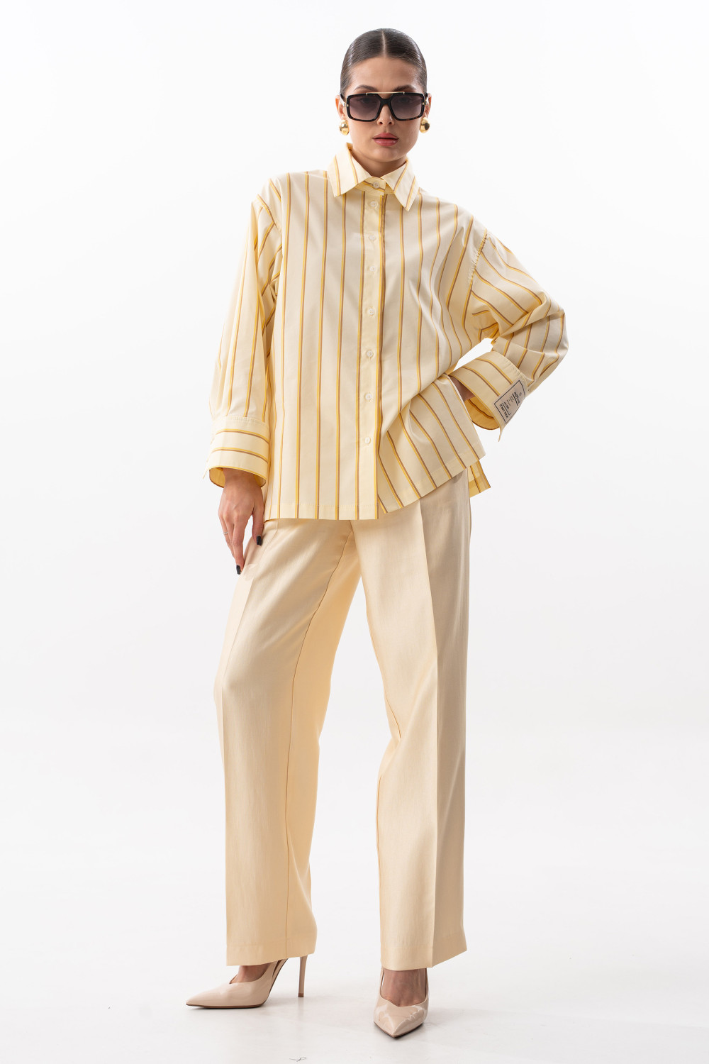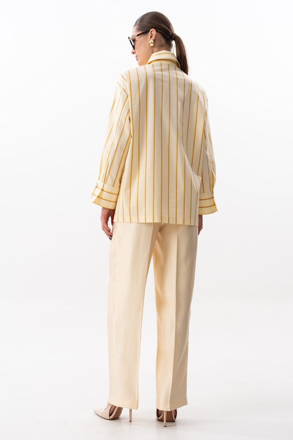 Стильная рубашка свободного, прямого силуэта в модном принте "полоска". Рукав на спущенной пройме, с притачной манжетой, застегивающейся на 2 пуговицы ( вторая пуговица служит для регулирования ширины манжета ). В боковых швах разрезы. Воротник стояче-отложной с отрезной стойкой.