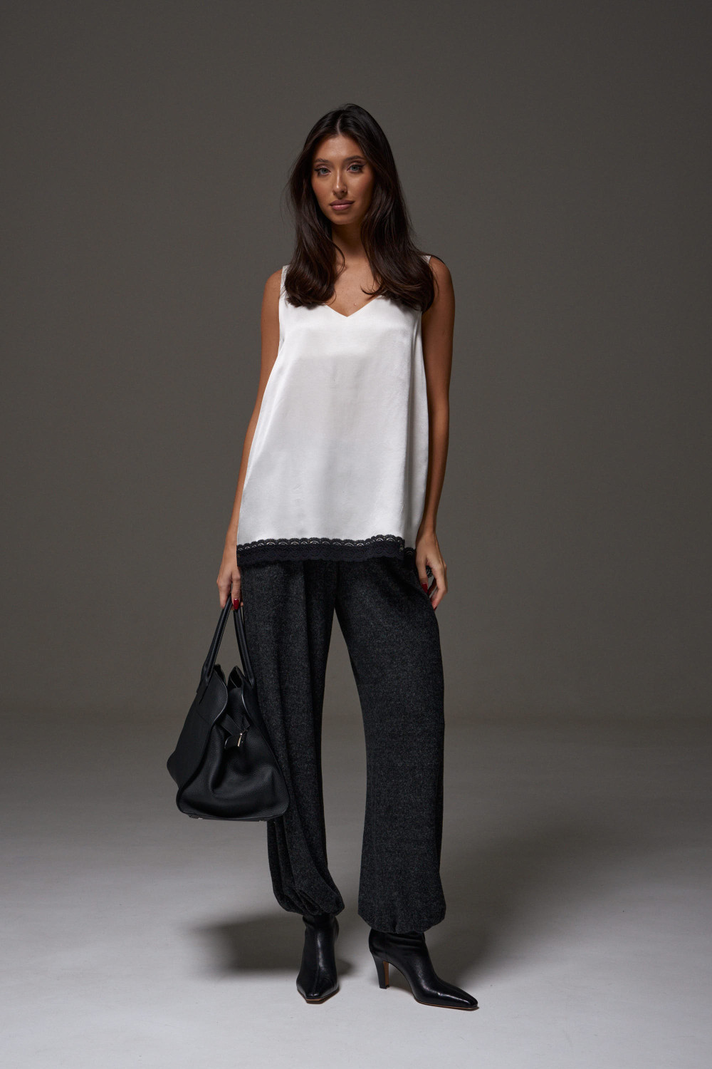 Блузон в крое трапеция, выполнен из струящейся ткани молочного цвета. Характеристика: крой трапеция - расширяется к низу, широкие бретели, спереди v-образный вырез, по спинке овальная горловины, спинка изделия чуть удлиненна, по низу изделия черное кружево.