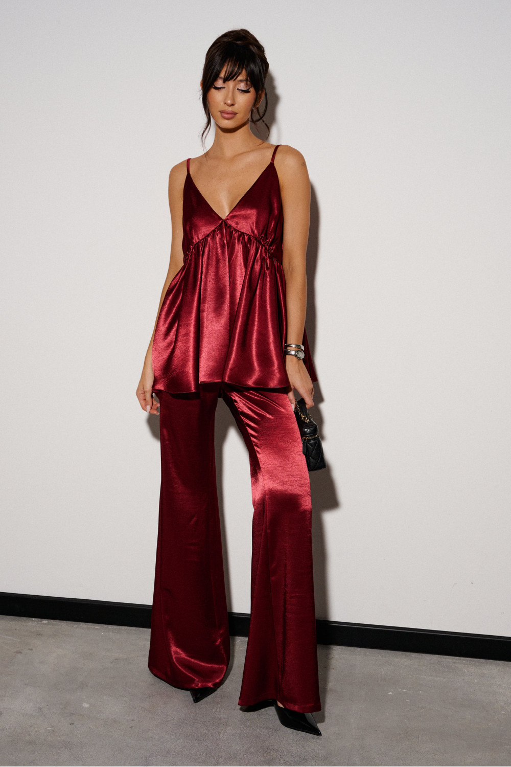 Топ свободного кроя. Выполнен из мягкой струящейся ткани бордового цвета. Вырез декольте V-образный. Лиф двойной, с фигурным отрезом. Бретели регулируемые.