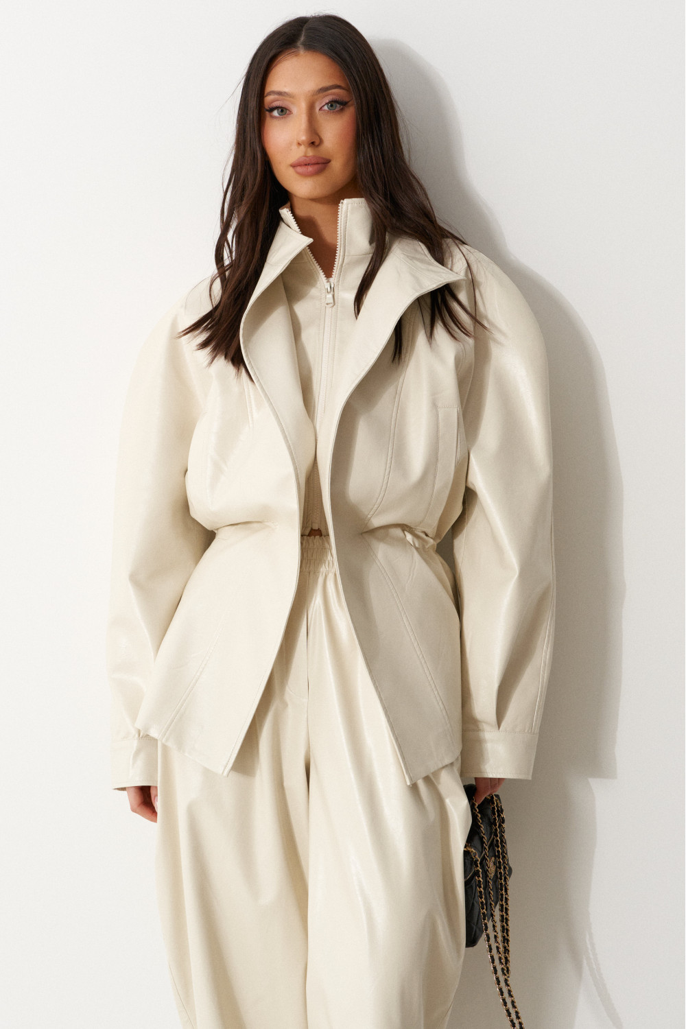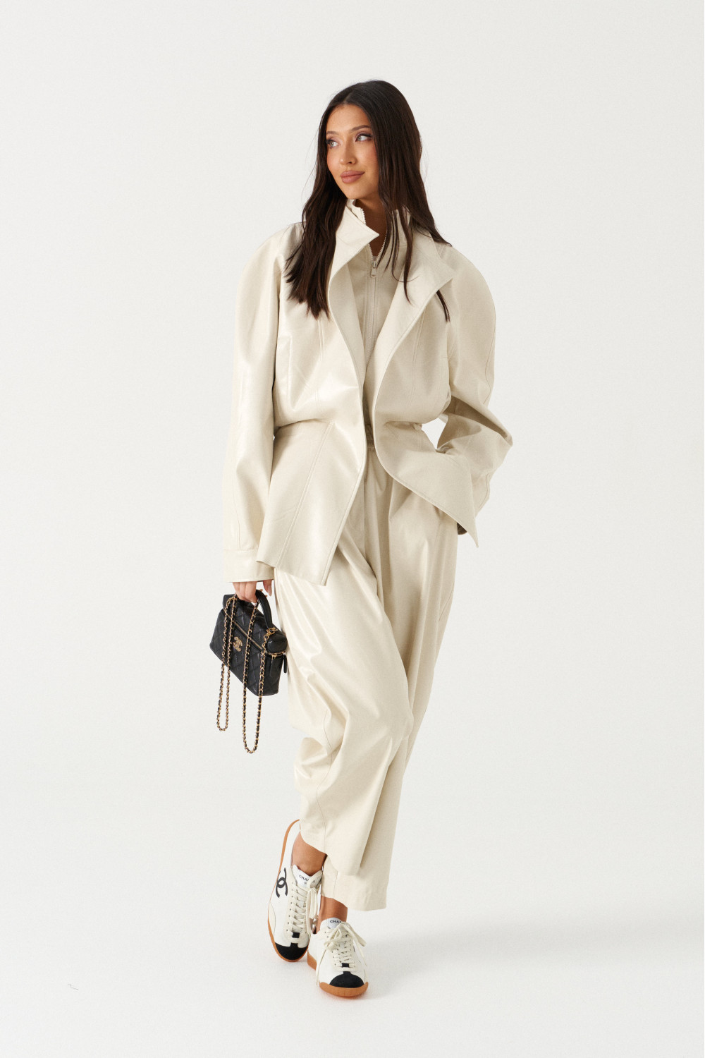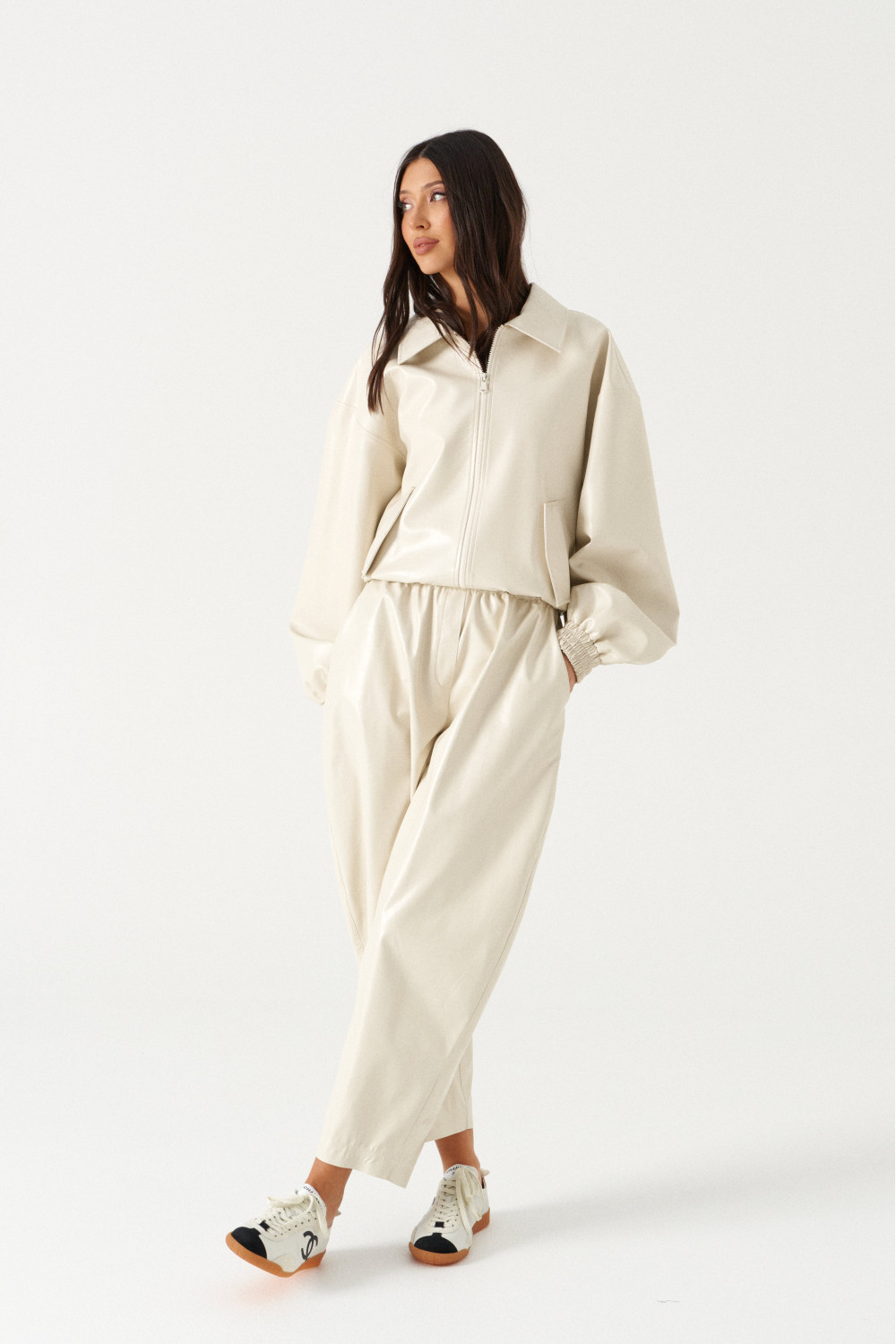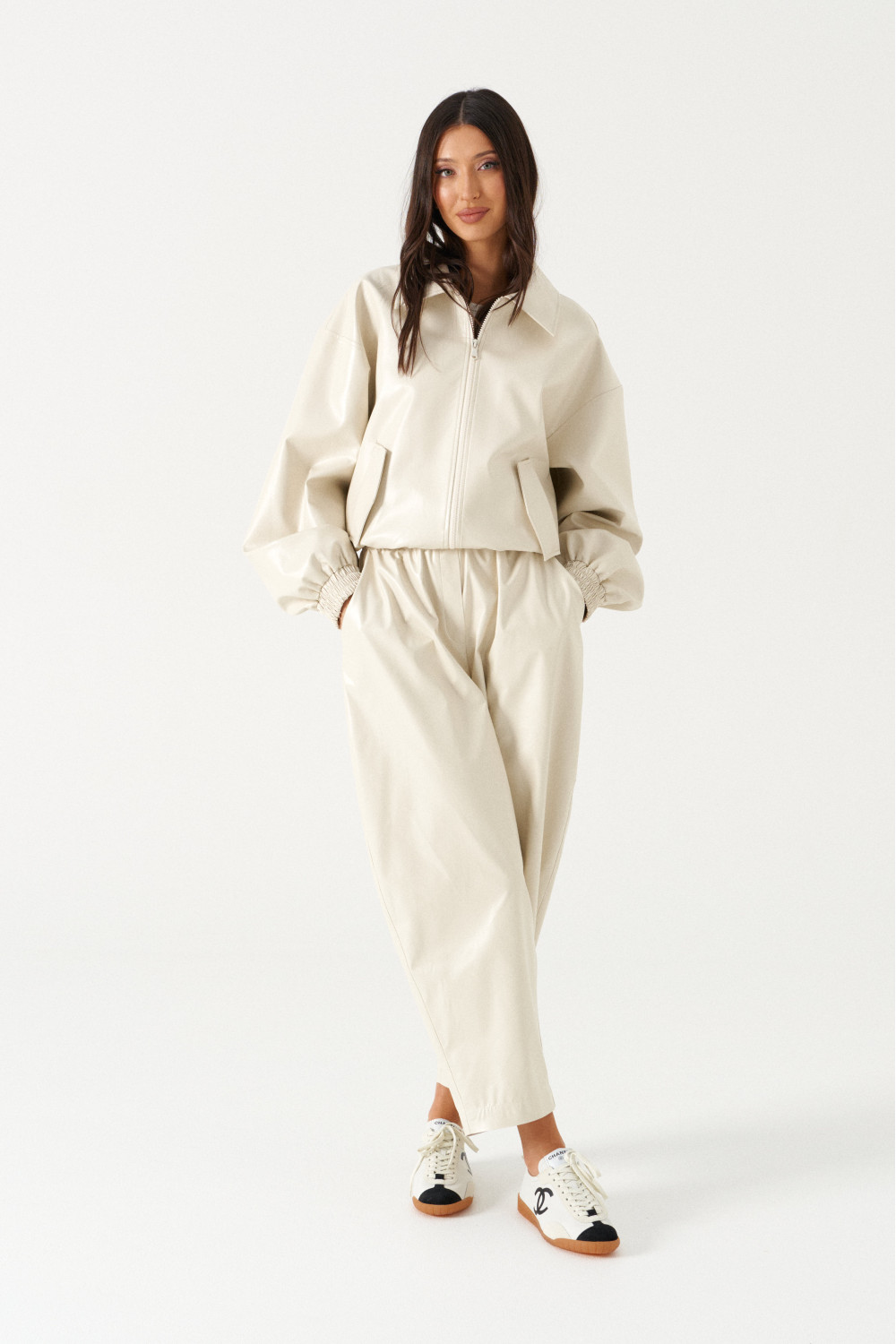 Брюки свободного кроя зауженные к низу, выполненные из эко-кожи имолочного цвета. Характеристика: свободный крой, брючины заужаются к низу, пояс на резинке, имитация гульфика, в боковых швах карманы.
