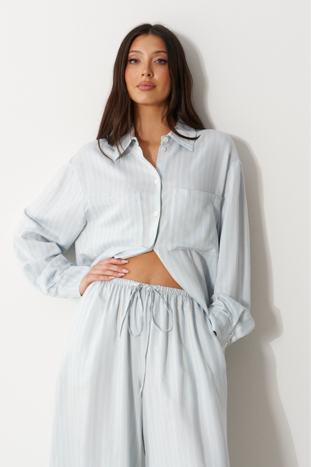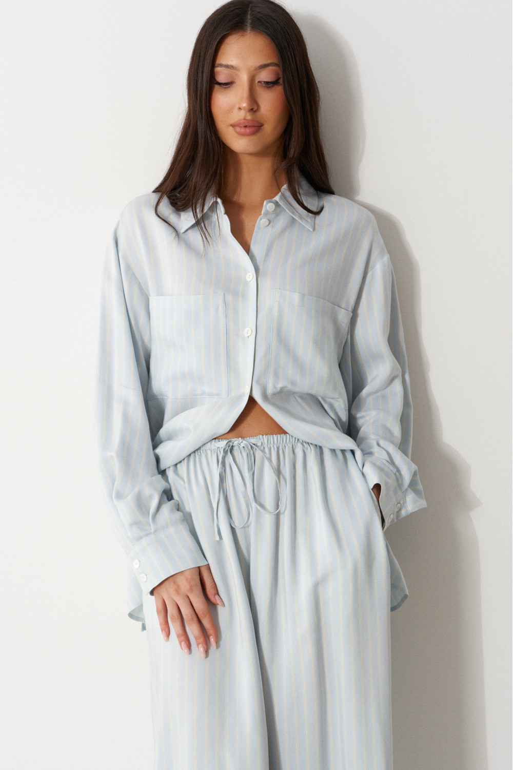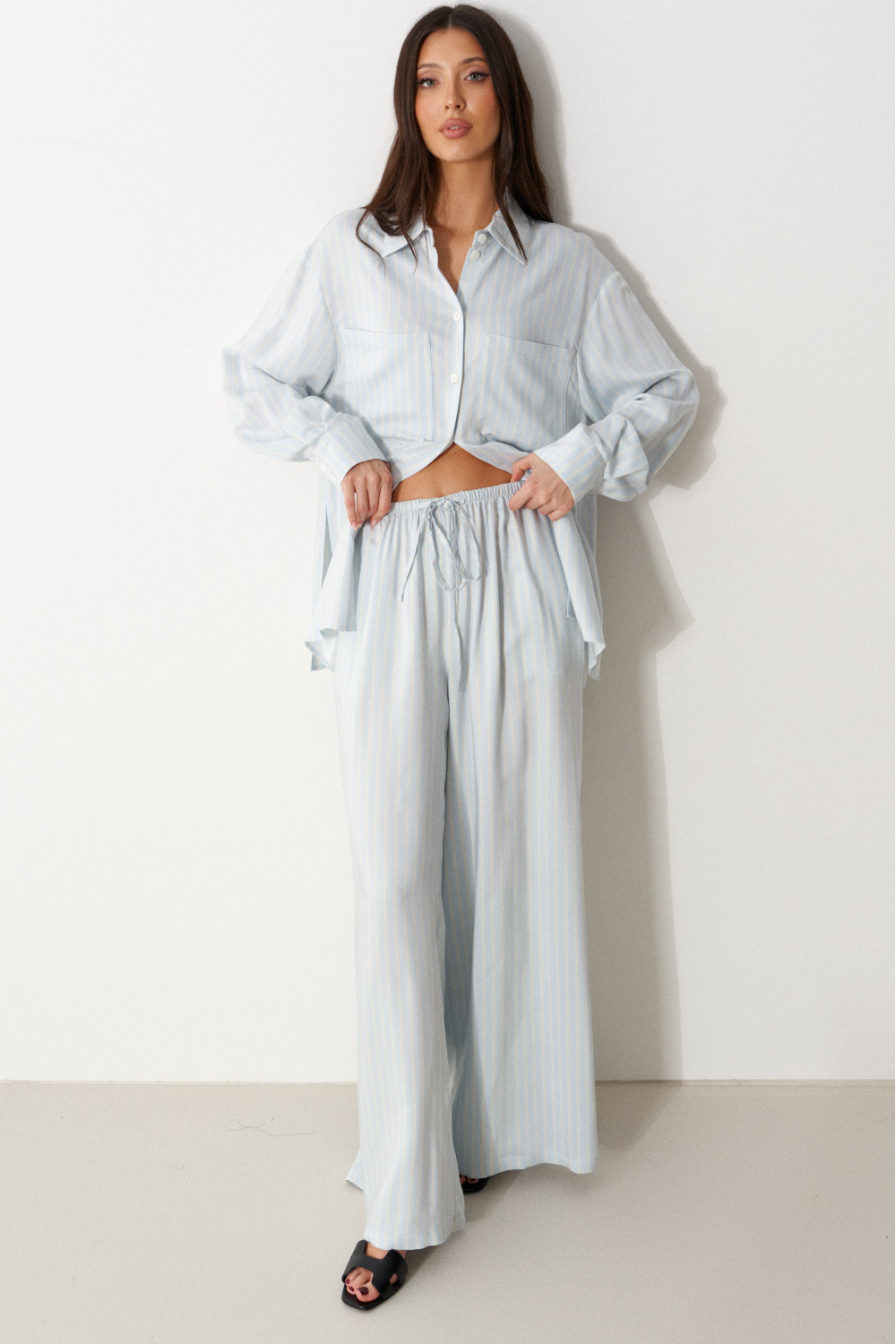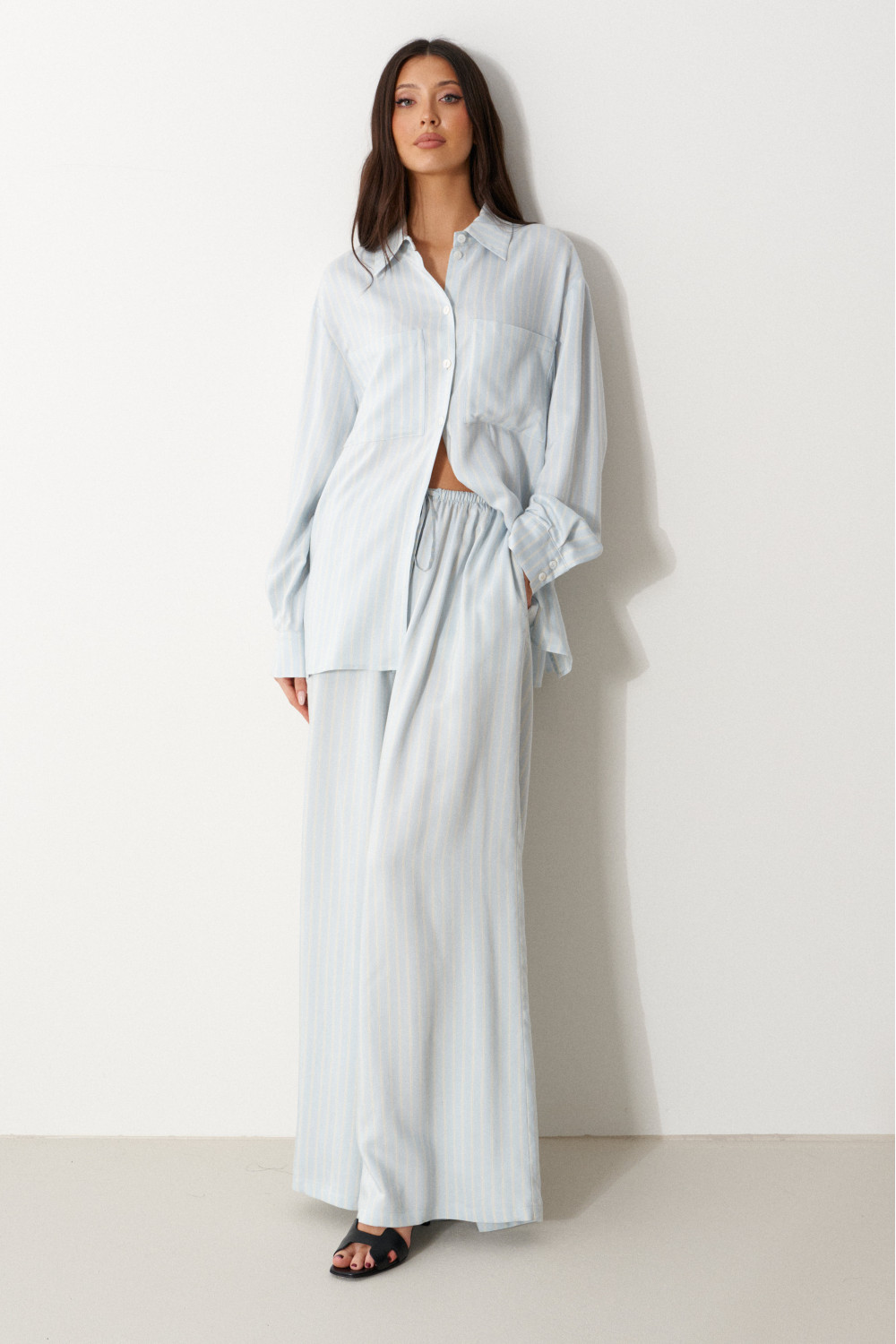Брюки свободного кроя. Выполнены из мягкой струящейся ткани голубого цвета с белой полоской. Пояс на резинке, со шнурочком. В боковых швах карманы.
