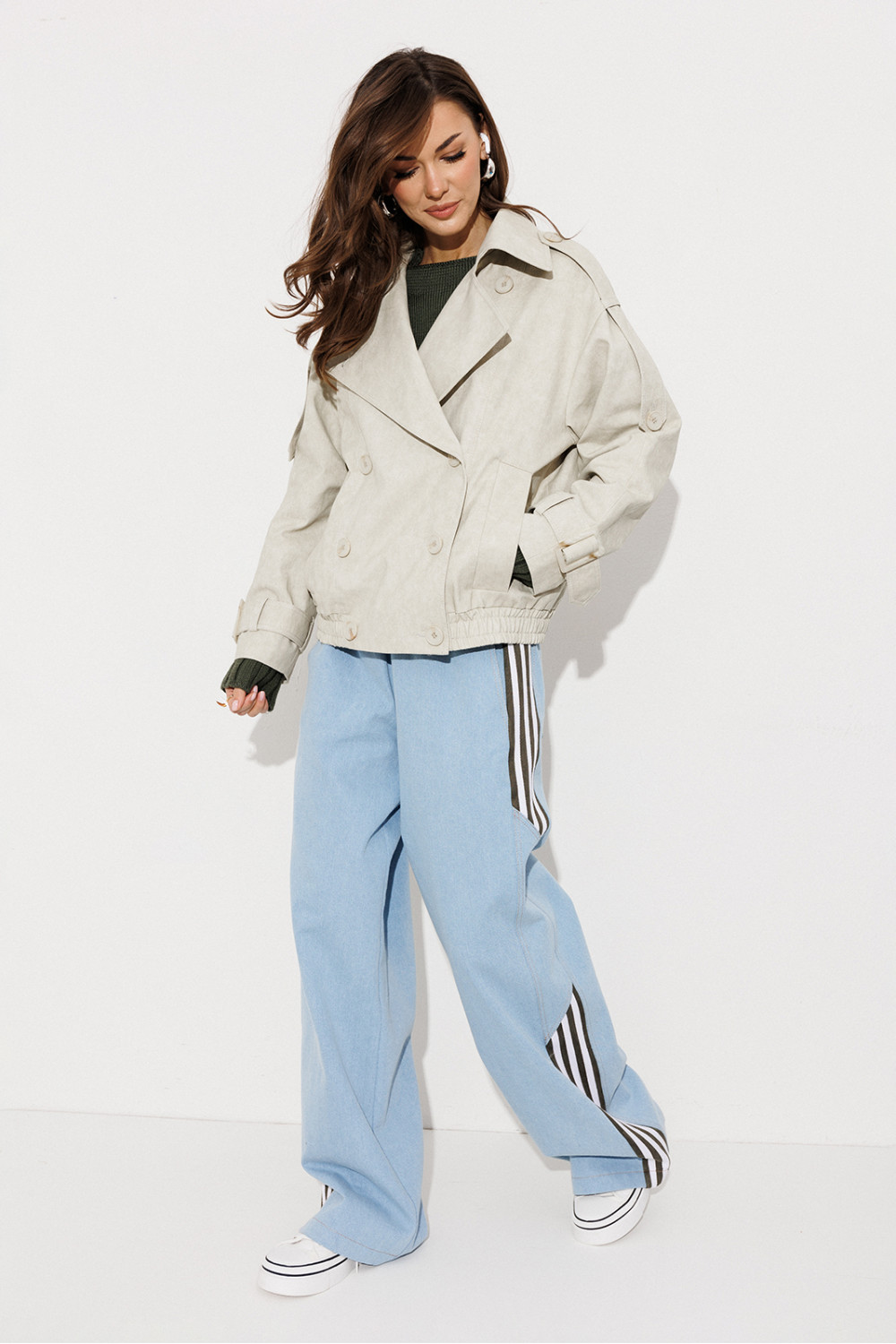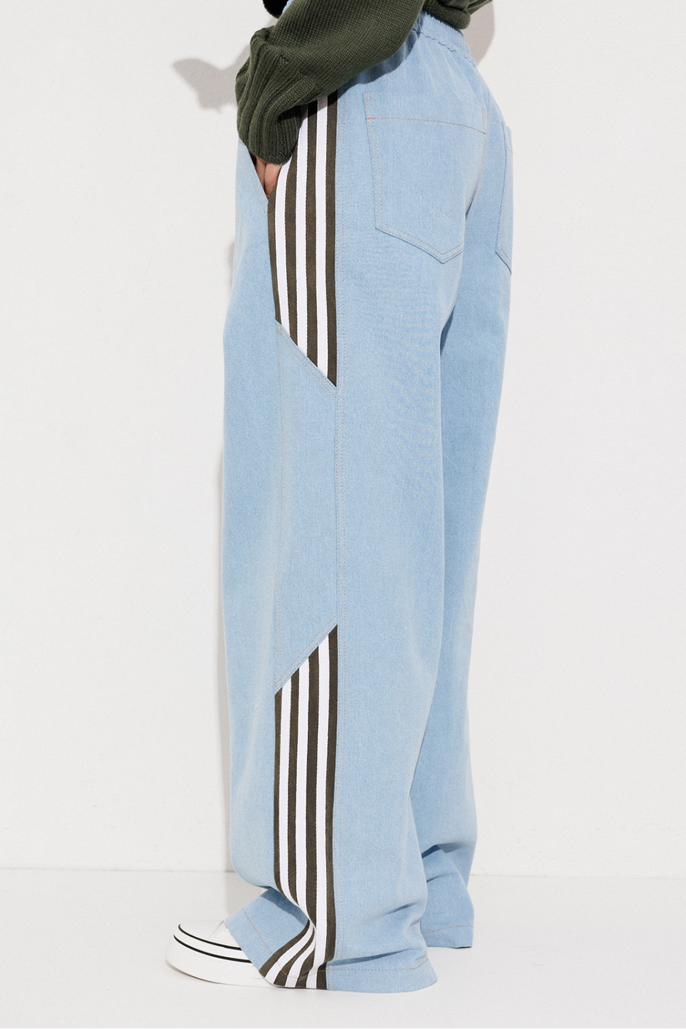Брюки-джинсы, комбинированные, прямого силуэта. На притачном отстроченном поясе с втянутым в него декоративным шнурком. Перед и спинка выполнены из джинса. По переду карманы в шве с наклонным входом. По спинке накладные карманы с нашивкой "BUTER". По бокам отрезной бочок, комбинированный из замшевой отделочной ткани, по которой отстрочено 3 узких лампаса и центральная вставка из джинса.