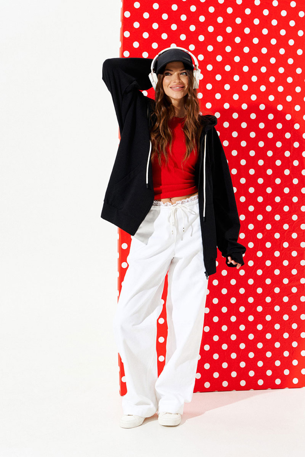 Брюки свободного объема, прямые. Застежка-гульфик на молнии. На передних половинках карманы с отрезным бочком и вытачки на уровне колена. На задних половинках брюк талиевые вытачки и накладные карманы. Пояс обработан обтачкой с отделочной строчкой, образующей кулиску, в которую продет декоративный шнур-завязка с наконечниками. Верхний срез пояса с вставкой из кружева. Пояс с застежкой на 1 петлю и 1 пуговицу.