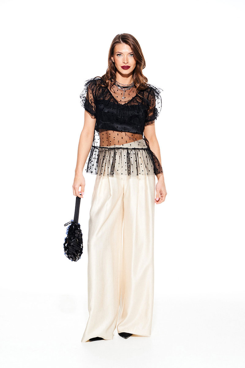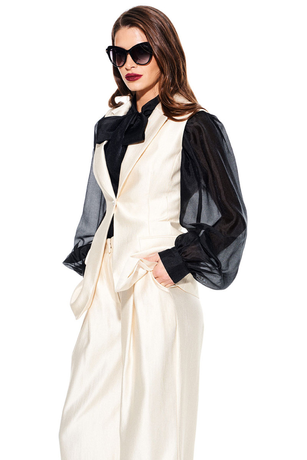 Брюки свободного объема, расширенные к низу. На передних половинках выполнены боковые карманы с отрезным бочком и встречные складки. На задних половинках талиевые вытачки. Застежка – гульфик на молнии. Пояс притачной, с резинкой по спинке, застежкой на крючок и потайную пуговицу.
