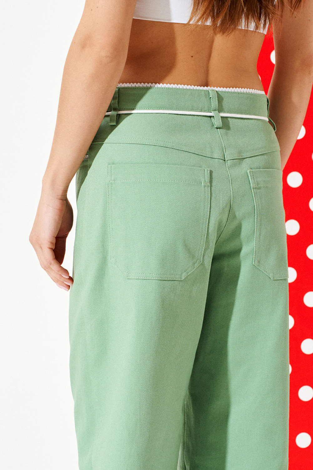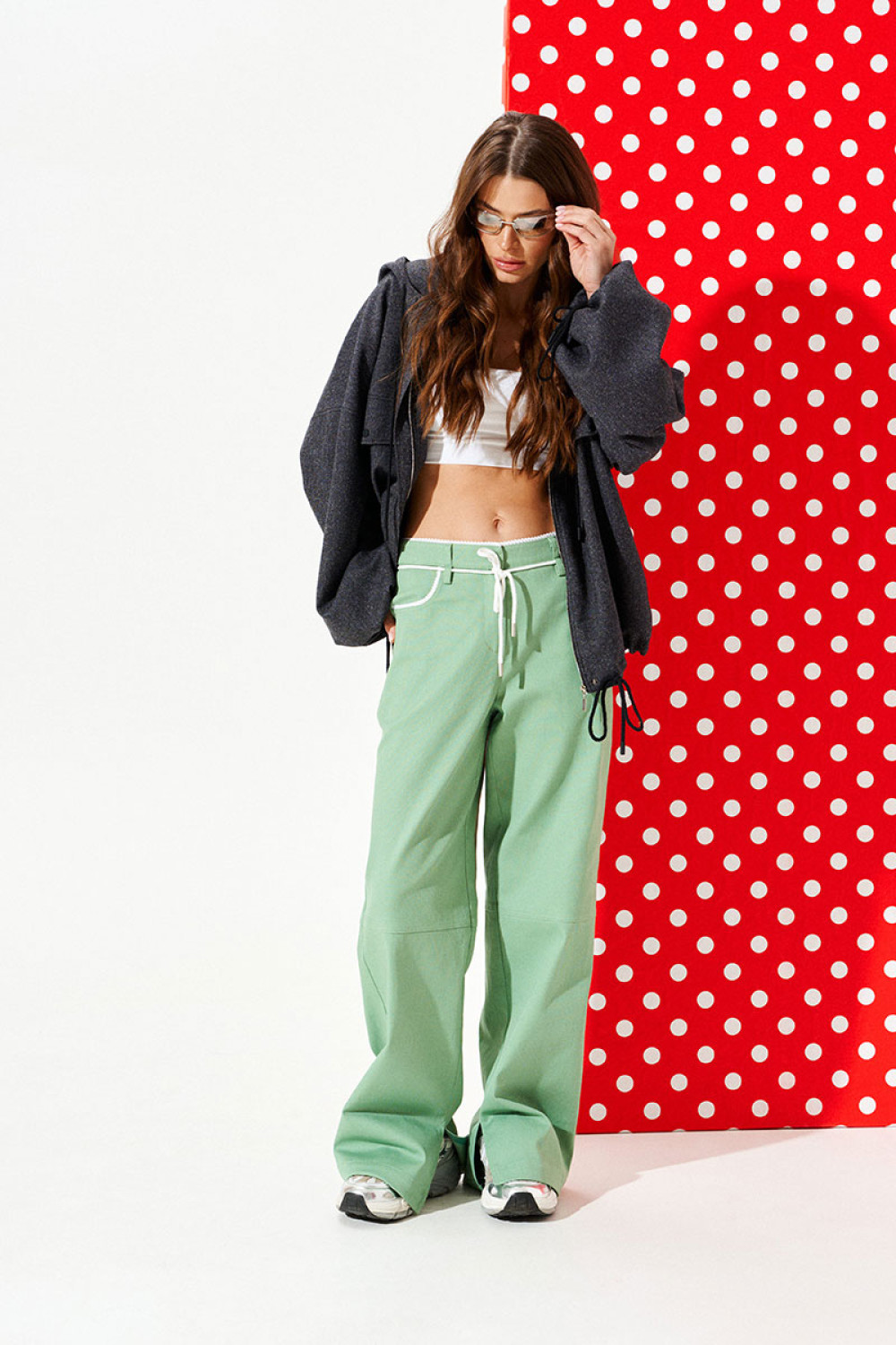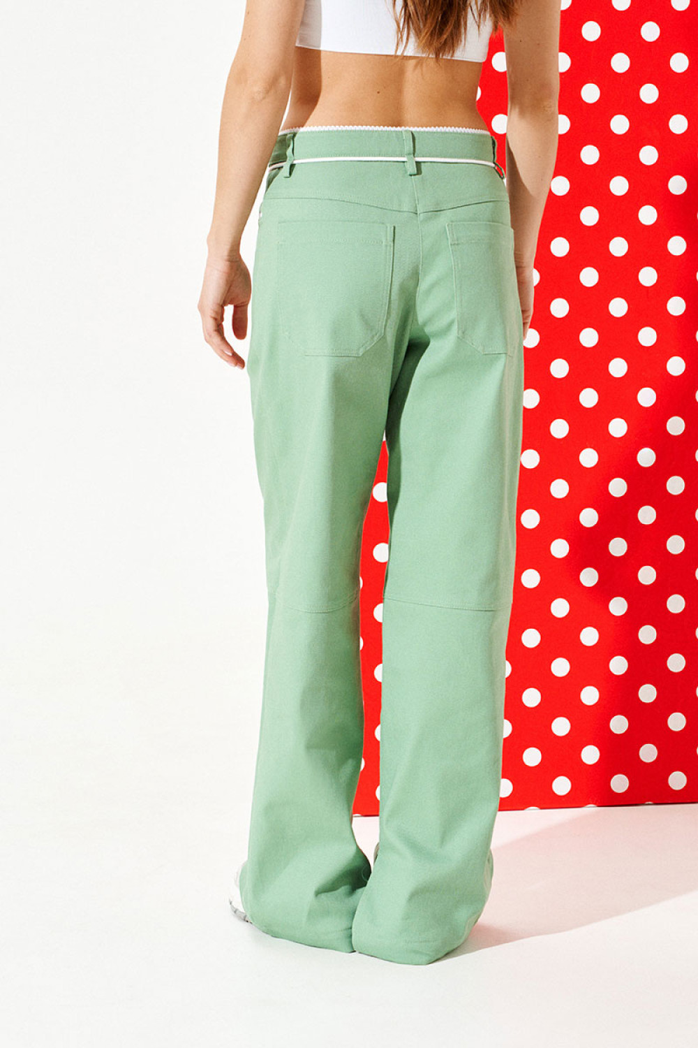 Брюки свободного объема, прямого силуэта. Застежка-гульфик на молнии. На передних половинках карманы с отрезной боковой частью. Задние половинки с притачной кокеткой и накладными карманами. Детали переда и спинки с горизонтальными подрезами на уровне колен. Пояс притачной, с застежкой на 1 обметанную петлю и пуговицу. Пояс с двойными шлевками. В шлевки продет декоративный шнур с наконечниками. Пояс и карманы на передних половинках брюк оформлены тесьмой из кружева.