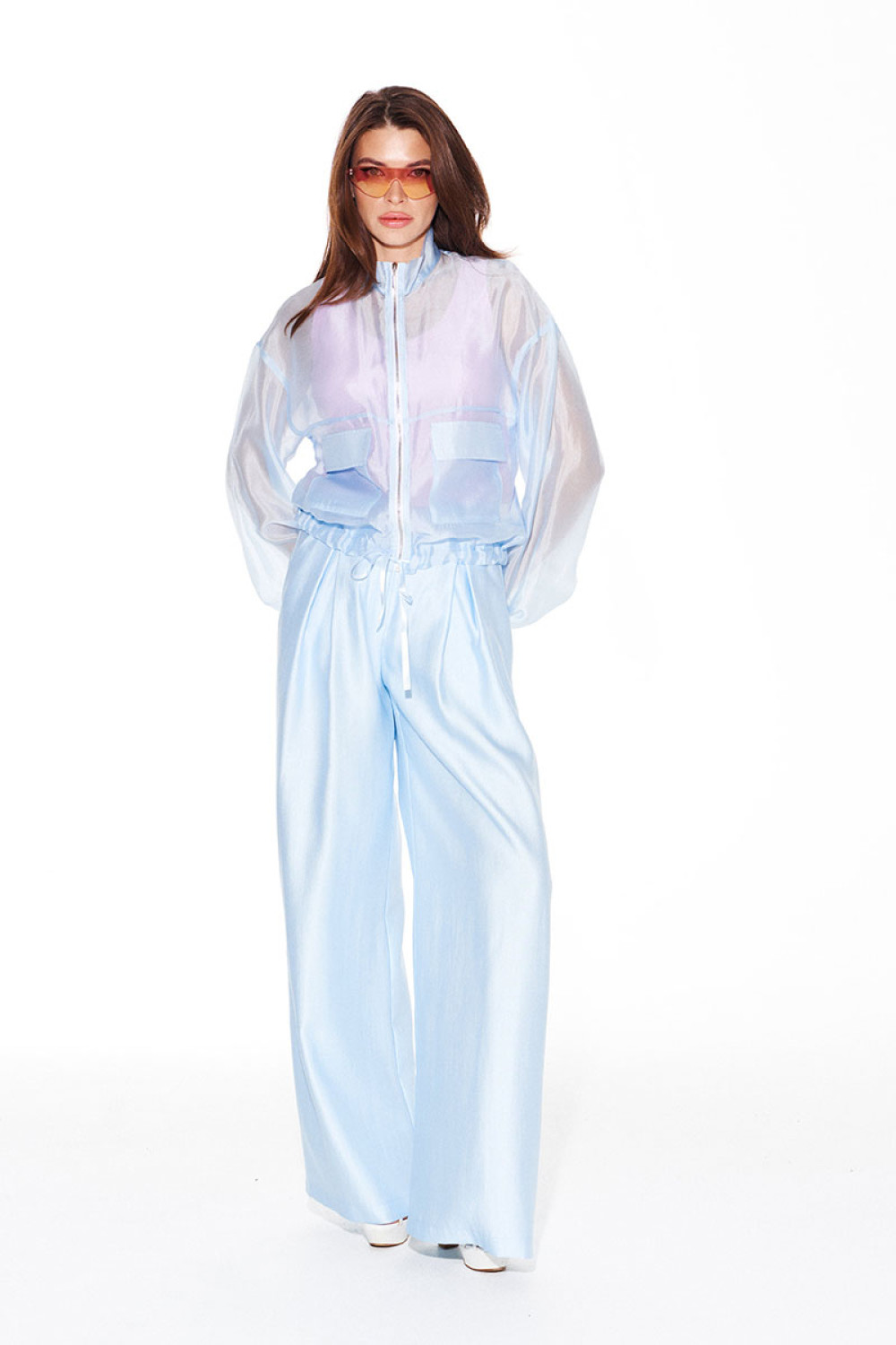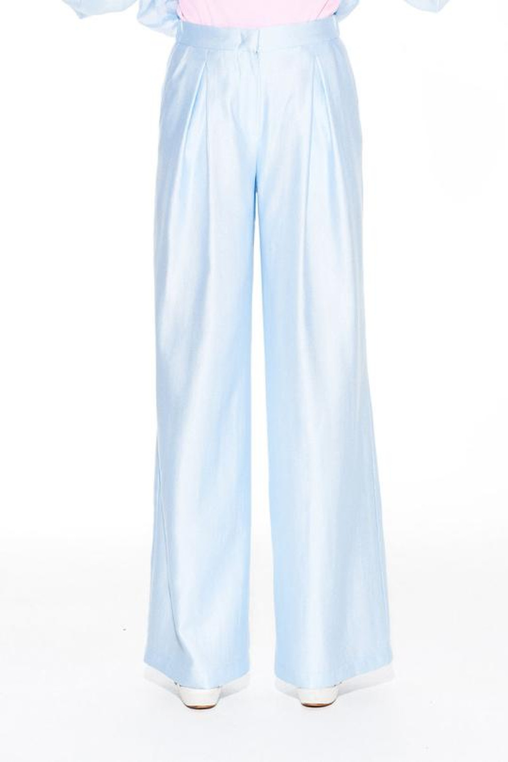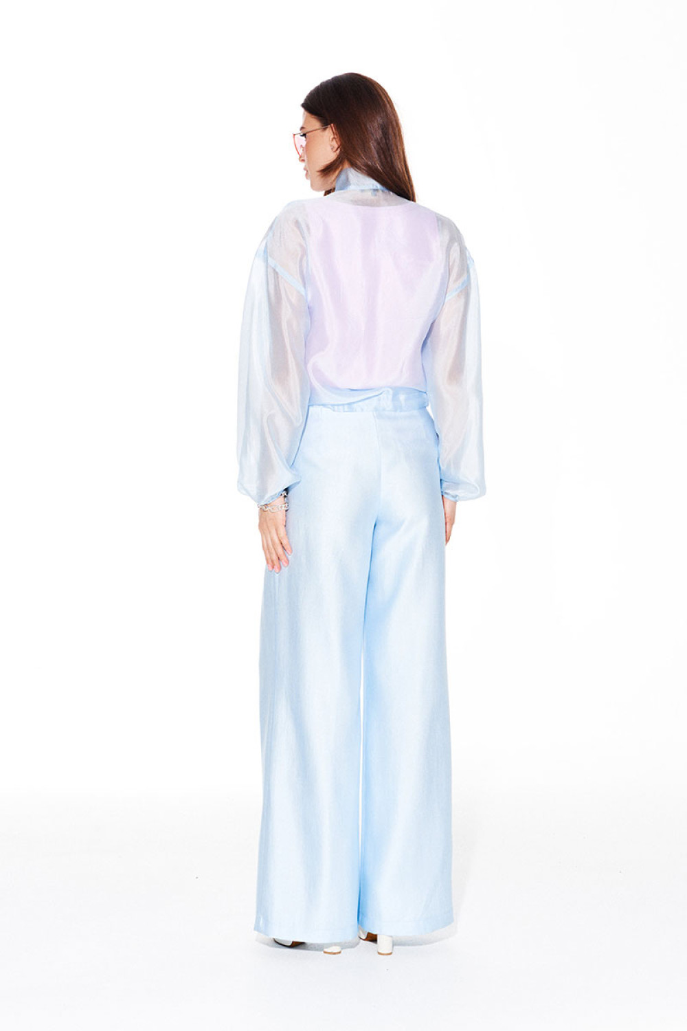 Брюки свободного объема, расширенные книзу. На передних половинках выполнены боковые карманы с отрезным бочком и встречные складки. На задних половинках талиевые вытачки. Застежка – гульфик на молнии. Пояс притачной, с резинкой по спинке, застежкой на крючок и потайную пуговицу.