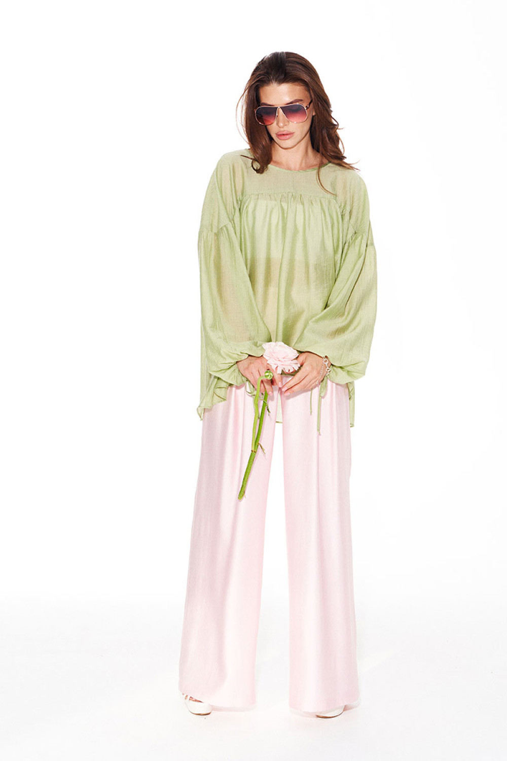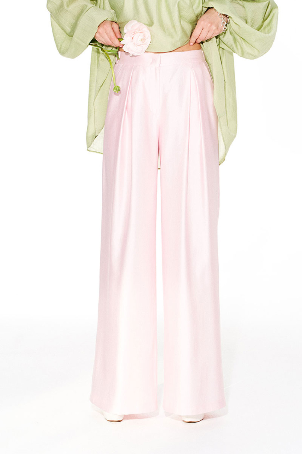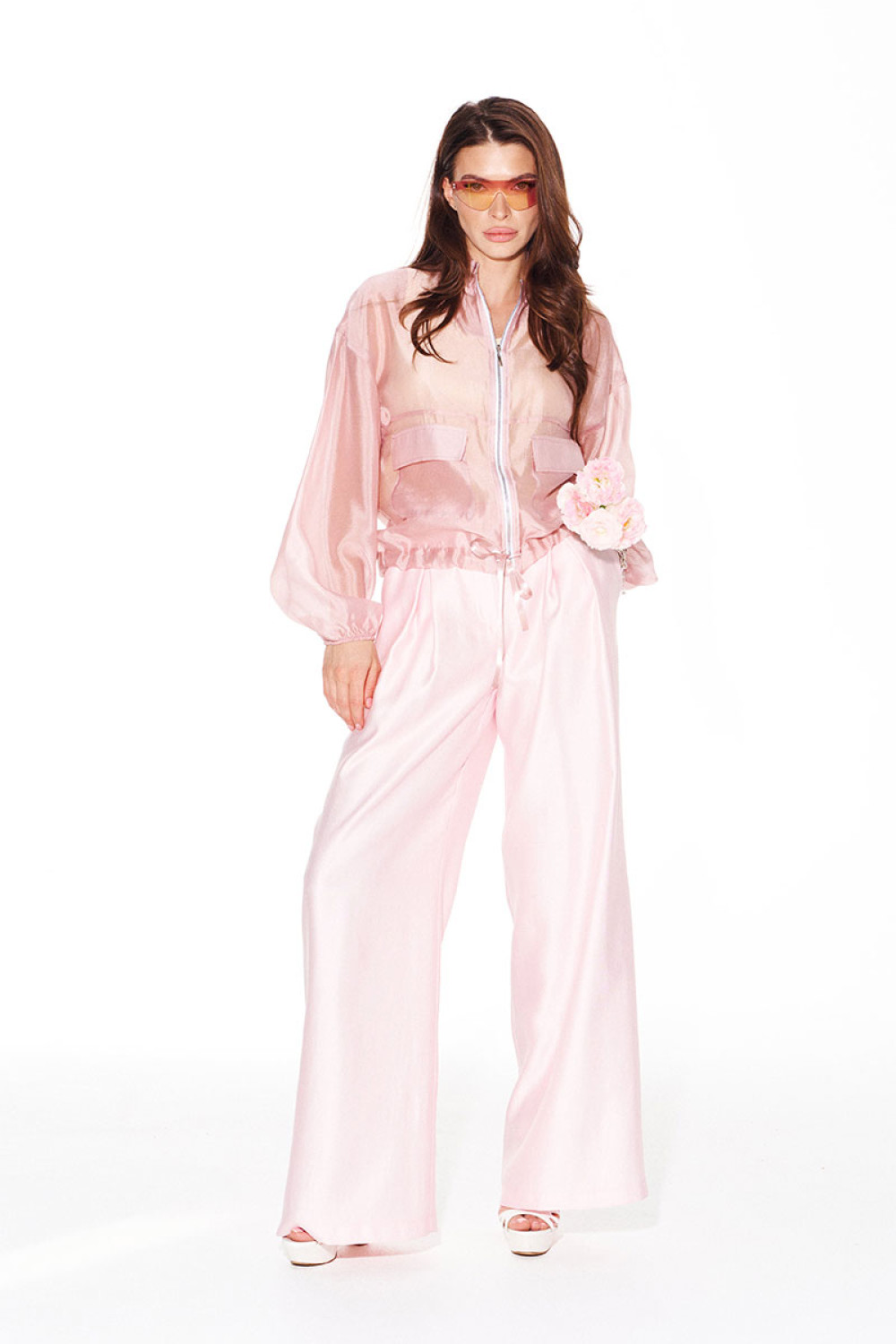 Брюки свободного объема, расширенные книзу. На передних половинках выполнены боковые карманы с отрезным бочком и встречные складки. На задних половинках талиевые вытачки. Застежка – гульфик на молнии. Пояс притачной, с резинкой по спинке, застежкой на крючок и потайную пуговицу.
