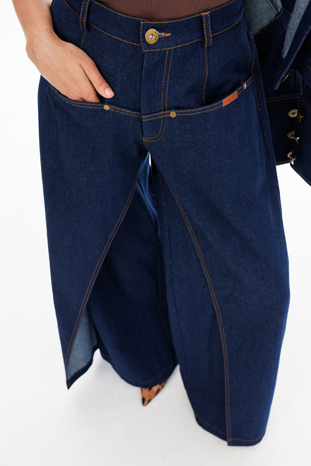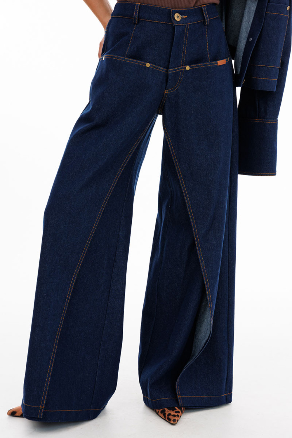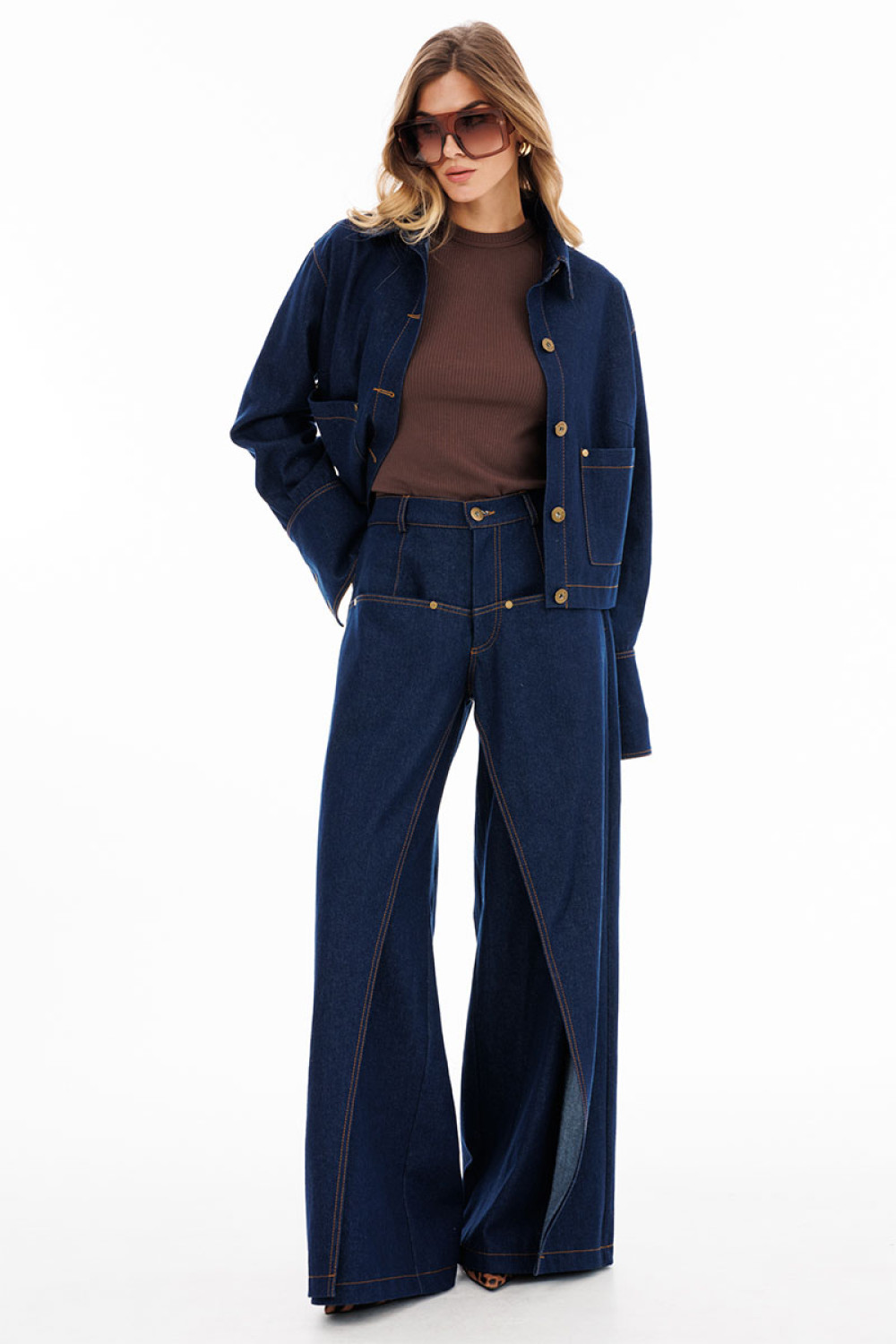 Брюки выполнены из плотного джинса. Брюки на притачном поясе, длиной до пола, расширенные к низу. Спереди верхние отлетные части, боковые карманы с фигурным входом. Застежка на пуговицу и молнию с гульфиком. На задних частях кокетки и накладные карманы. По переду брюки декорированы брендированной нашивкой из натуральной кожи.