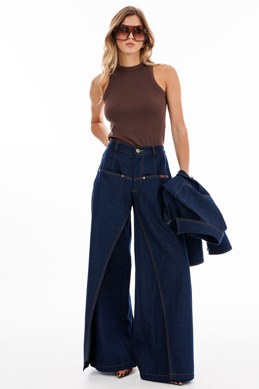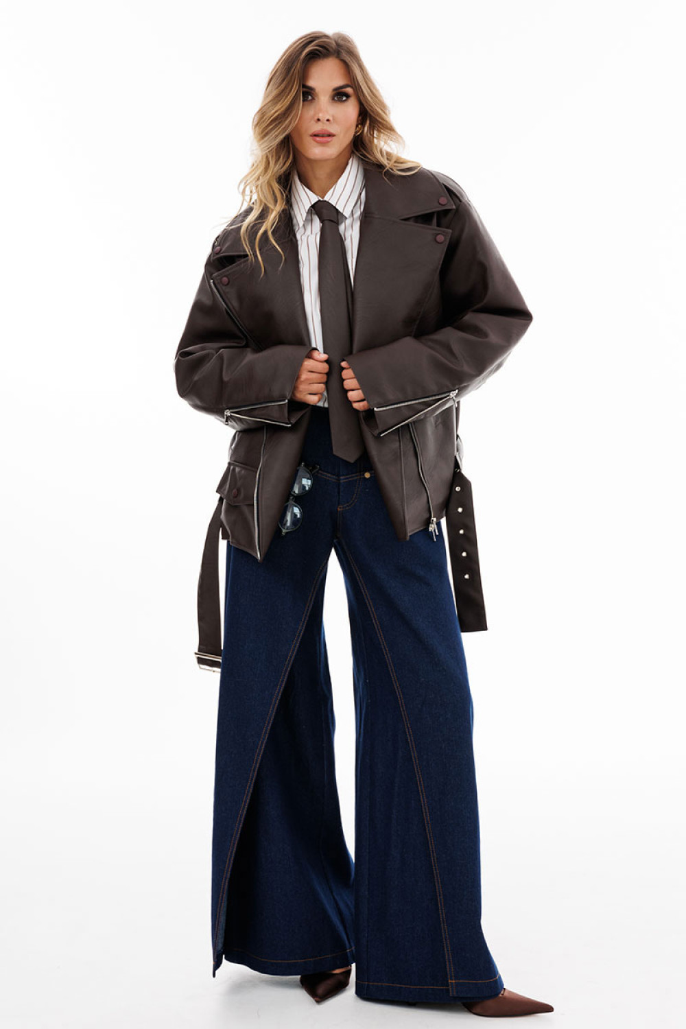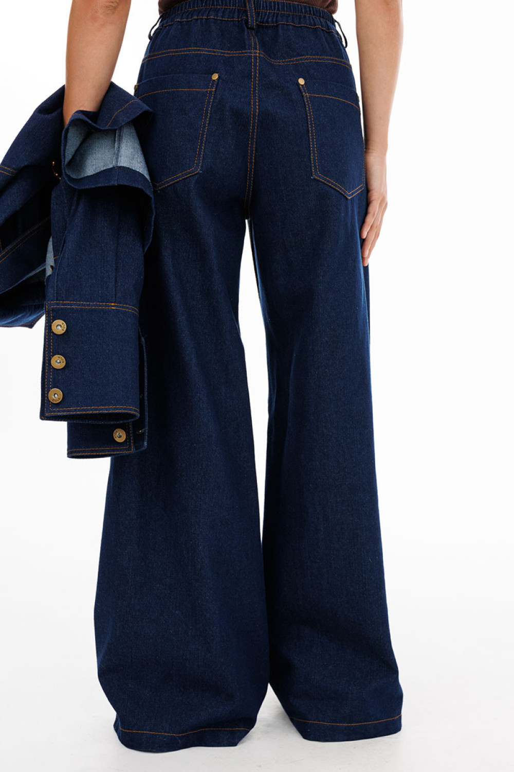 Брюки выполнены из плотного джинса. Брюки на притачном поясе, длиной до пола, расширенные к низу. Спереди верхние отлетные части, боковые карманы с фигурным входом. Застежка на пуговицу и молнию с гульфиком. На задних частях кокетки и накладные карманы. По переду брюки декорированы брендированной нашивкой из натуральной кожи.