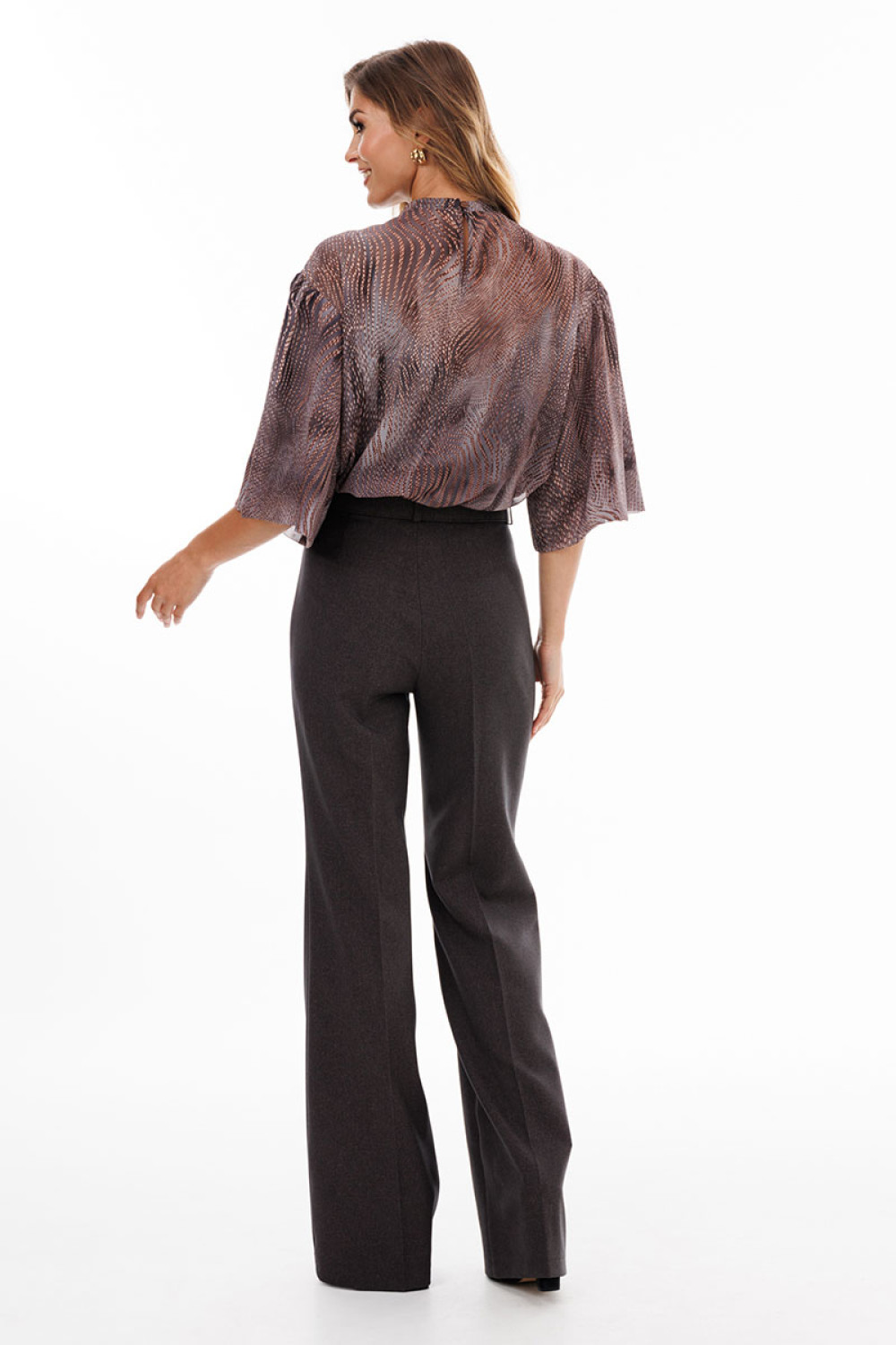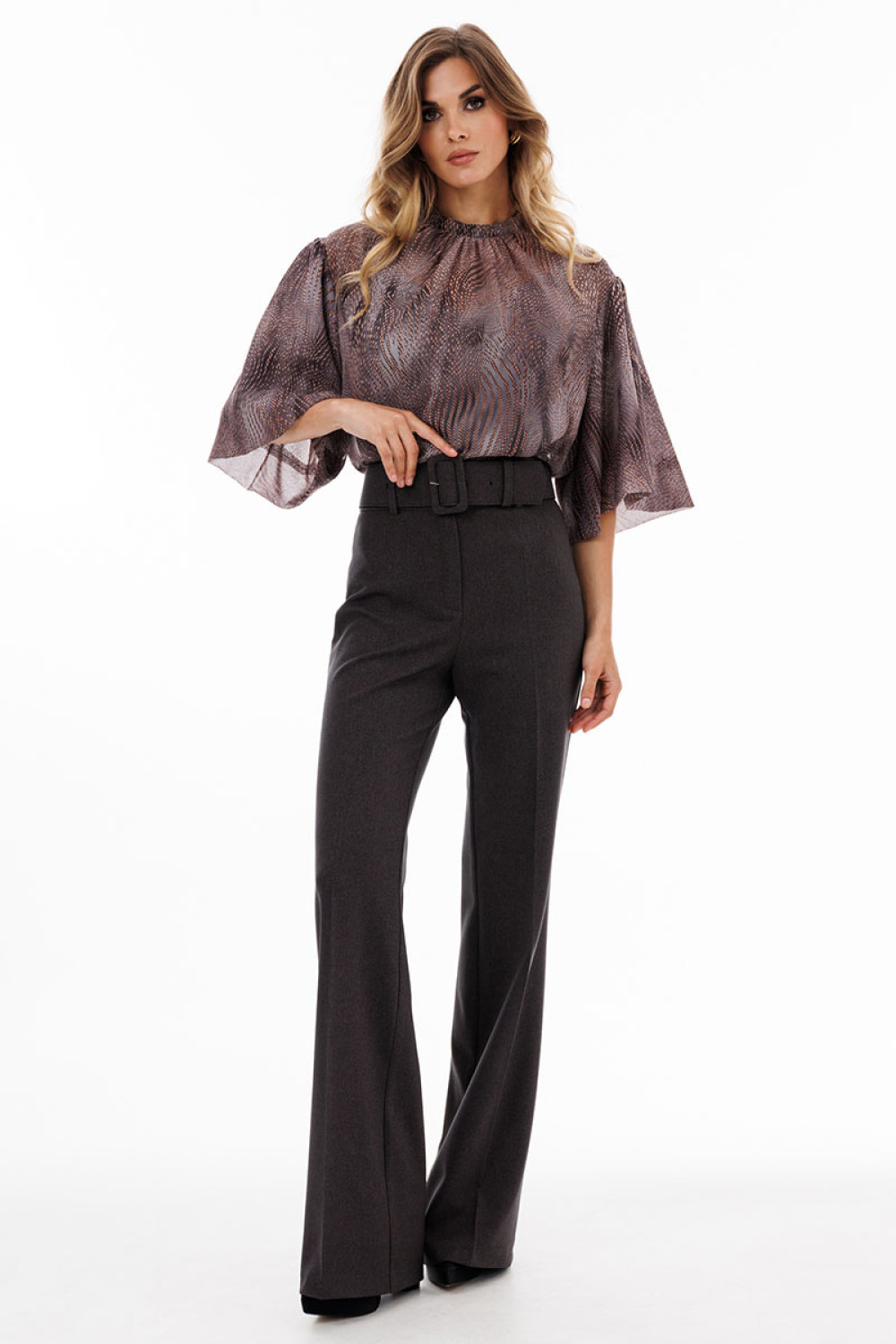 Брюки выполнены из костюмной ткани. Брюки покроя "клеш", на притачном поясе, длиной в пол. Спереди застежка на молнию с гульфиком, потайную пуговицу и два брючных крючка. Передние и задние части брюк заутюжены на кант. В комплект входит съемный пояс из основной ткани.