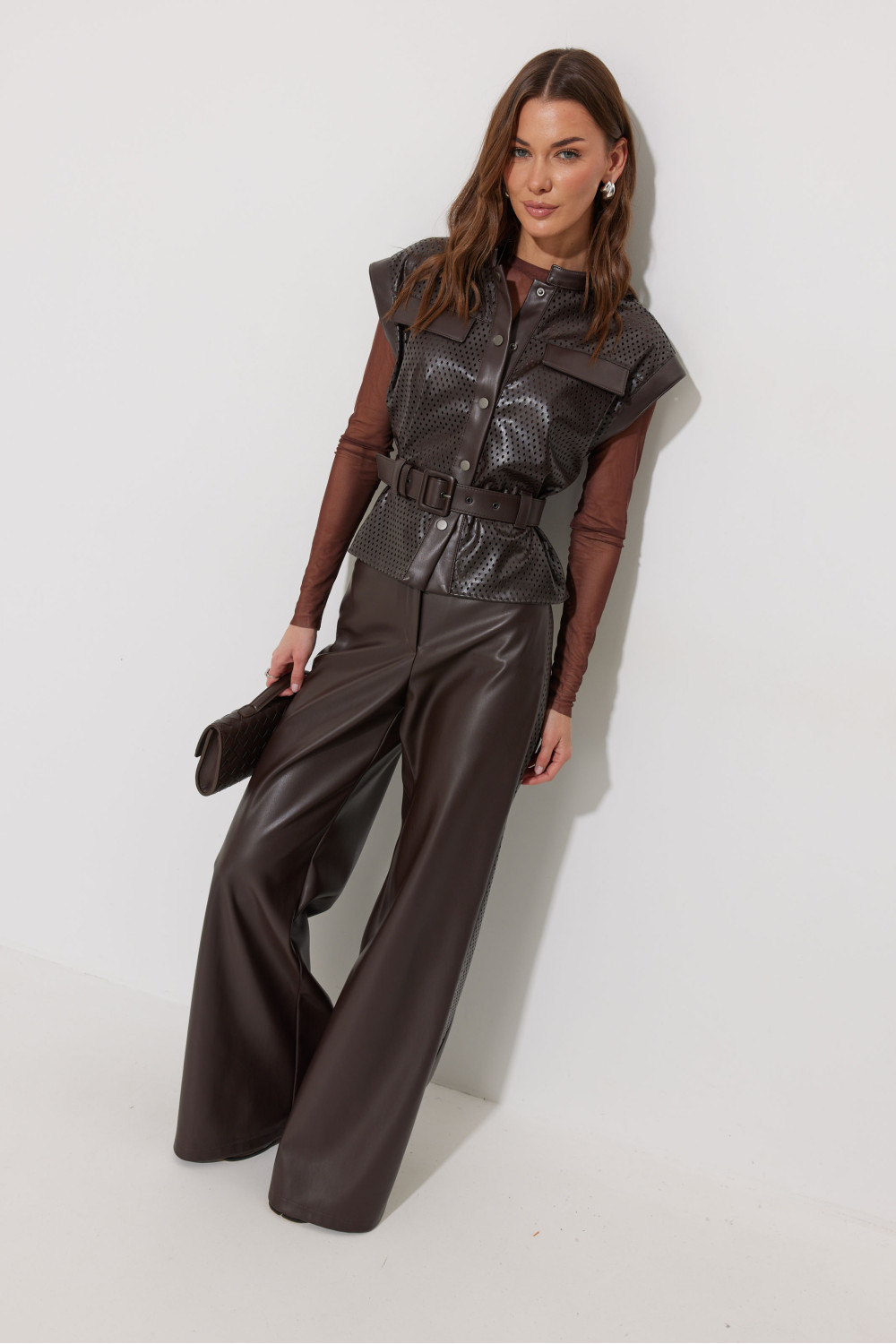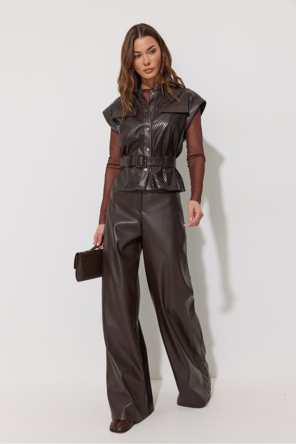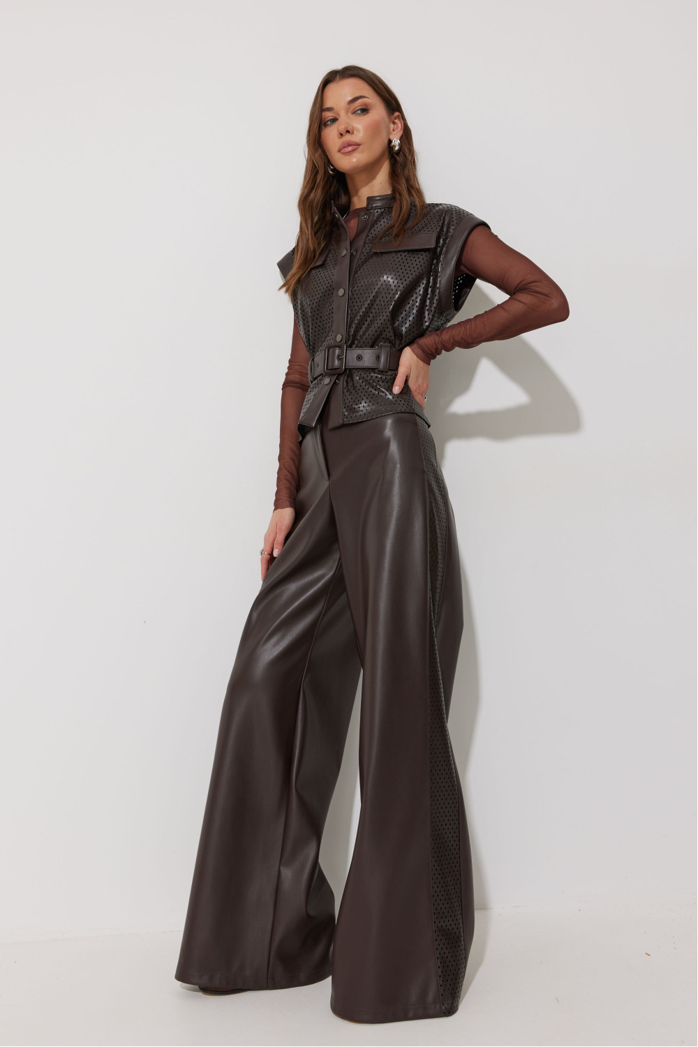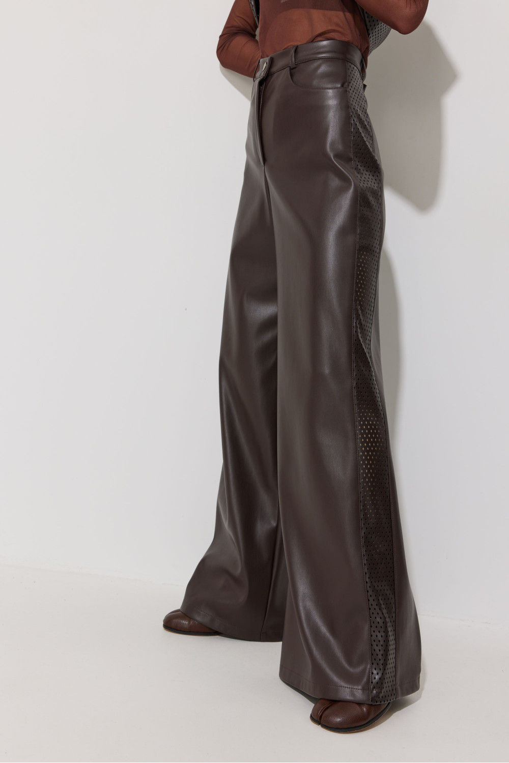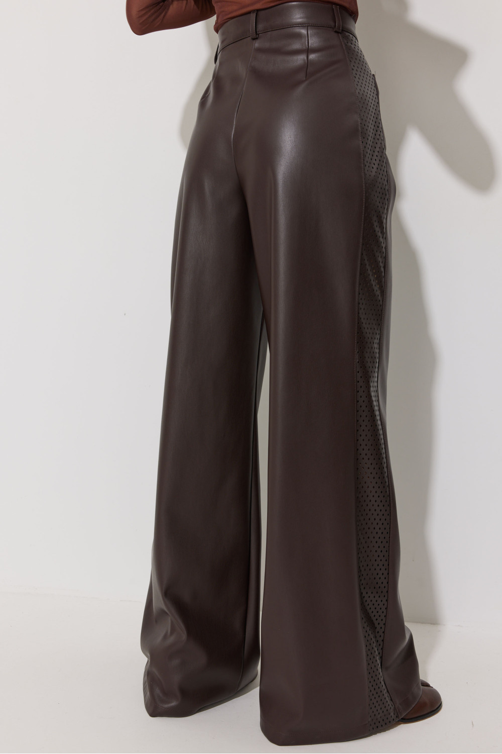 Брюки прямого силуэта расширенные книзу из экокожи. По верху притачной пояс с застежкой на петлю и пуговицу и шлевками для ремня. На передних половинках обработаны карманы и застежка молния в среднем шве. По поясу задних половинок брюк резинка. По бокам брюк вставка из отделочной ткани. Обращаем ваше внимание, что фурнитура может отличаться от фото.