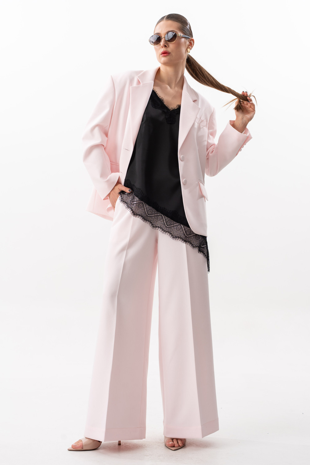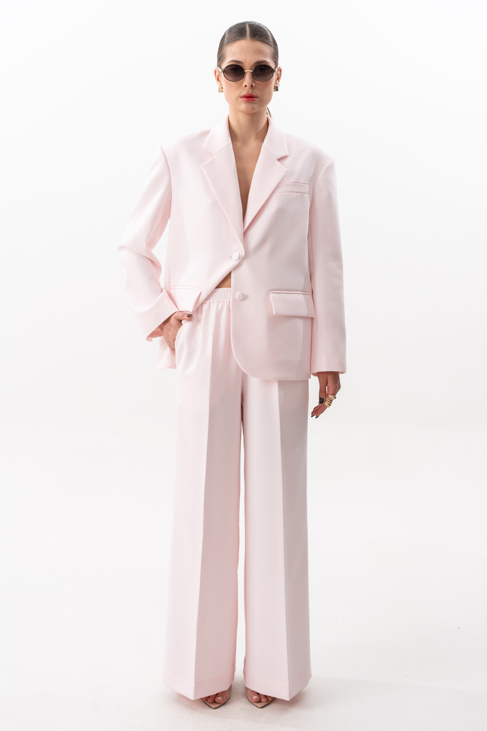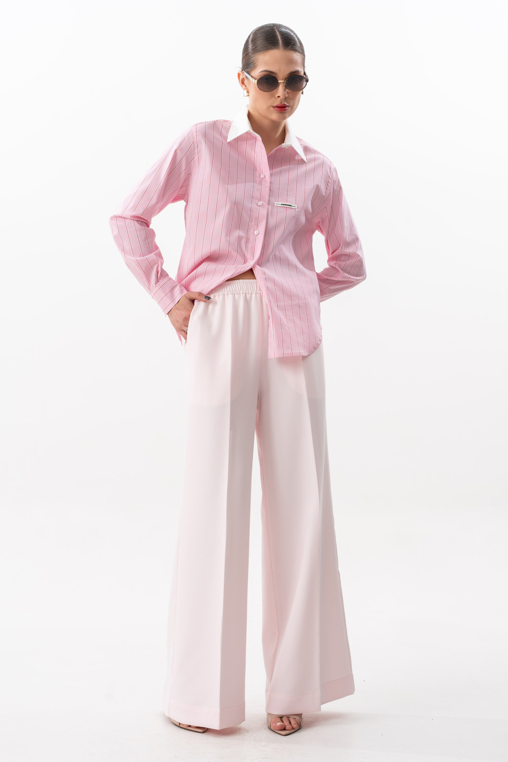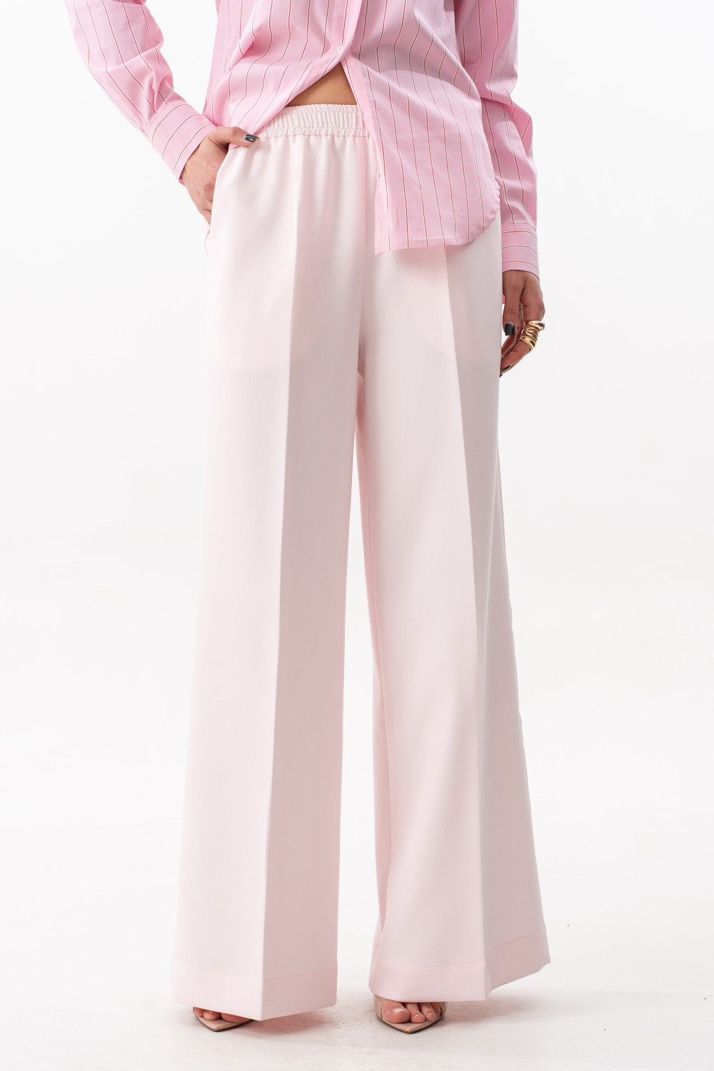 Брюки прямого свободного силуэта. Пояс на резинке, по переду боковые наклонные карманы.Длина брюк по боковому шву с поясом 108 см.