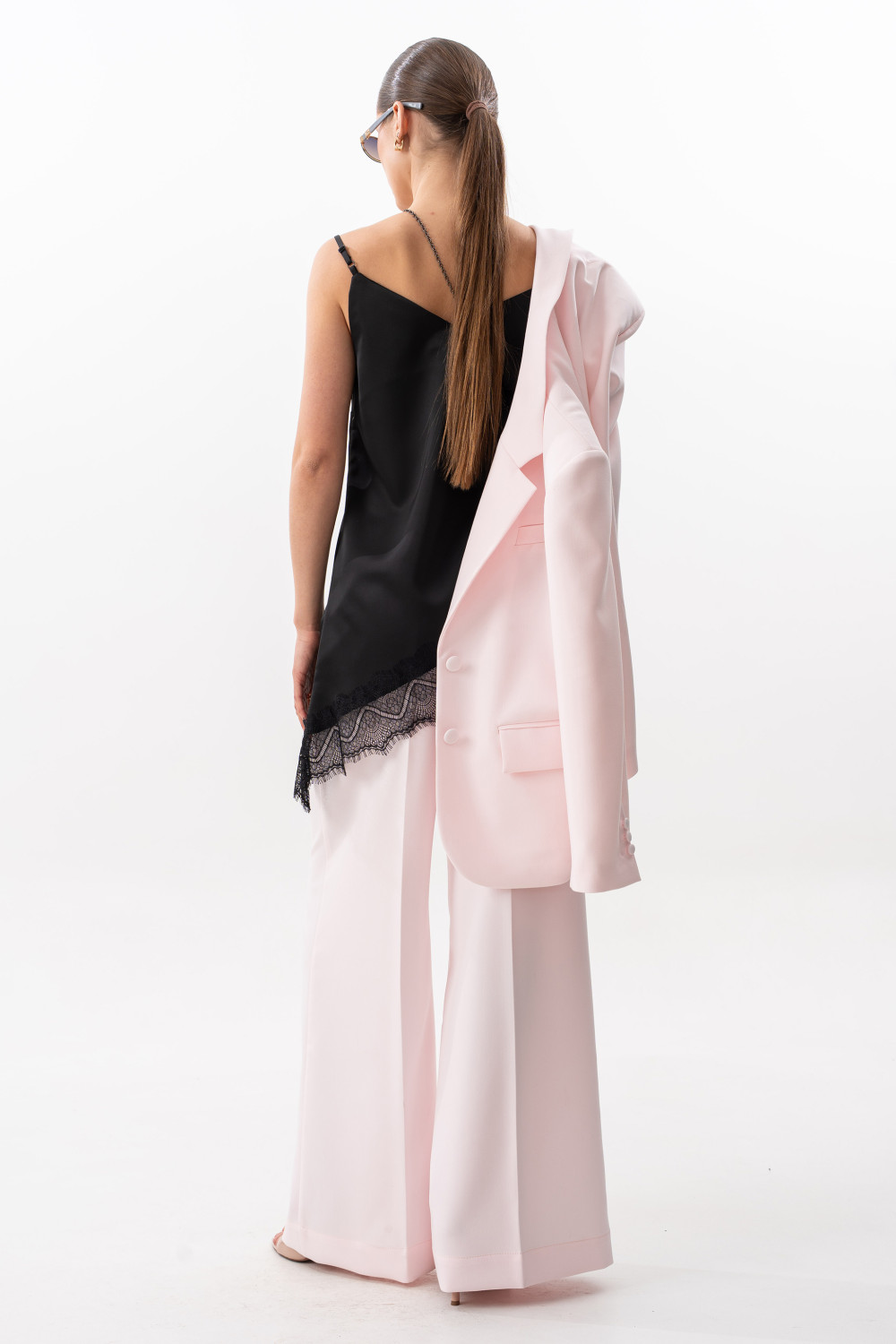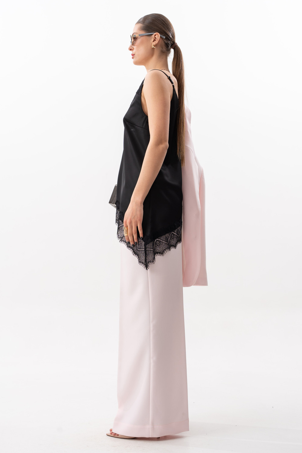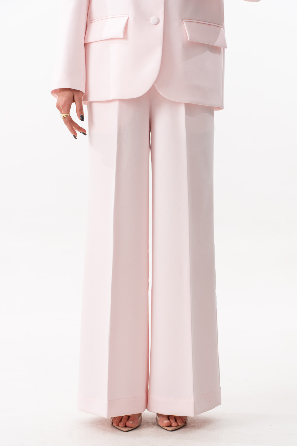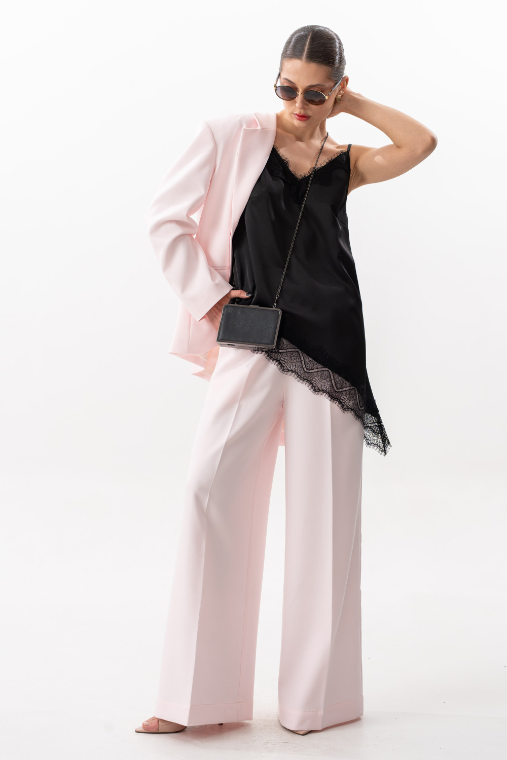 Брюки прямого свободного силуэта. Пояс на резинке, по переду боковые наклонные карманы.Длина брюк по боковому шву с поясом 108 см.