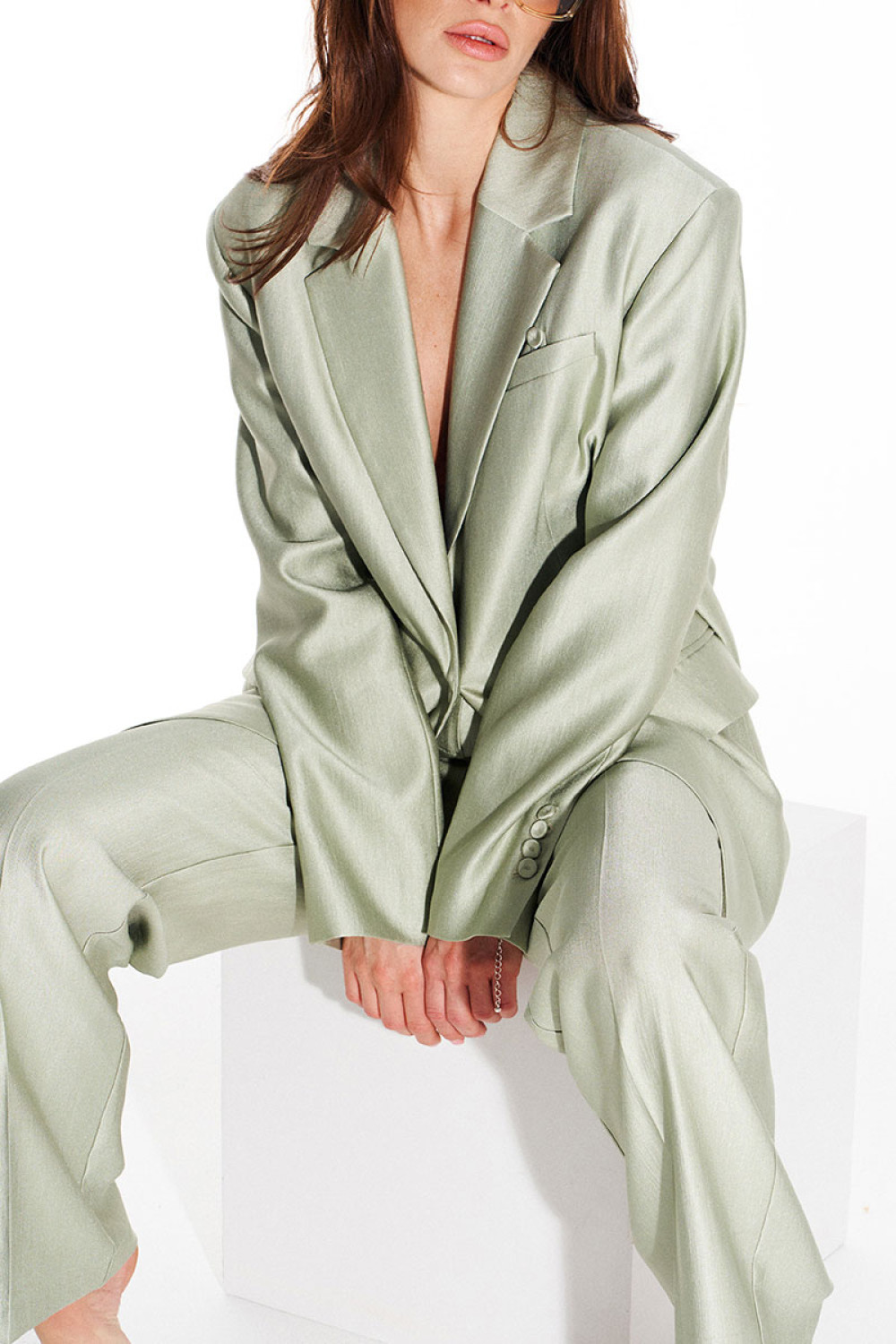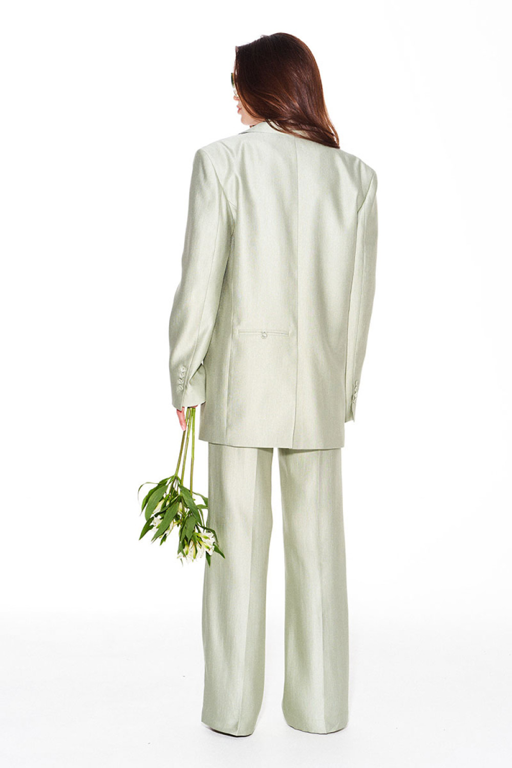 Жакет свободного объема, прямого силуэта, с центральной застежкой на 1 петлю и 1 пуговицу, отложным воротником и лацканами пиджачного типа, на подкладке. Детали переда с талиевыми вытачками, отрезными бочками и прорезными карманами с клапанами и двумя обтачками. На левой полочке — нагрудный карман с листочкой. Спинка со средним швом, отрезными бочками и шлицей. На левой детали спинки выполнен декоративный карман с двумя обтачками. Рукав втачной, двухшовный, длинный. В локтевых швах — функциональные шлицы, застегивающиеся на 4 петли и 4 пуговицы.