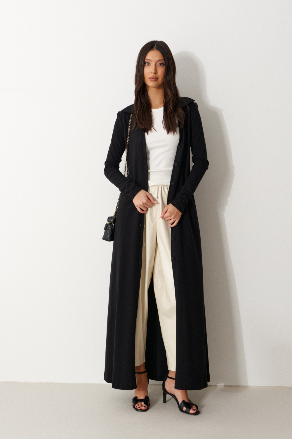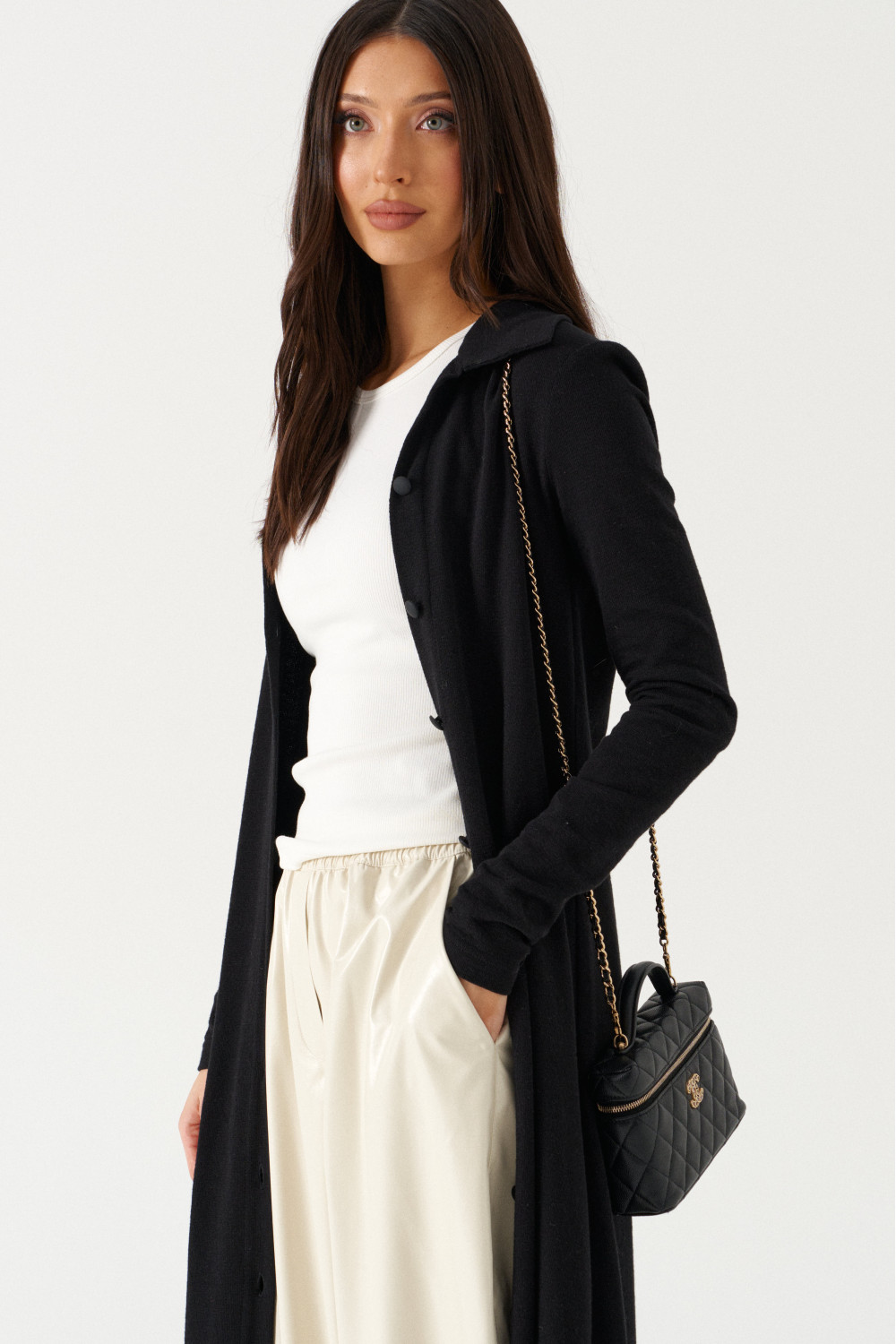 Джемпер удлиненный свободного кроя, выполнен из трикотажа черного цвета. Характеристика: свободный крой, расширение к низу, отложной воротник, застежка центральная на пуговицы, цельнокройная спинка, рукав вточной.
