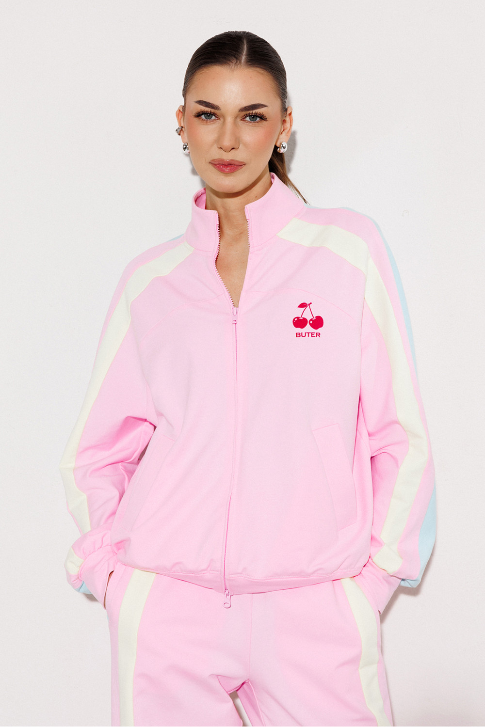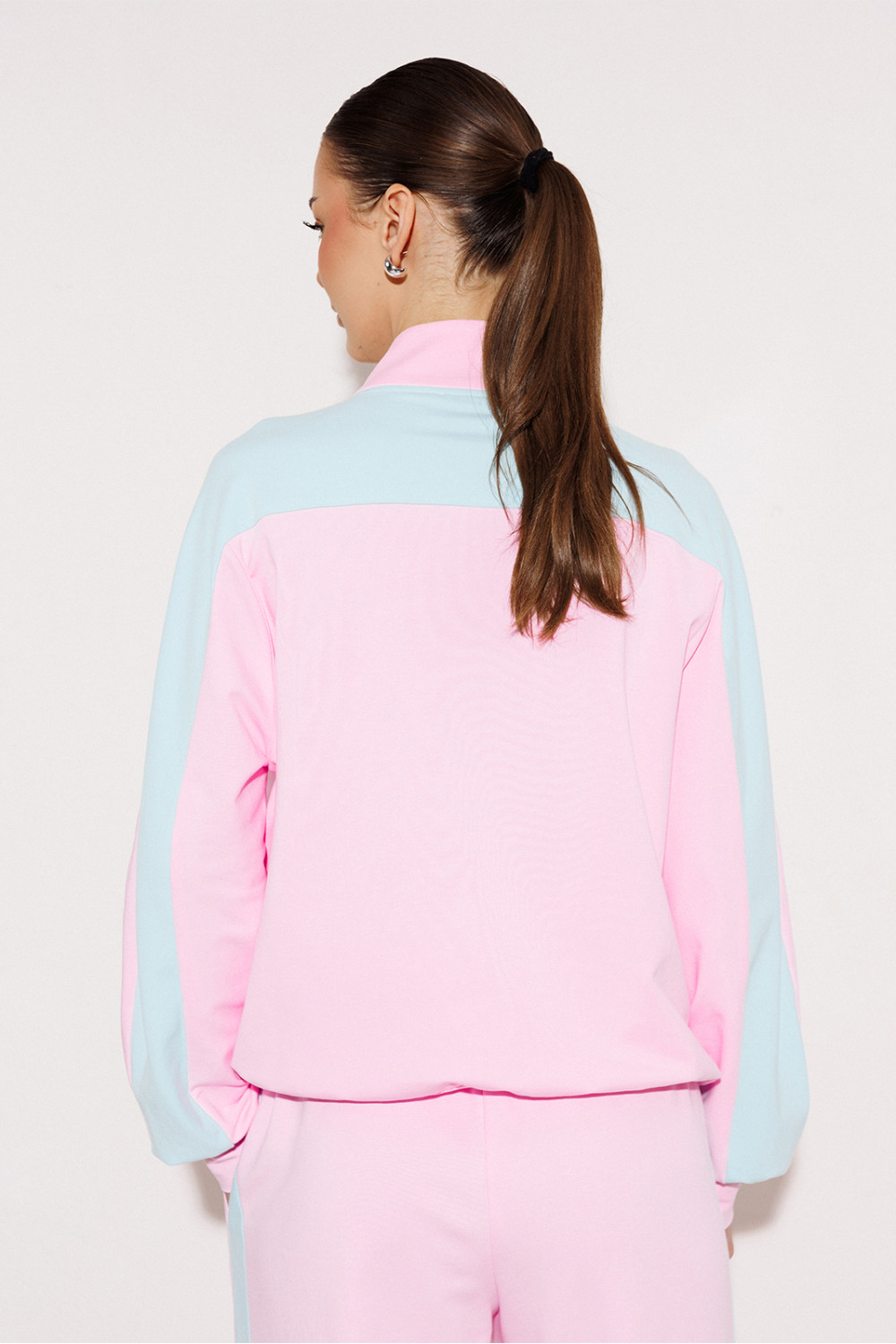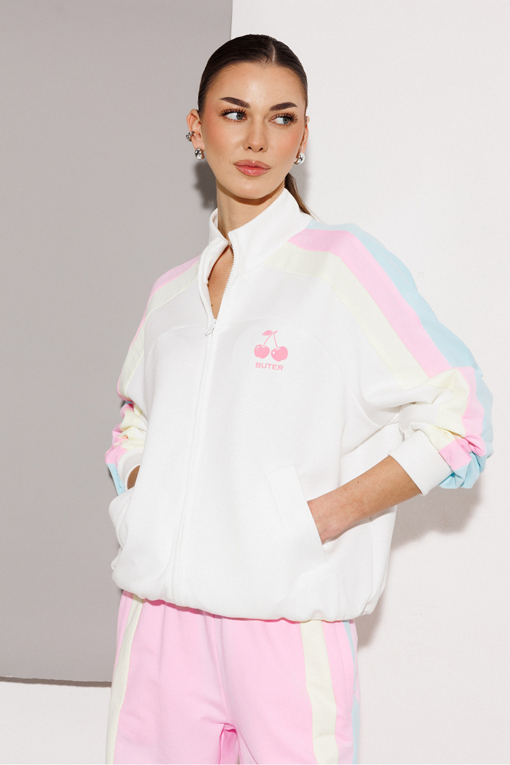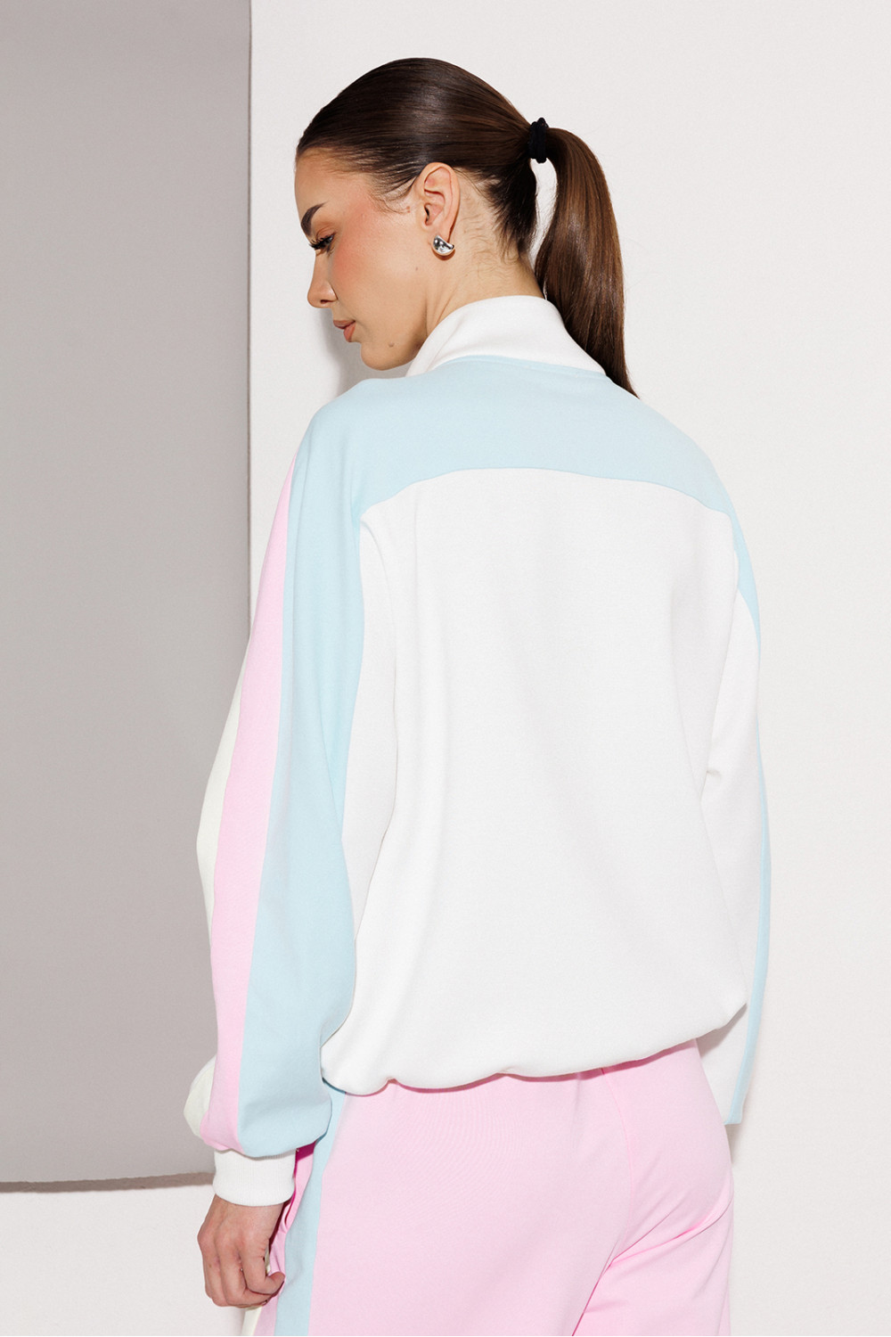 Джемпер мультиколор из технологичного трикотажного полотна с эффектом peach прямого силуэта. По полочке рукав-реглан, по спинке-втачной. Рукав с лампасами из ткани другого цвета с манжетой по низу рукава. Полочка с центральной застежкой на тесьму-молнию, карманом-листочкой и печатью "Cherry". По переду рукав переходит в кокетку. По спинке один из лампасов переходит в кокетку. По горловине воротник-стойка. По низу изделия притачная планка.