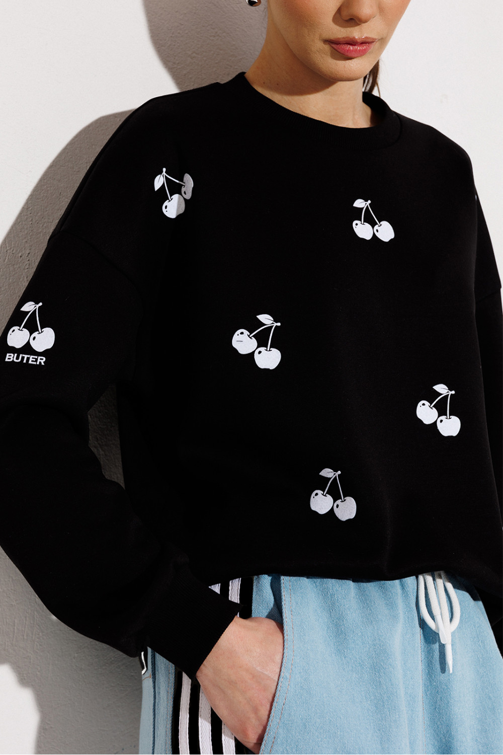 Джемпер из технологичного трикотажного полотна с эффектом peach. Прямого силуэта с втачным рукавом и спущенной линией плеча, с манжетой из отделочной ткани по низу рукава. По переду и на рукаве печать "CHERRY". По горловине и низу изделия притачная планка из отделочной ткани.